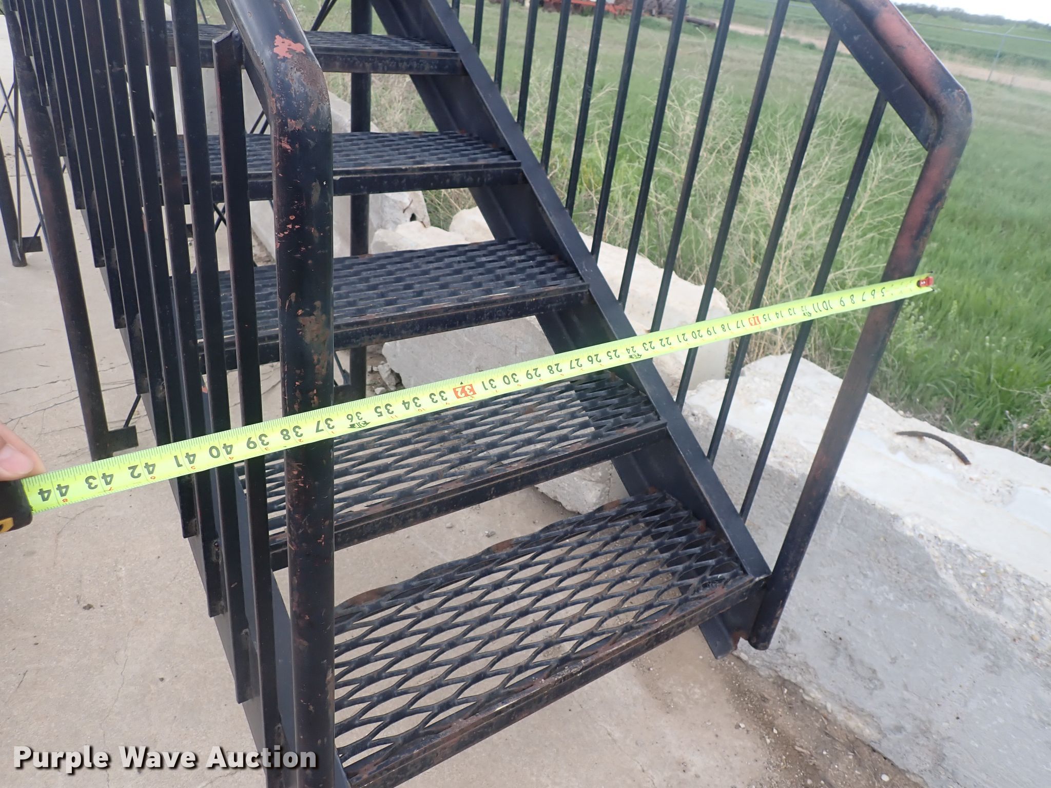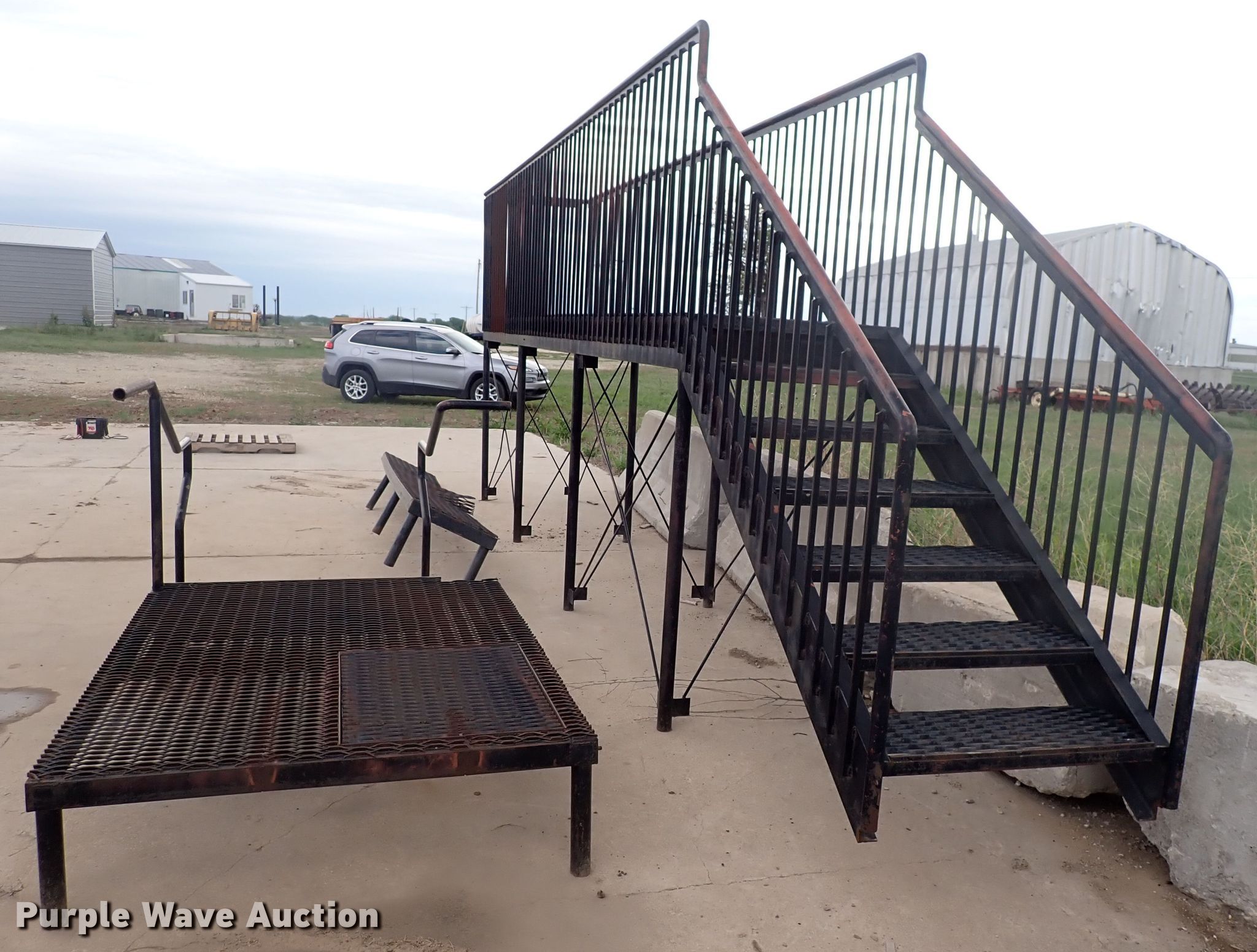 Purple Wave is selling a used Building Materials in Kansas. This item is a Steel catwalk with the following: 19' x 36" x 66" walkway, 82" x 58" platform, 106"H top rail, 15'5" x 22" side rail, 80"H stairs