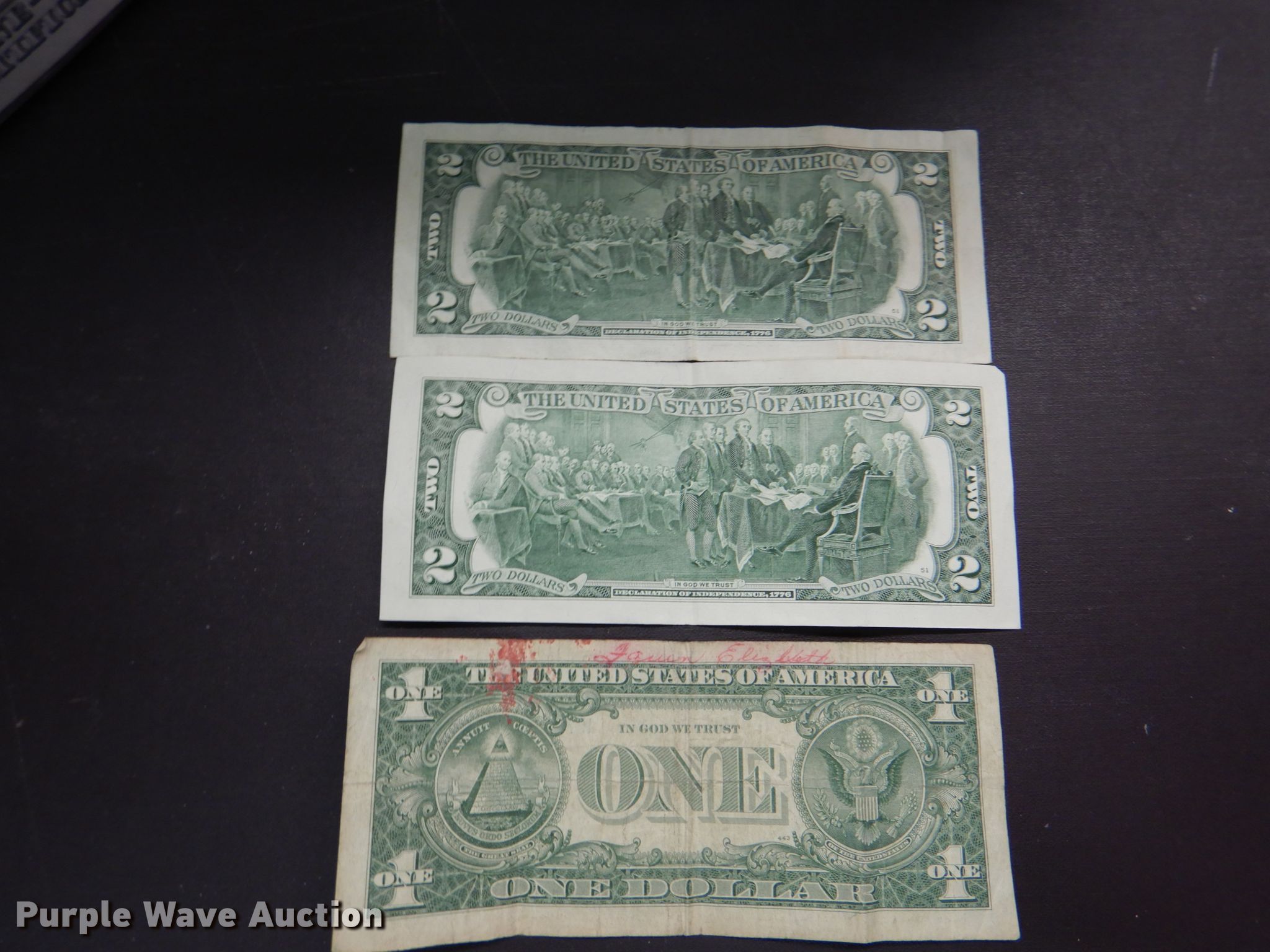 Purple Wave is selling a used All Other Household Items in Oklahoma. This item is a 20th Century one-dollar silver certificates with the following: 1957D silver certificate, (2) 2013 series two dollar bills, Unit# 1010