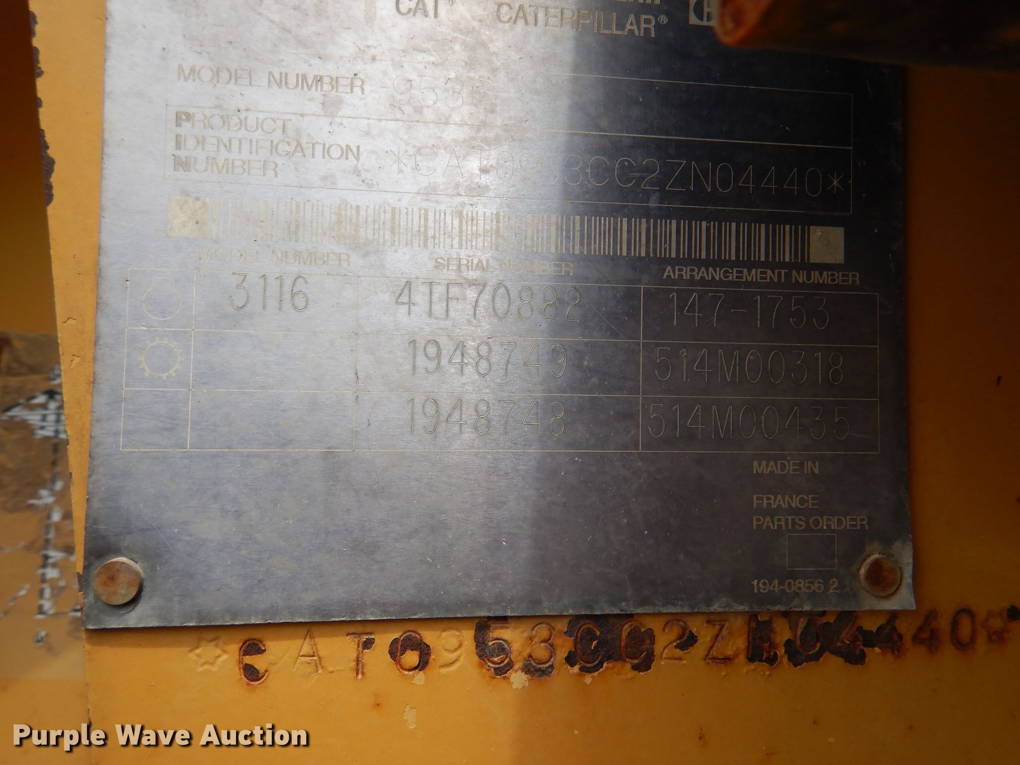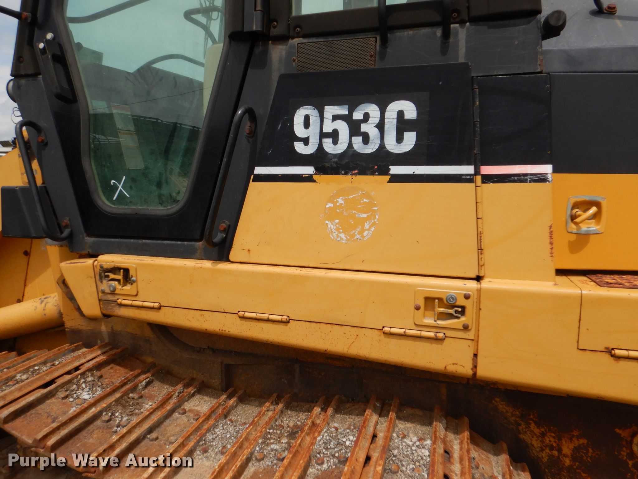 Caterpillar 953C track loader. 3,065 hours on meter, Serial: CAT0953CC2ZN04440, Unit #: 4810. Engine Caterpillar 3116, Cylinders: 6, Fuel type: Diesel. Transmission Hydrostatic. Operators station Enclosed cab, AC, Heat, Bucket controls: Two-lever. Operational Bucket Width: 96", Cutting edge: Bolt-on, Teeth: 8. Tracks Width: 20", Grouser pads: Double. Notes Unknown operating condition. City of Kansas City, Missouri - Open inspection June 21. 5300 Municipal. Kansas City, MO 64120