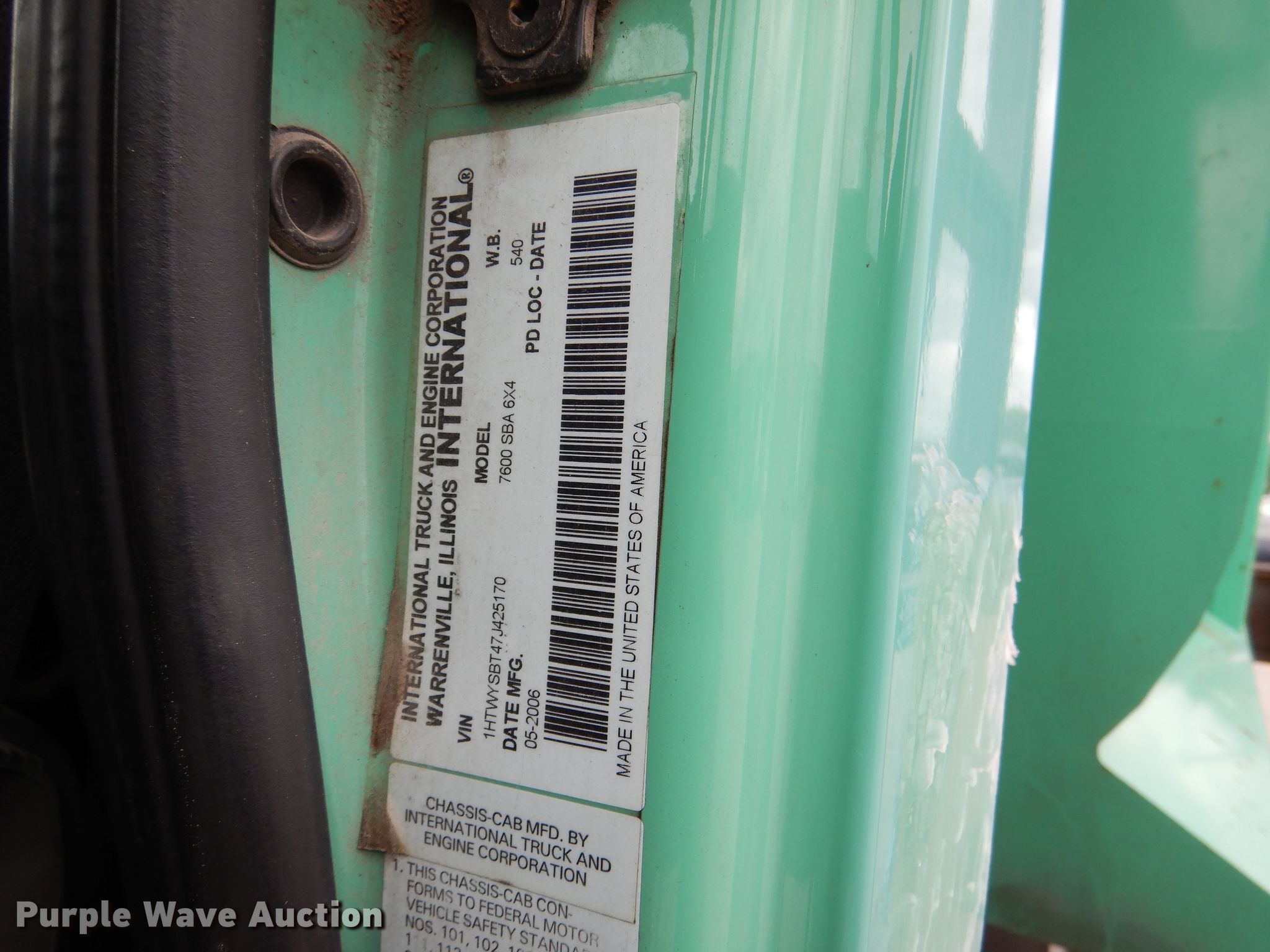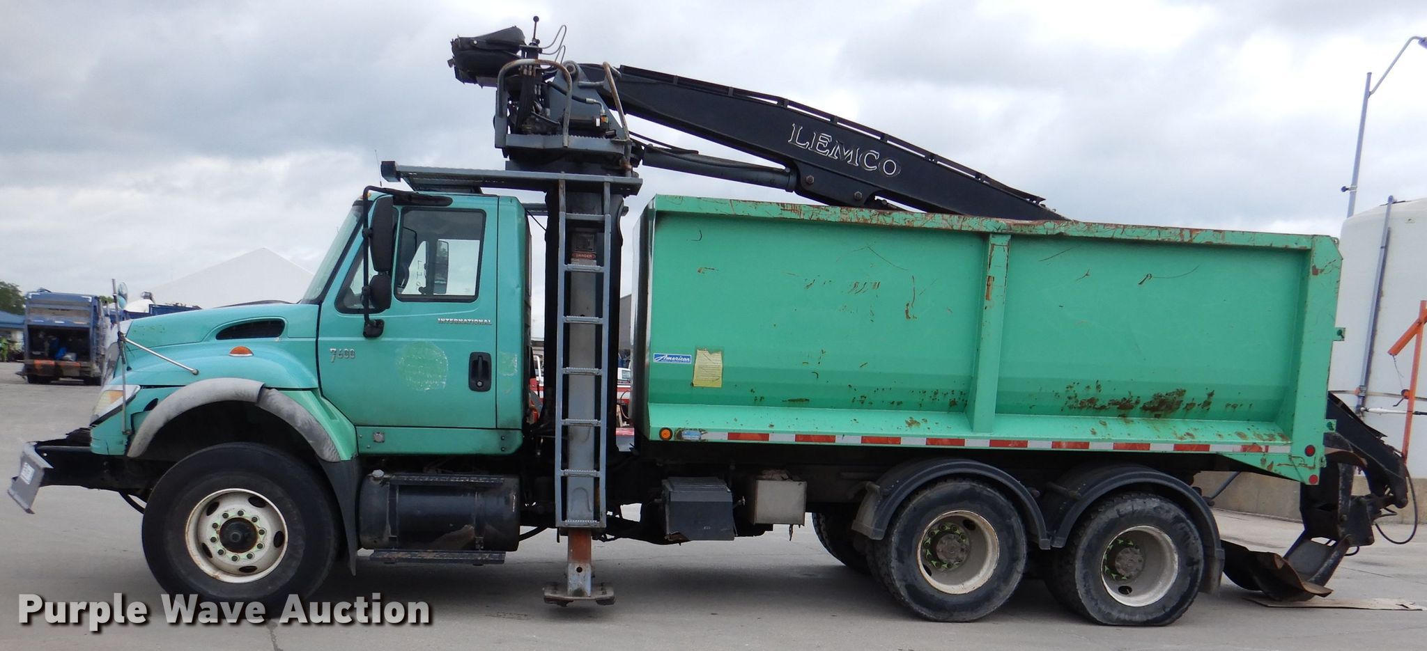2007 International 7600 crane truck. 107,304 miles on odometer, Unit #: 7491. Engine Caterpillar C13, Displacement: 12.5L, Cylinders: 6, Fuel type: Diesel. Transmission Automatic. Chassis Axles: Tandem, Suspension: Spring over walking beam, Brakes: Air, PTO, GVWR: 66,000 lbs FAWR: 20,000 lbs, IAWR: 23,000 lbs, RAWR: 23,000 lbs. Interior AC, Heat. Operational Dump bed Warren AR-16, Serial: BO57449, Length: 16', Ram: Single, Crane Lemco XLT80, Boom Knuckle, Sections: 2. Tires Front: 425/65R22.5, Rear: 11R22.5. Notes Dead batteries. Missouri title. 1HTWYSBT47J425170. City of Kansas City, Missouri - Open inspection June 21. 5300 Municipal. Kansas City, MO 64120