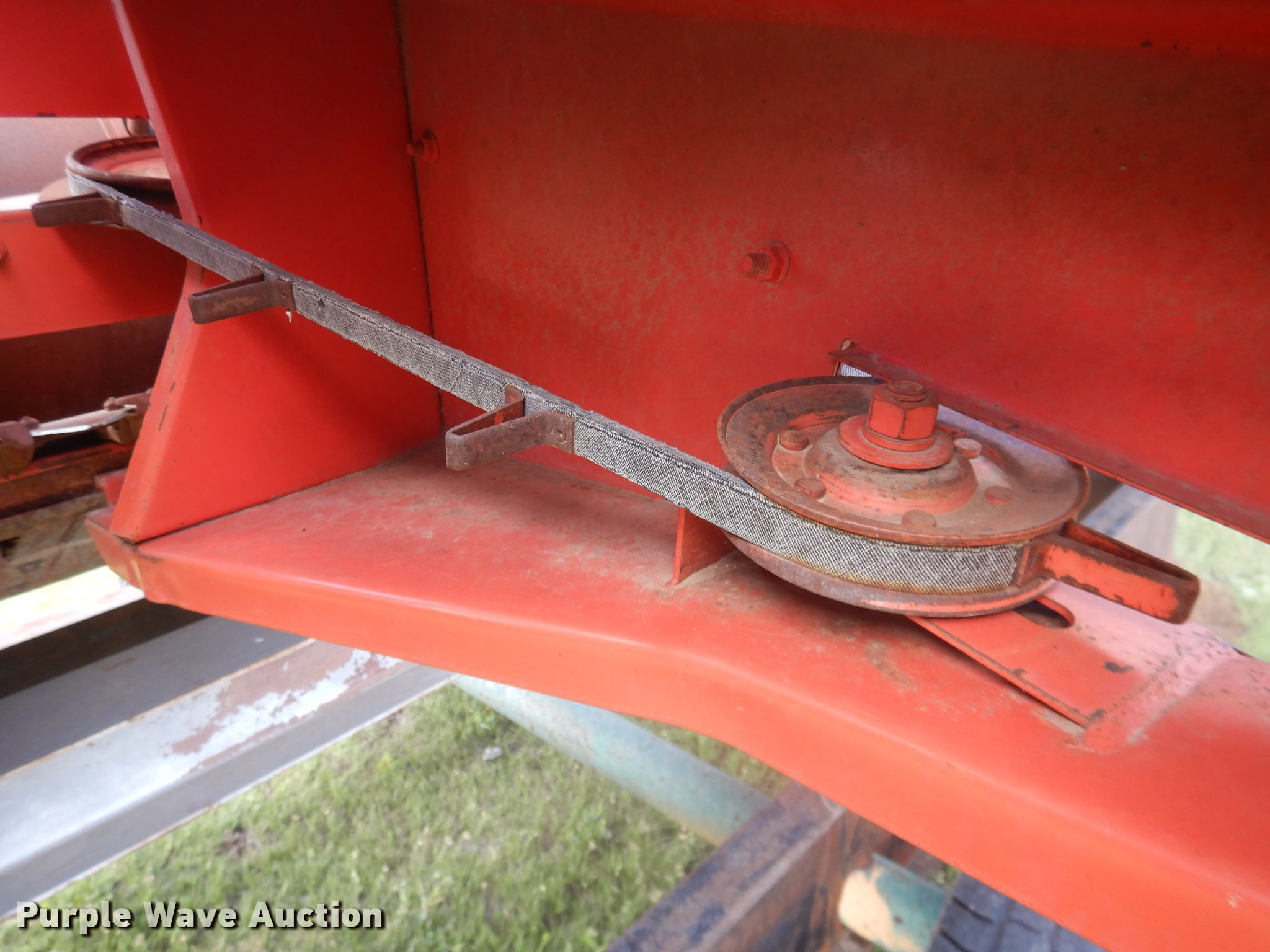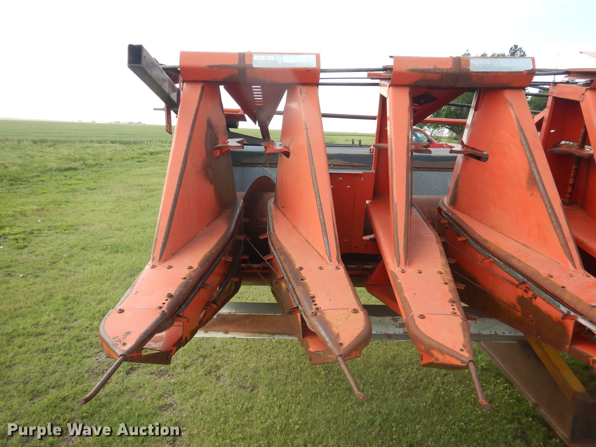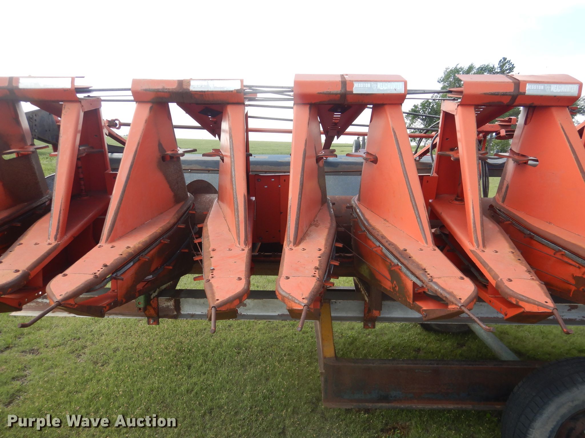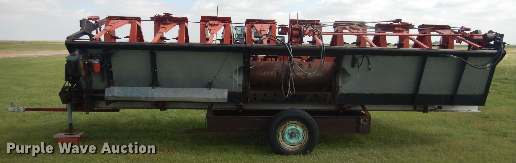 Allis Chalmers rigid head. Serial: LMG51893N-83. Operational Width: 20', Hydraulic reel height control, Hesston Headhunter row crop units Rows: 8, Row spacing: 30", Drivelines: Single. Shop built header trailer Tire size: 235/75R15. Notes Unknown operating condition. Achin' Acres LTD.. Guymon, OK 73942