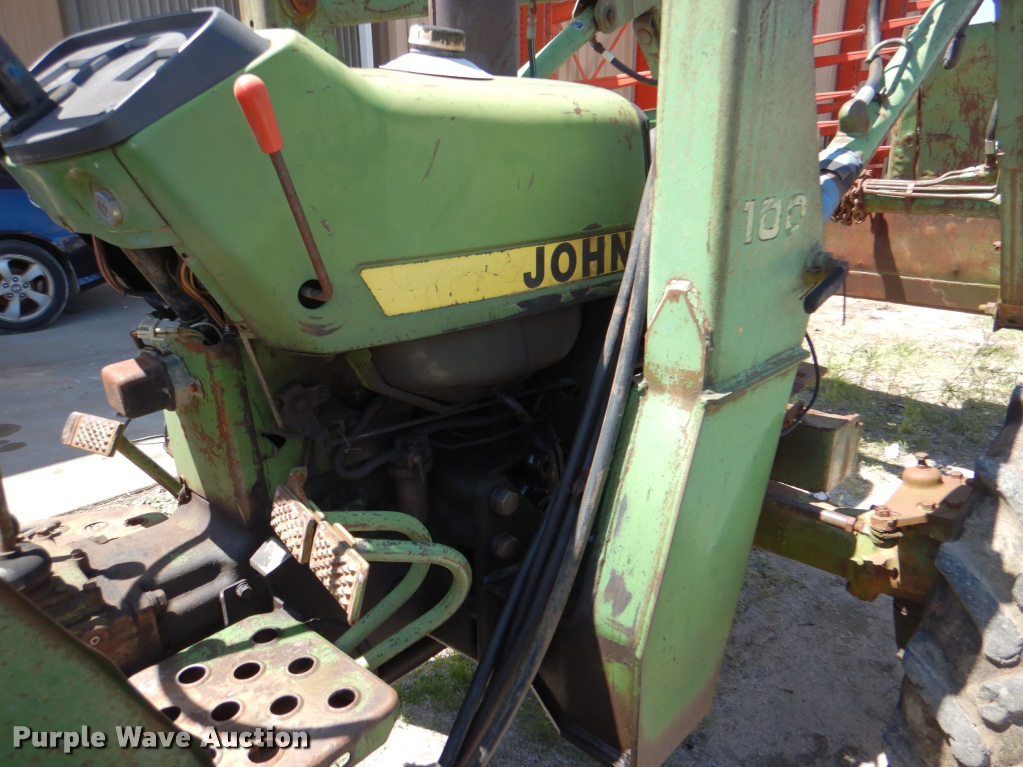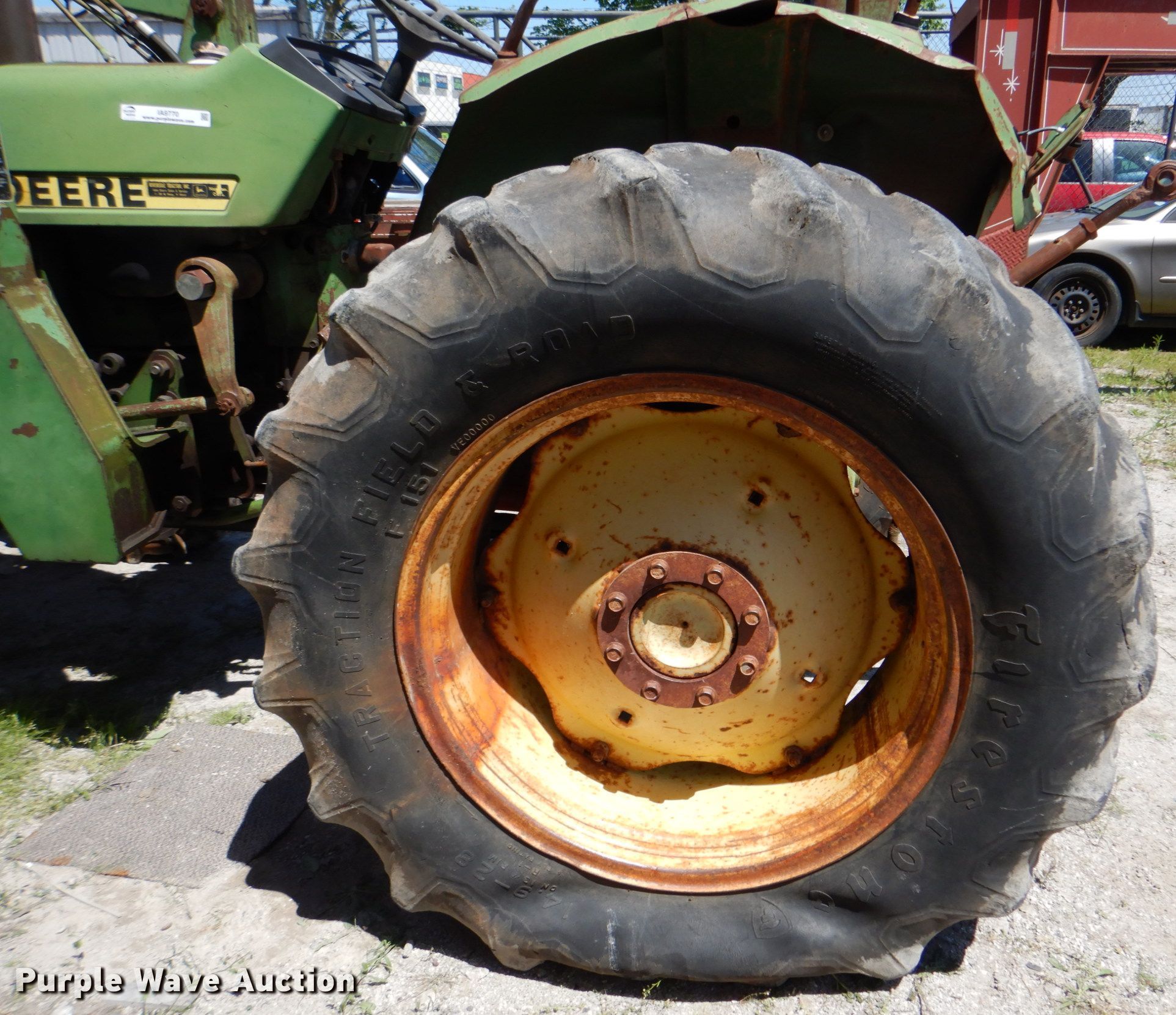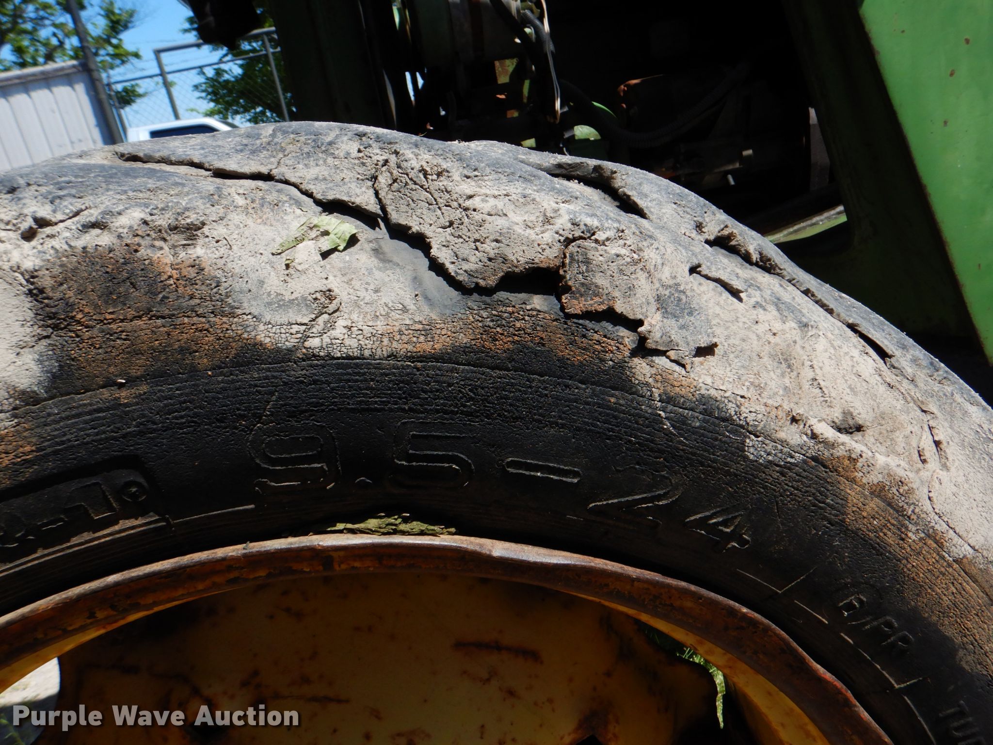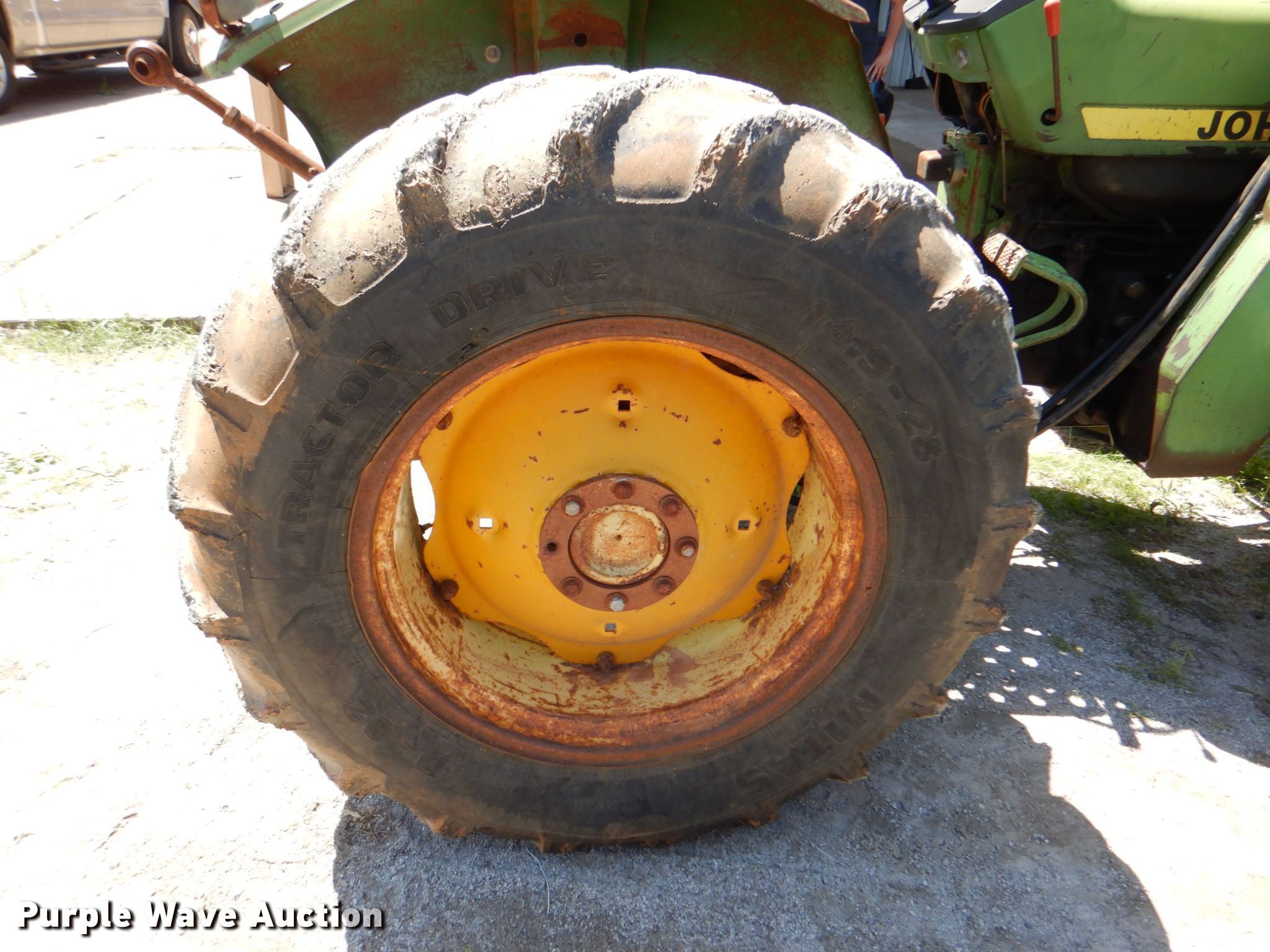 John Deere 1250 tractor. 1,594 hours on meter, Serial: CH1250A0041044. Engine John Deere 3T95J, Serial: CH3078DC020984, Displacement: 2.3L, Cylinders: 3, Fuel type: Diesel, HP: 44. Transmission Manual, 9F - 3R. Operational PTO: 540, Three point, Hydraulic remote sets Rear: 2, Loader Controls: Two lever, Bucket Width: 24".. Tires Front: 9.5-24, Rear: 14.9-28, Wheelbase: 78". Notes Tires damaged, may need to be replaced. S.S. Services. 5523 E Archer St N. Tulsa, OK 74115