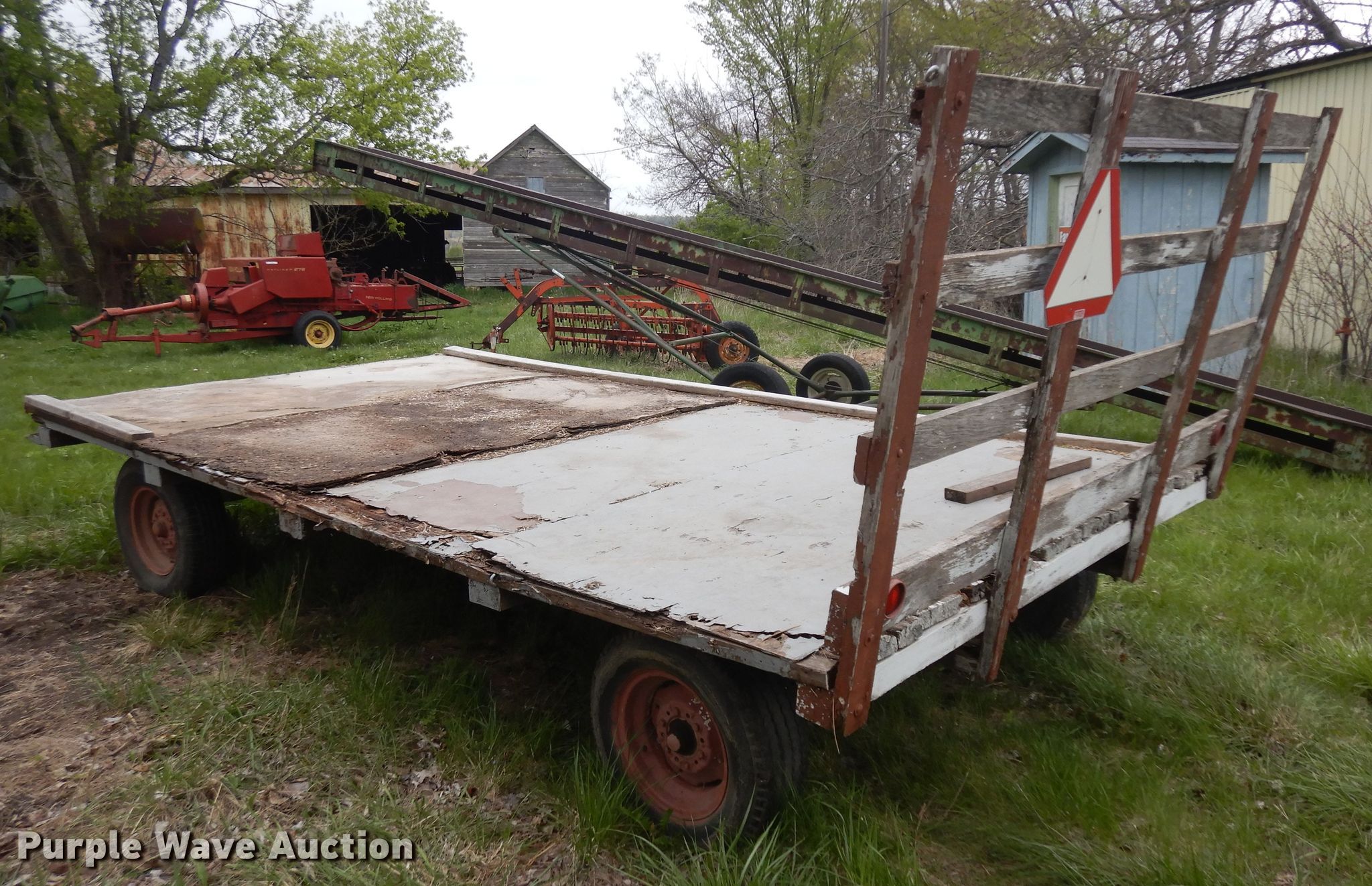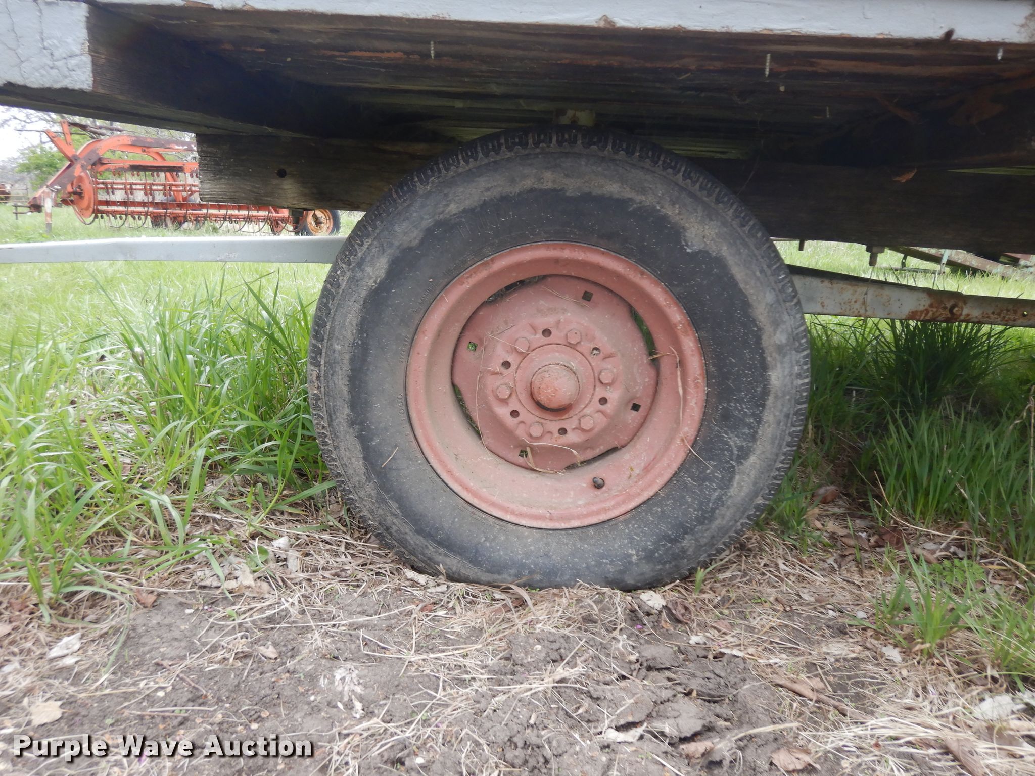 Purple Wave is selling a used Hay Handling in Kansas. This item is a Shop built hay wagon with the following: 15' 6" L x 8' W, Wood deck, Tire size: 235/75R15