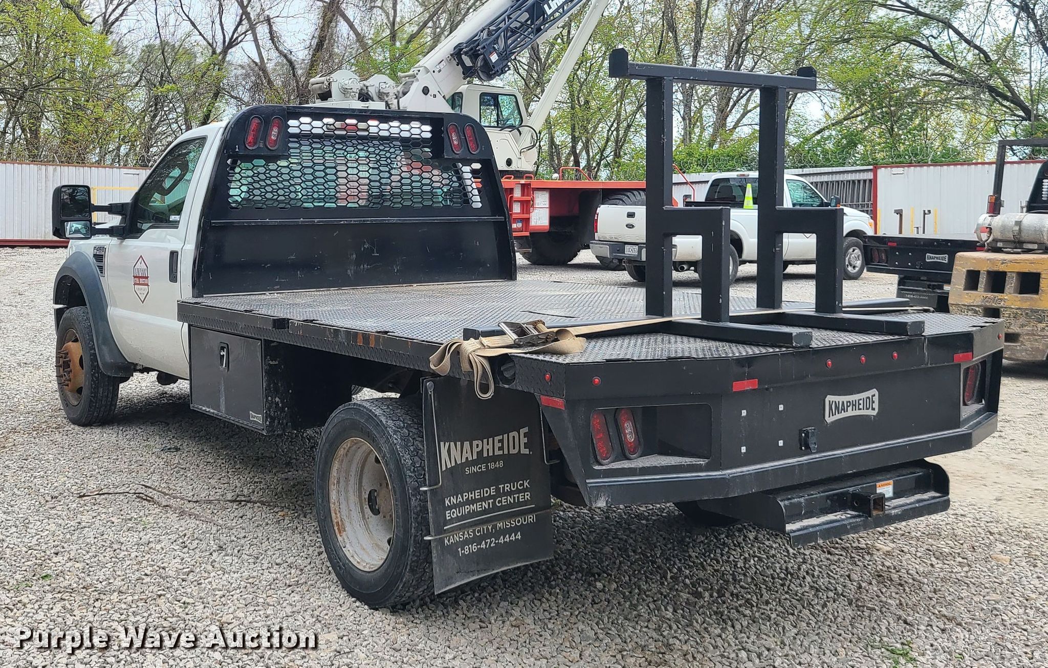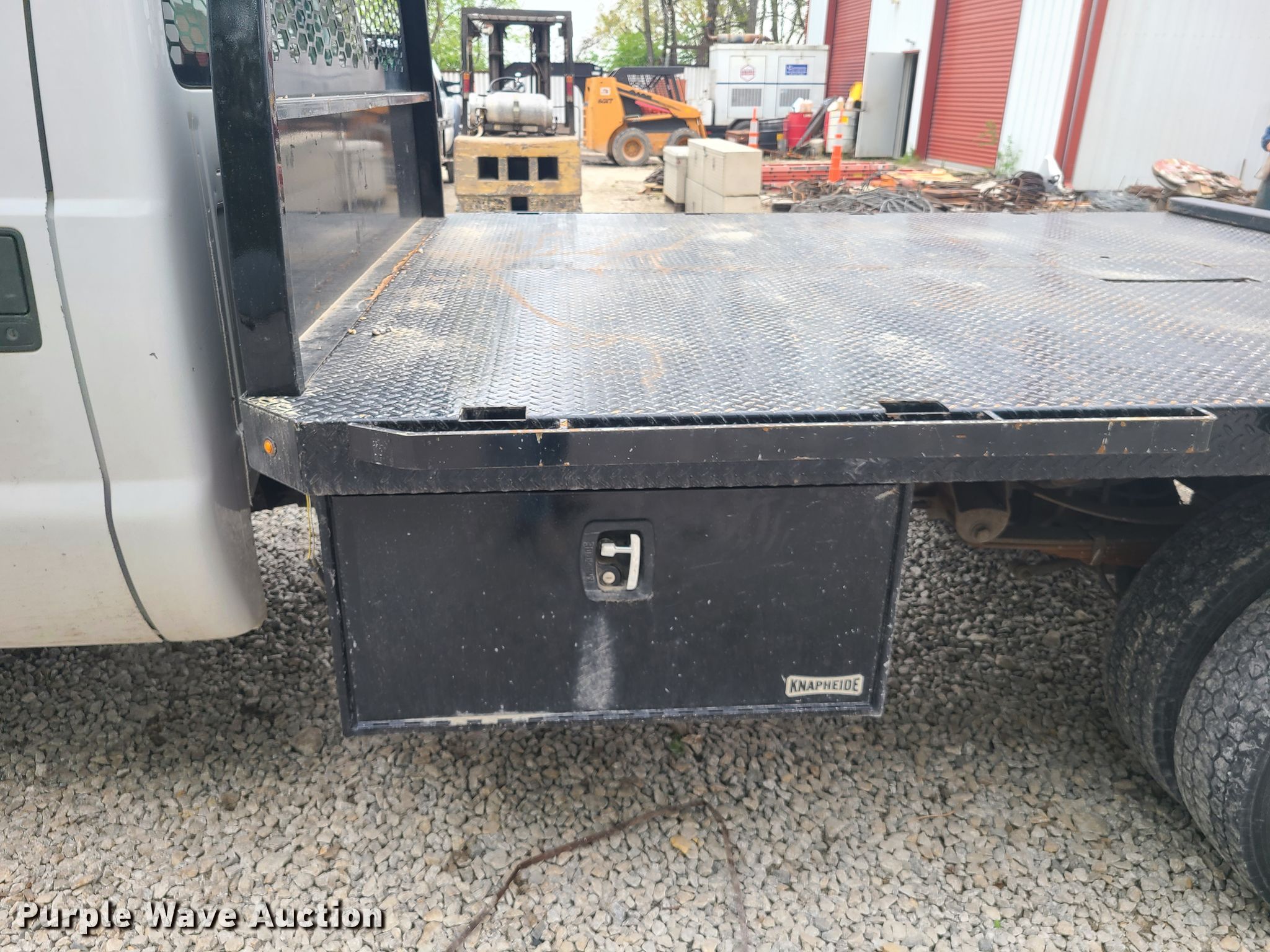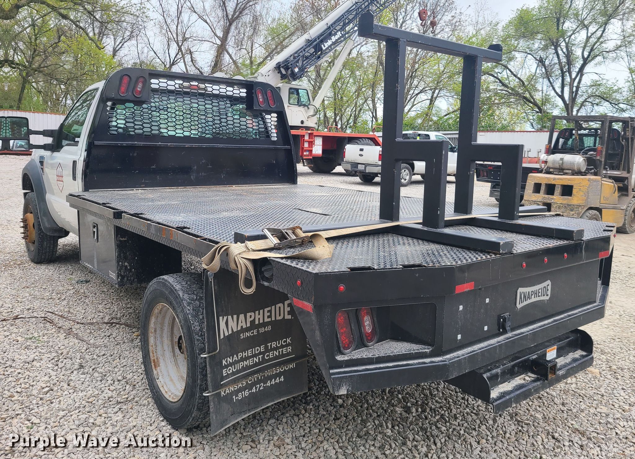 2010 Ford F450 Super Duty flatbed truck. 113,785 miles on odometer. Engine Displacement: 6.8L SOHC 30V, Cylinders: 10, Fuel type: Gas. Transmission Automatic. Chassis Four wheel drive, Axles: Single, Suspension: Spring, Brakes: Hydraulic. Interior AC, Heat. Operational Flatbed Knapheide, 11.5' L x 96" W. Tires Size: 225/70R19.5. Missouri title. 1FDGF4HY1AEB17231. 1607 E 2nd St. Kansas City, MO 64106