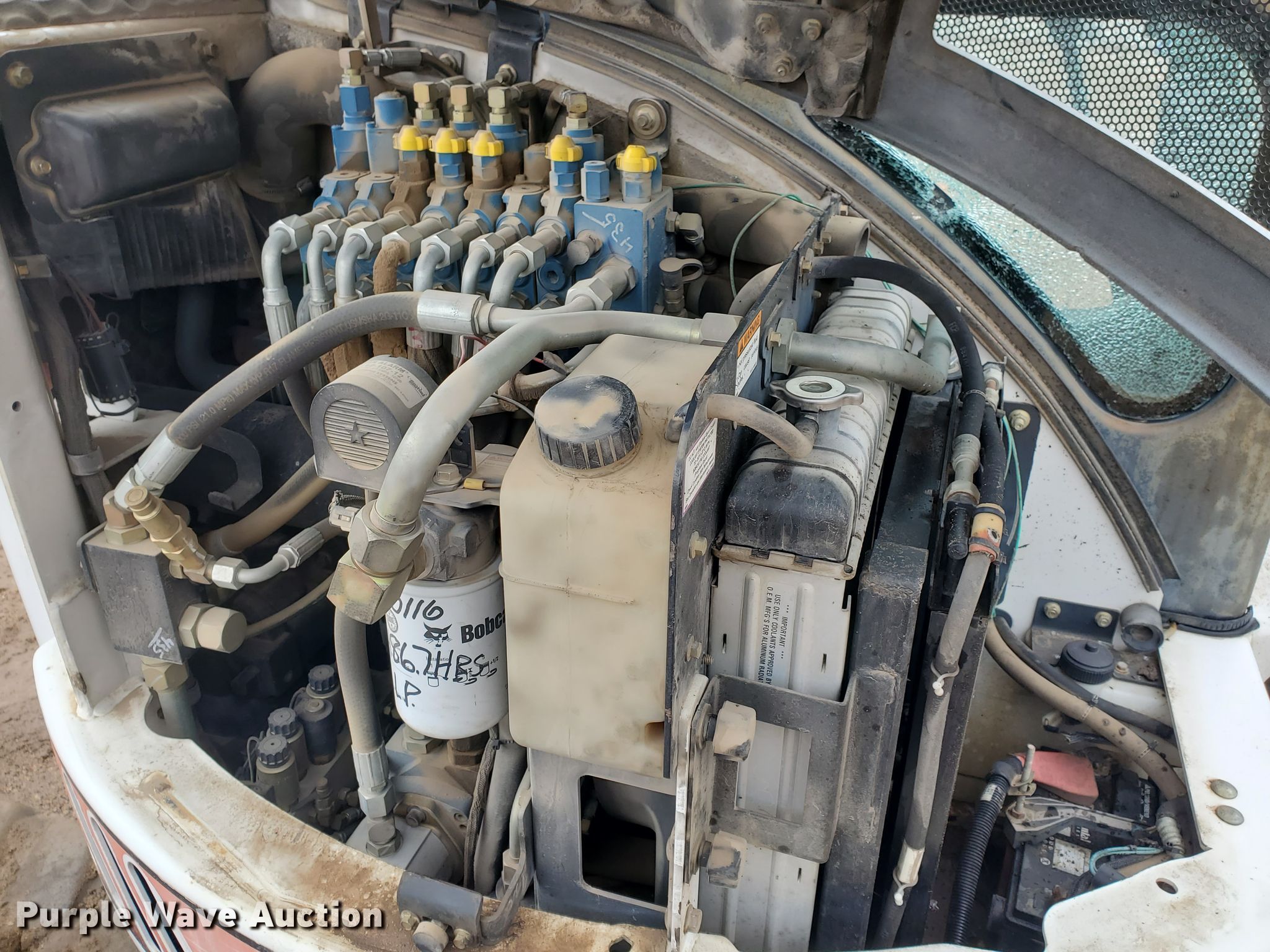 2003 Bobcat 435ZHS mini excavator. 6,058 hours on meter, Serial: 562811093. Engine Kubota V2004, Cylinders: 4, Fuel type: Diesel. Transmission Hydrostatic, Two speed travel. Operators station EROPS AC, Heat. Operational Auxiliary hydraulics, Backfill blade, Boom Swing, Stick Stick length: 54", Quick coupler: Mechanical, Bucket Bobcat, Capacity: 4.95 cu.ft., Width: 24", Cutting edge: Weld on, Teeth: 5. Tracks Width: 16", Rubber. Notes Glass cracked. King Enterprises Retirement - Open inspection June 24. 1924 W. 2nd. Liberal, KS 67901