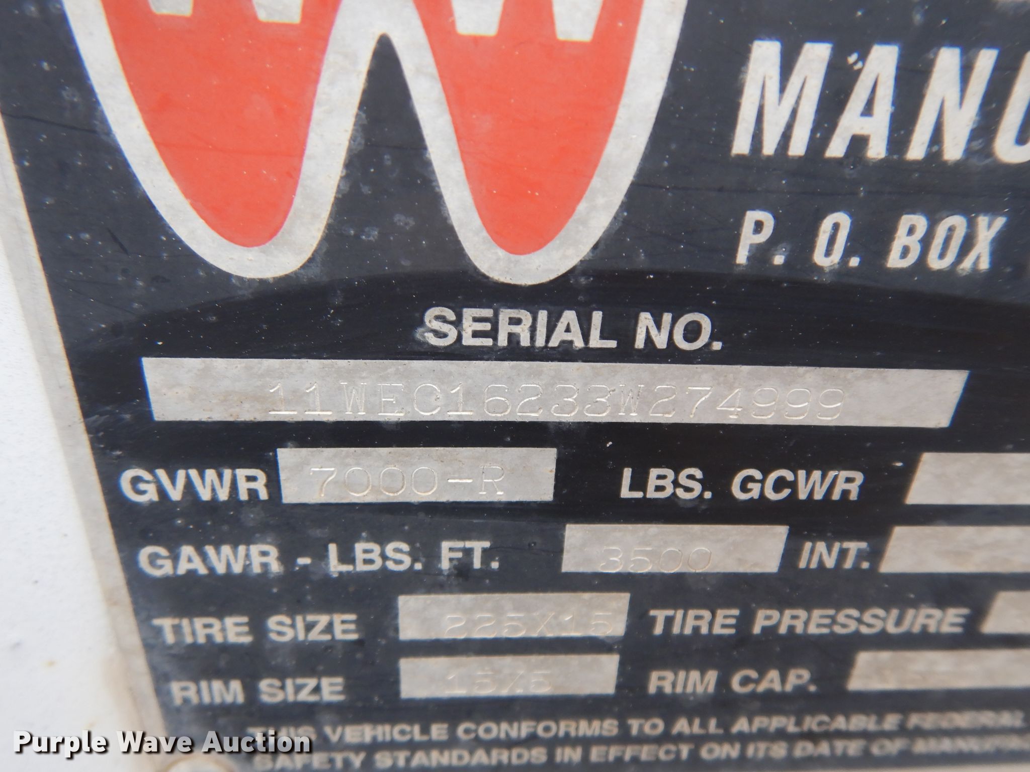 2003 W-W enclosed cargo trailer. Dimensions. Overall: 20' L x 94" W, Body: 16' L x 6' W. Operational Deck type: Wood. Chassis Ball hitch: 2", Landing gear: Single, Suspension: Spring, Brakes: Electric, Axles: Tandem, GVWR: 7,000 lbs. Tires Steel wheels, Size: 225/75R15. Kansas title. 11WEC16233W274999. King Enterprises Retirement - Open inspection June 24. 1924 W. 2nd. Liberal, KS 67901