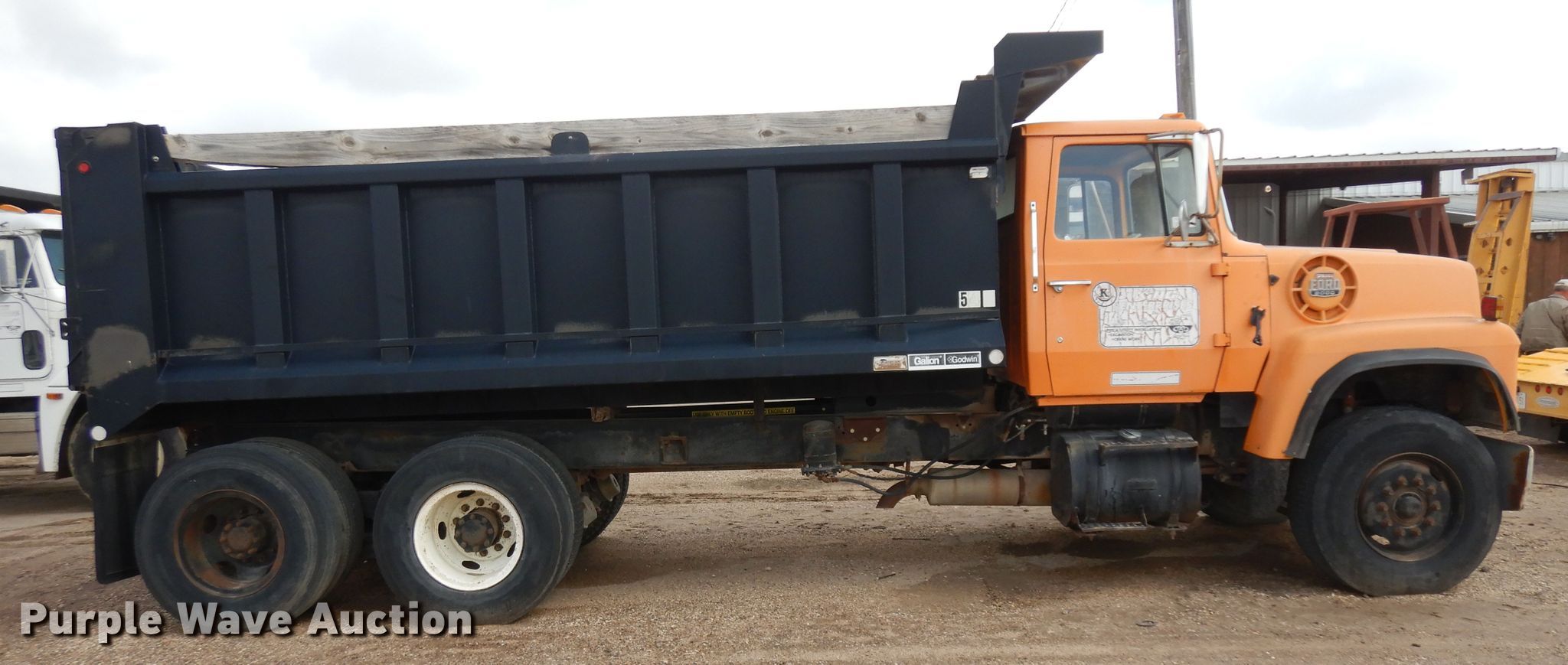 1980 Ford 8000 dump truck. 163 miles on odometer Actual mileage unknown, Engine hours: 2,740. Engine Caterpillar 3208, Cylinders: 8, Fuel type: Diesel. Transmission Manual, Speed: 13. Chassis Double frame, Axles: Tandem, Differential lock: Inter-axle, Suspension: Spring over walking beam, Brakes: Air, PTO, GVWR: 54,000 lbs. Interior Heat. Operational Dump bed Galion 500T-16, 16' L x 96" W, Side height: 47", Side board height: 8", Bed type: Steel, Ram: Single , End gate: Air operated. Tires Front: 385/65R22.5, Rear: 10.00R20. Kansas title. Mileage has not been verified. Exempt will be written in the odometer disclosure on the title. U80UVJA6239. King Enterprises Retirement - Open inspection June 24. 1924 W. 2nd. Liberal, KS 67901