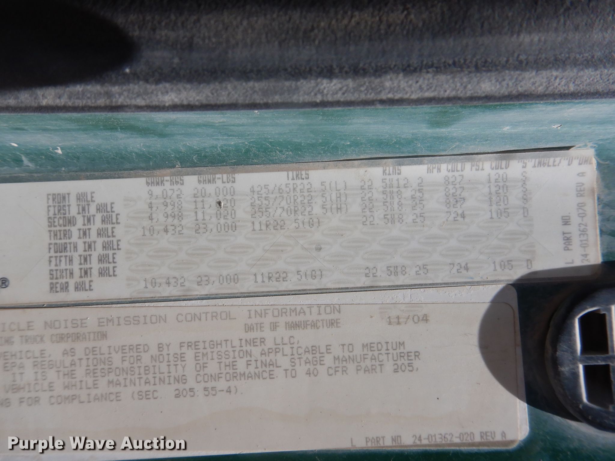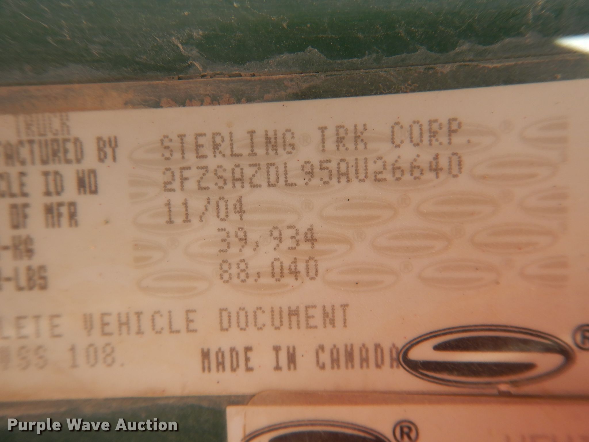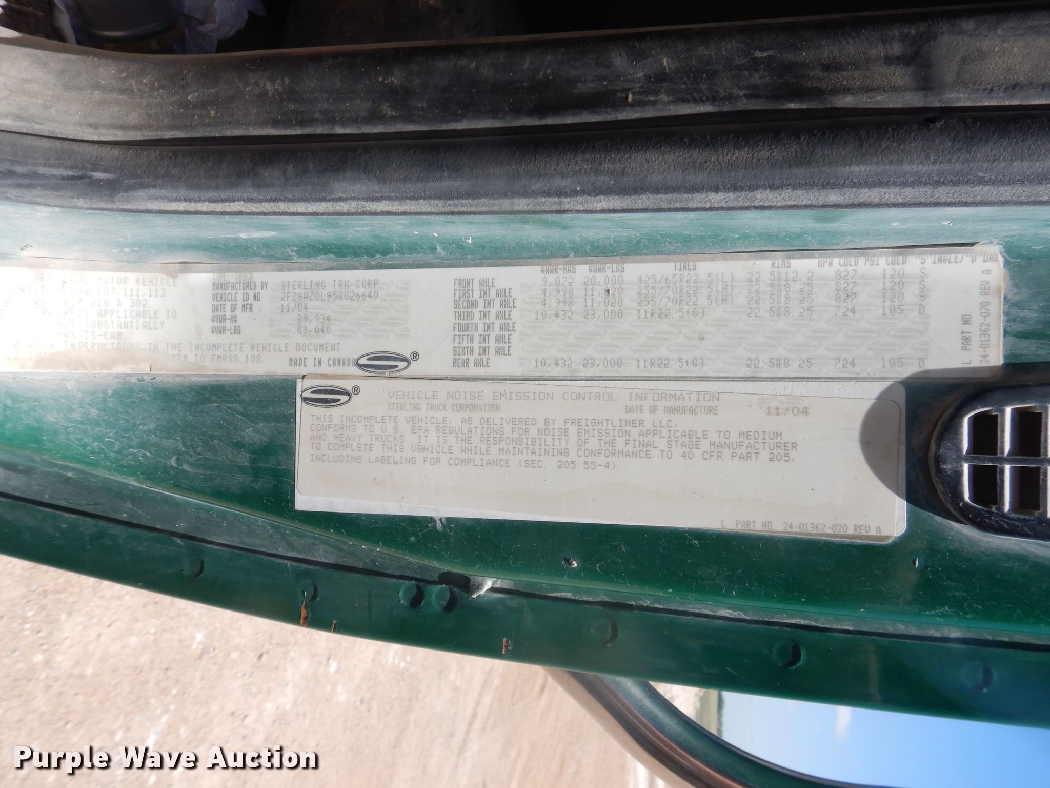 2005 Sterling LT9 ready mix truck. 265,233 miles on odometer, Engine hours: 25,348. Engine Caterpillar C11, Displacement: 11.1L, Cylinders: 6, Fuel type: Diesel. Transmission Eaton Fuller, Manual, Speed: 11. Chassis Axles: 5, Pusher axles Steerable, Tag axle Steerable, Differential lock: Inter-axle, Suspension: Walking beam, Brakes: Air, GVWR: 88,040 lbs. Interior AC, Heat, Heated mirrors. Operational Mixer Capacity: 10 cu.yd., Discharge: Rear, In-cab controls, Rear drum controls. Tires Front: 425/65R22.5, Rear: 11R22.5, Pusher axle: 255/70R22.5, Tag axle: 255/70R22.5. Notes Ignition issues , Hydraulic leaks , Oil leaks, Radiator leaks. Iowa title. 2FZSAZDL95AU26640. Croell Redi-Mix. 709 N Elm Ave. Guymon, OK 73942