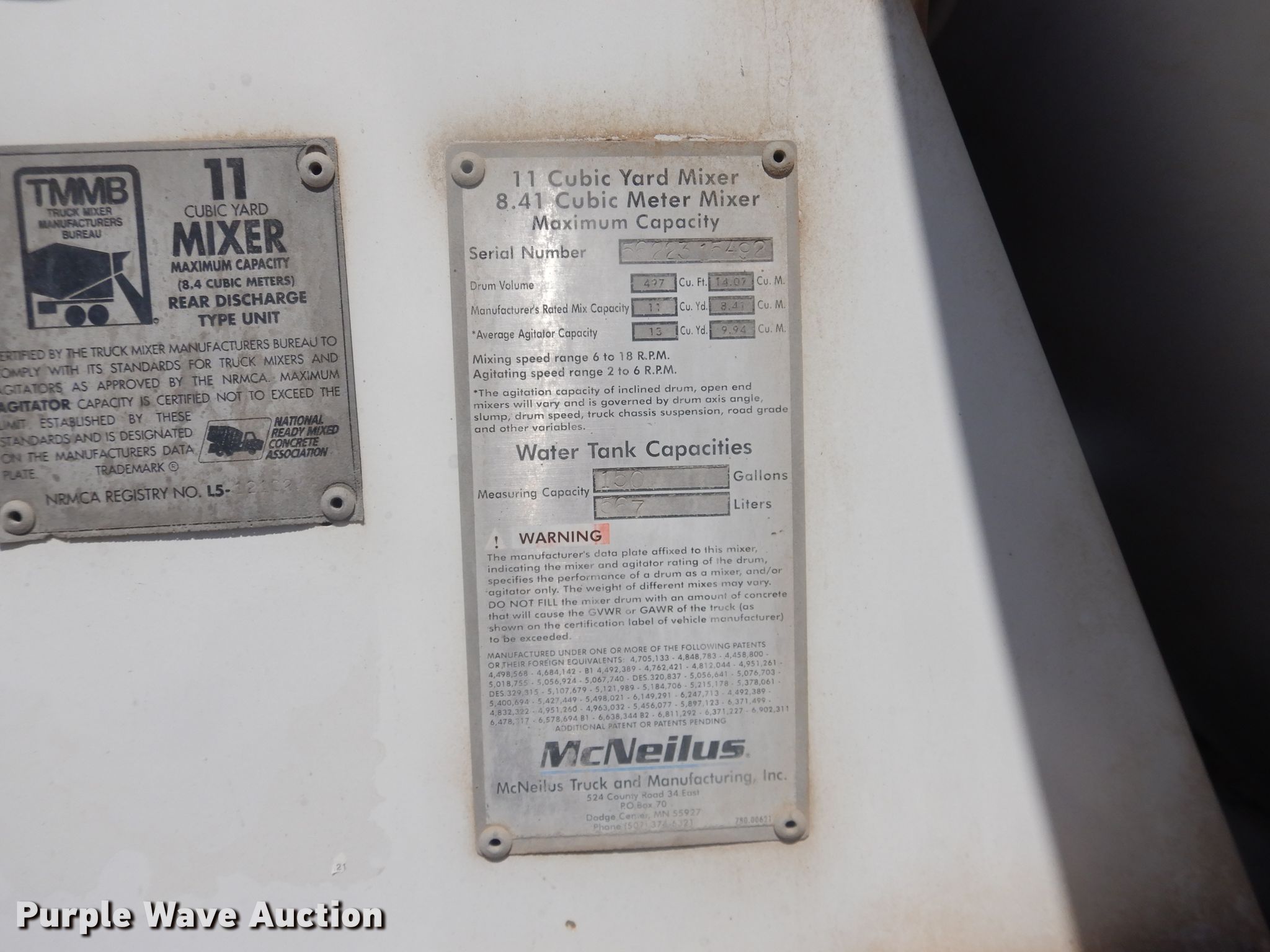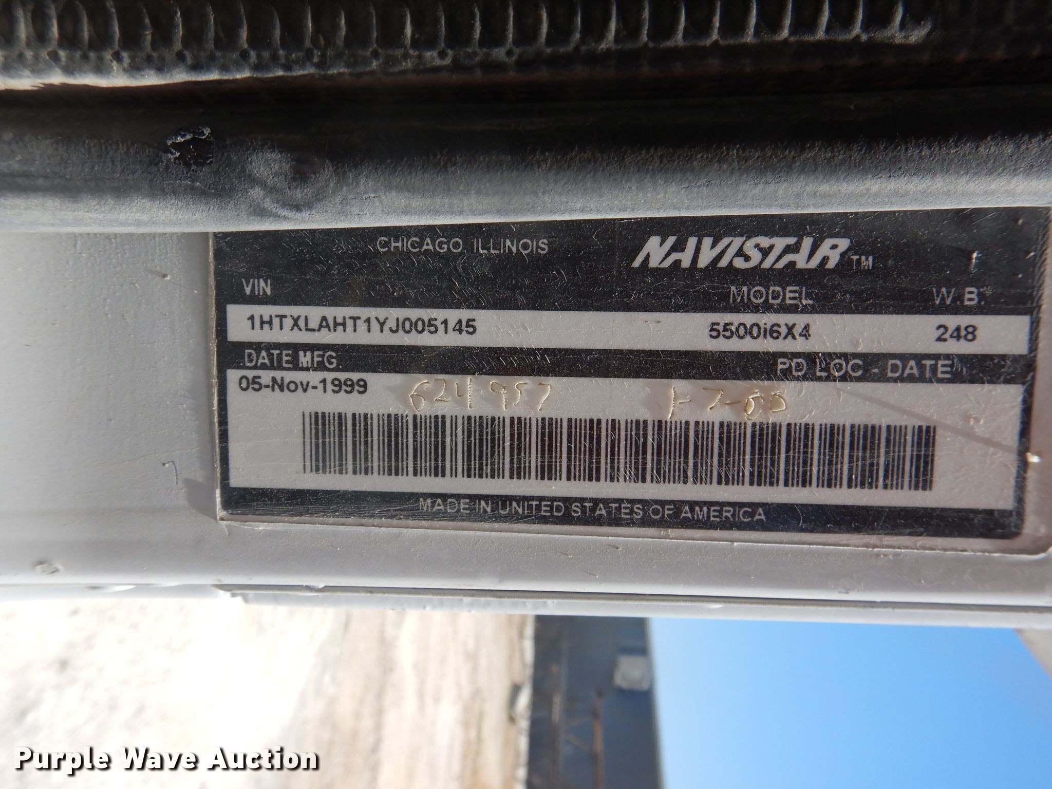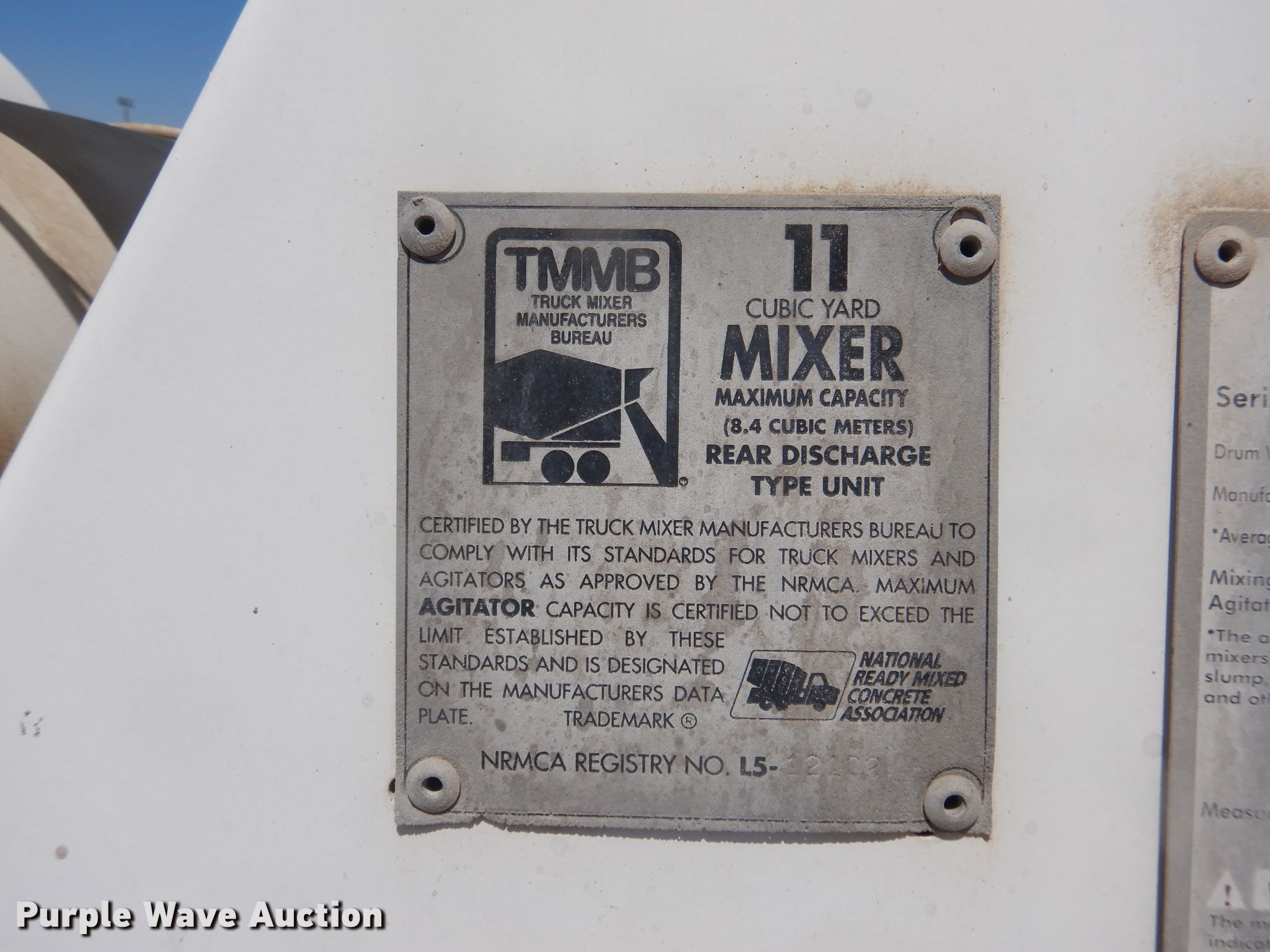 2000 International 5500i ready mix truck. 207,253 miles on odometer, Engine hours: 19,251, Unit #: 57000105. Engine Cummins ISM, Displacement: 10.8L, Cylinders: 6, Fuel type: Diesel. Transmission Eaton Fuller, Manual, Speed: 11. Chassis Axles: Triple, Tag axle Steerable, Differential lock: Inter-axle, Suspension: Walking beam, Brakes: Air, PTO, GVWR: 79,200 lbs FAWR: 20,000 lbs, IAWR: 23,000 lbs, RAWR: 23,000 lbs, Lift axle GAWR: 13,200 lbs. Interior AC, Heat, Cruise control. Operational Mixer TMMB, Serial: 5622315492, Capacity: 11 cu.yd., Discharge: Rear, In-cab controls, Rear drum controls, Water tank capacity: 150 gallons. Tires Front: 425/65R22.5, Rear: 11R22.5, Tag axle: 11R22.5. Notes Dash warning indicator: ABS, Windshield chipped or cracked, Throttle issues, Brake issues. Iowa title. Title distribution may be delayed up to 14 days from verification of funds. 1HTXLAHT1YJ005145. Croell Redi-Mix. 709 N Elm Ave. Guymon, OK 73942
