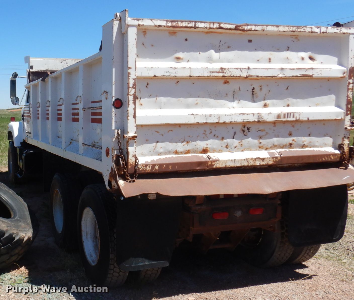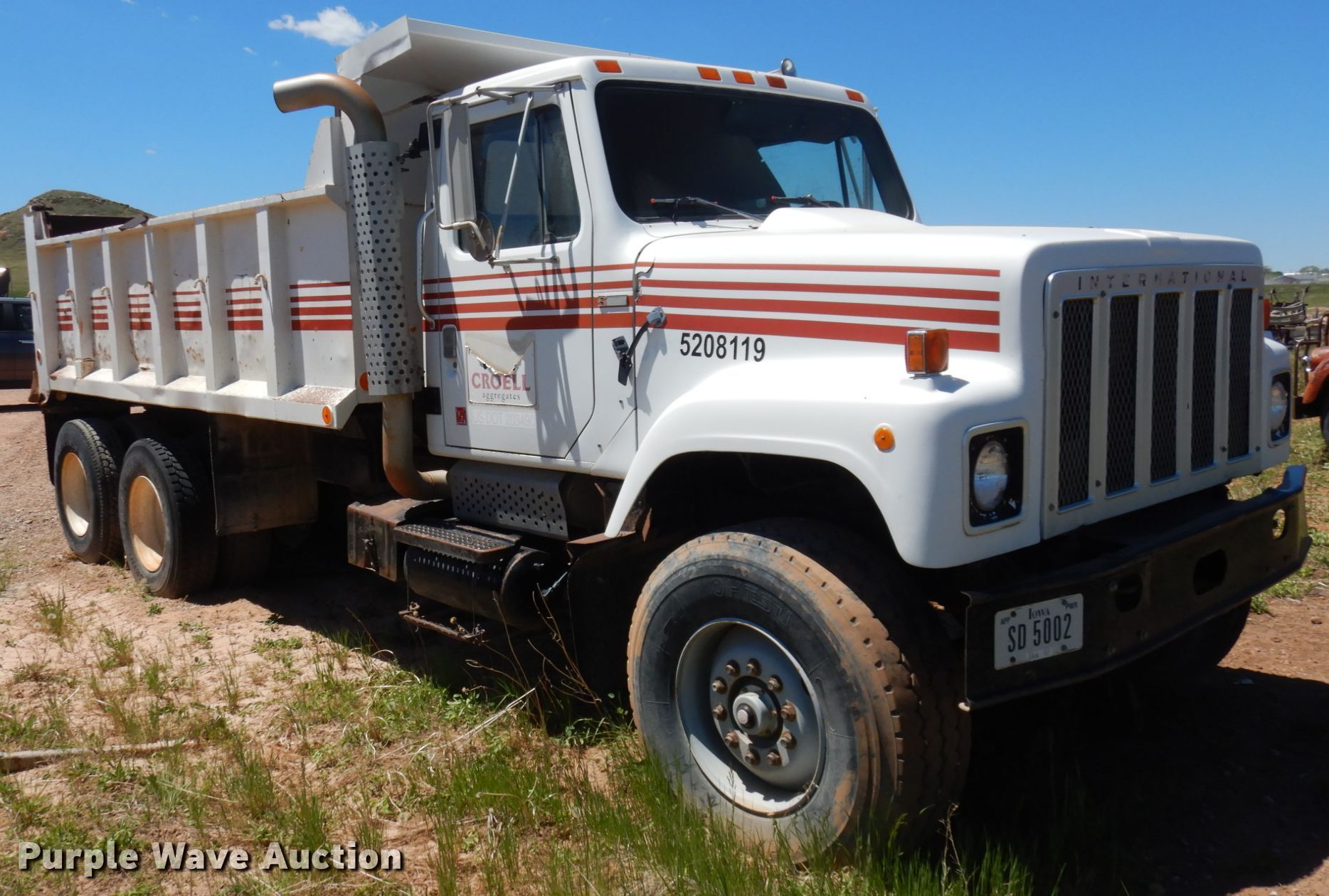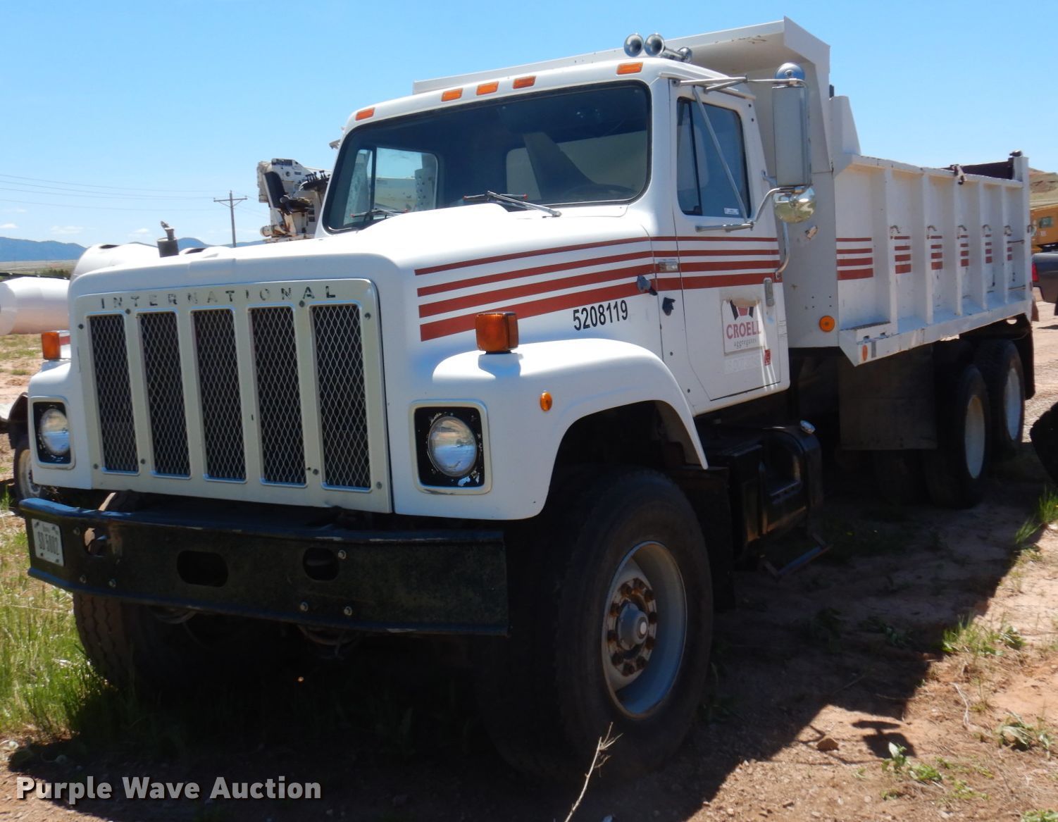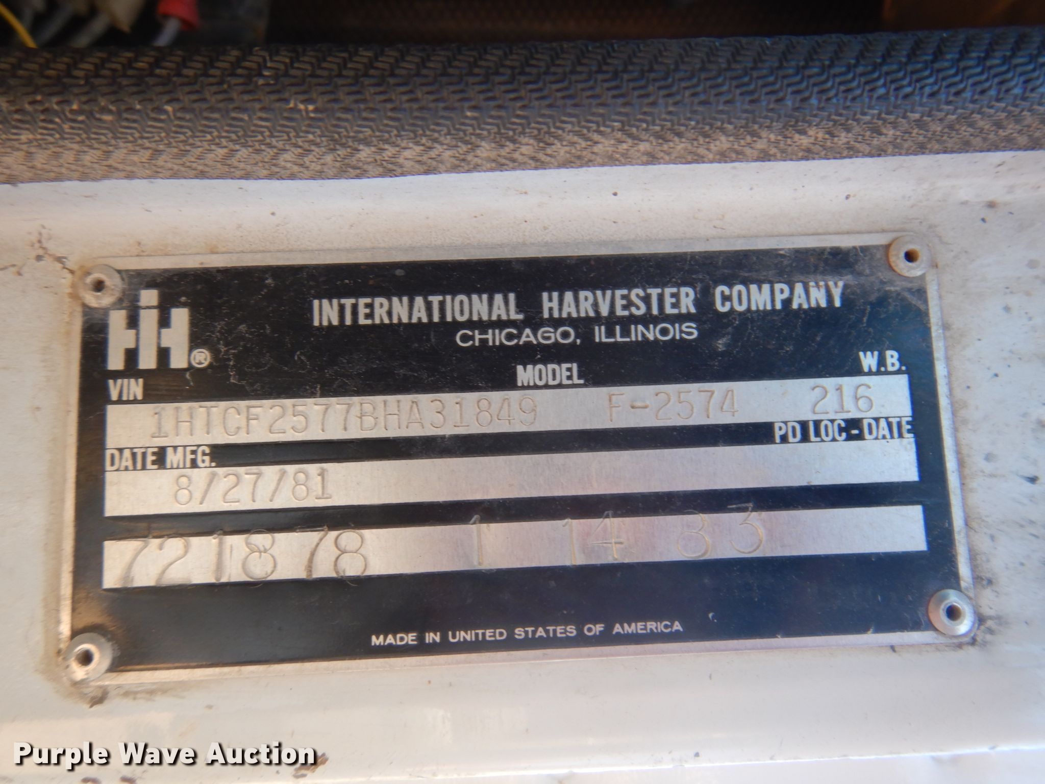 1981 International F2574 dump truck. 259,842 miles on odometer, Engine hours: 2,510. Engine Cummins, Displacement: 9.0L, Cylinders: 6, Fuel type: Diesel. Transmission Manual. Chassis Axles: Tandem, Differential lock: Inter-axle, Suspension: Walking beam, Brakes: Air, PTO. Interior Heat. Operational Dump bed 15'2" L x 7'6" W, Side height: 39", Bed type: Steel, End gate: Air. Tires Front: 425/65R22.5, Rear: 11R22.5. Notes Non-operational unit. Iowa title. 1HTCF2577BHA31849. 230 Croell Dr. Sundance, WY 82729