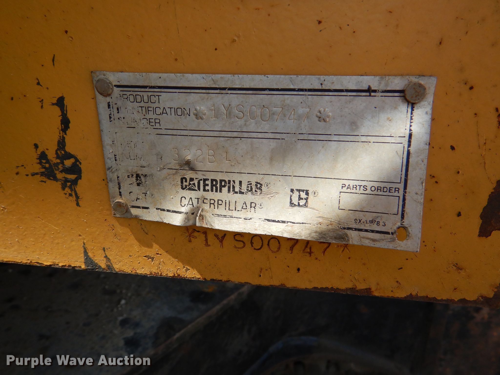 1998 Caterpillar 322BL excavator. 19,028 hours on meter, Serial: 1YS00747, Unit #: 151. Engine Caterpillar, Cylinders: 6, Fuel type: Diesel. Transmission Hydrostatic. Operators station Enclosed cab, Heat. Operational Boom Standard, Stick Stick length: 12', Quick coupler: Hydraulic, Bucket Caterpillar, Width: 24", Cutting edge: Weld on, Teeth: 3. Tracks Width: 32", Steel, Grouser pads: Triple. Notes Engine issues, Hydraulic leak on stick. Schmidtlein Excavating. 204 NE Rice Rd. Topeka, KS 66616