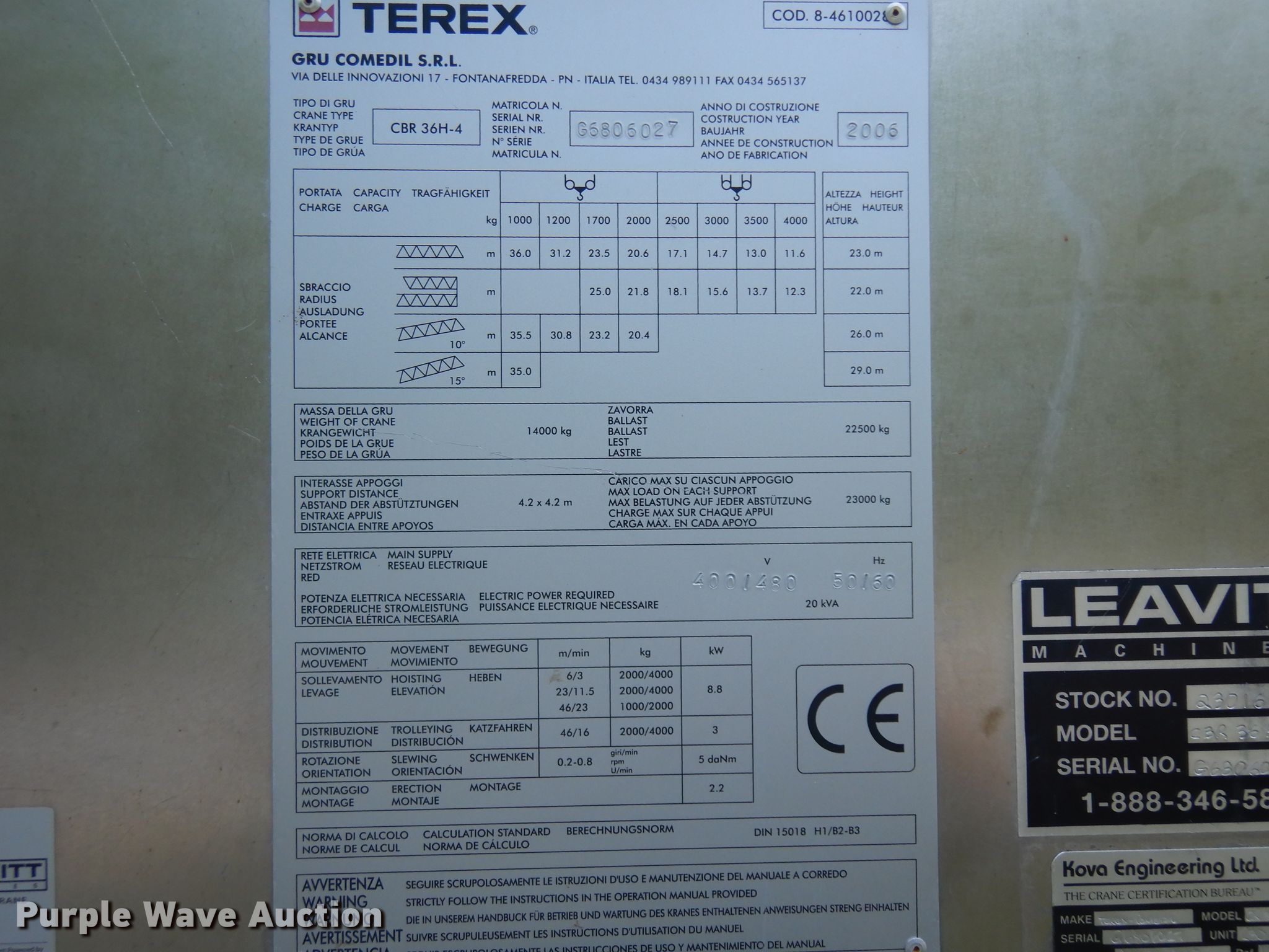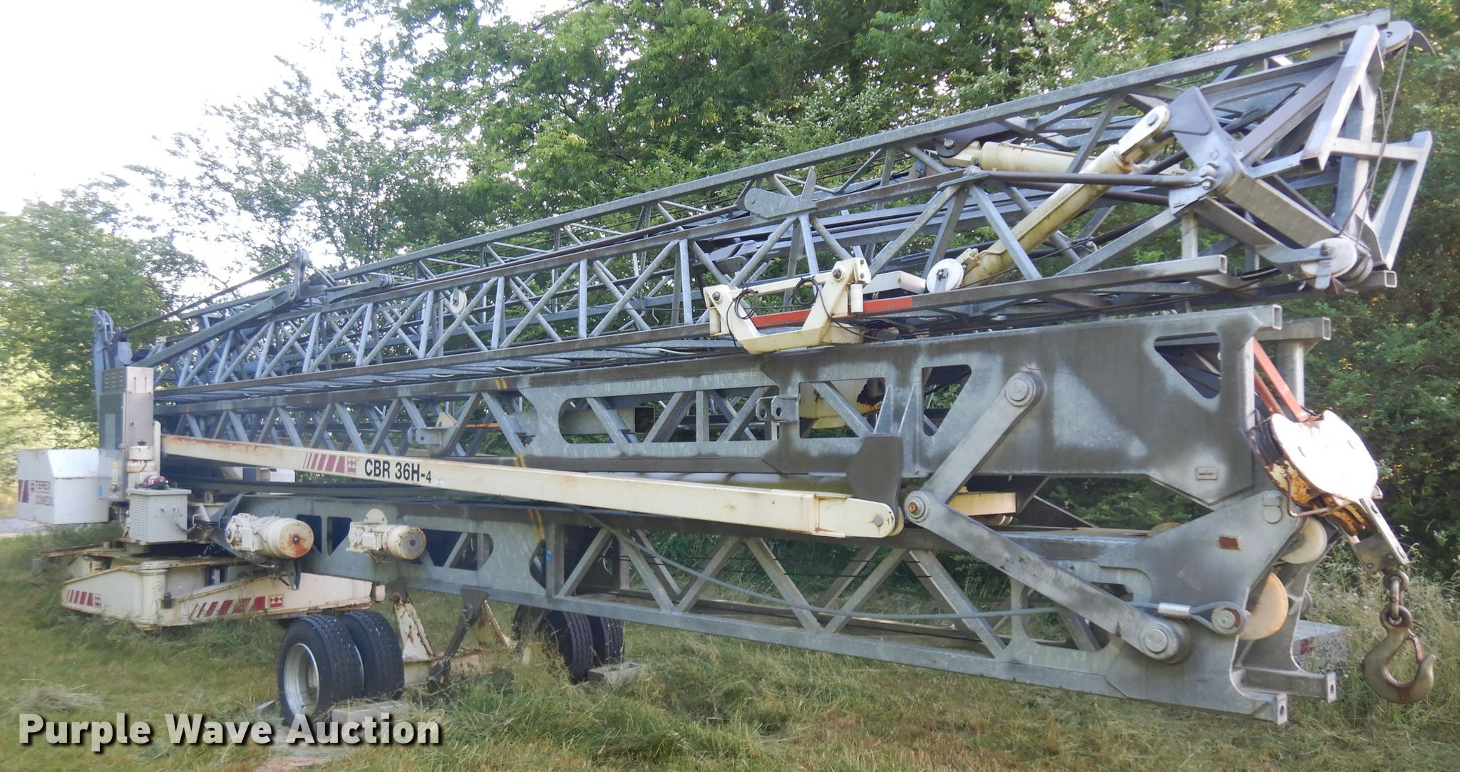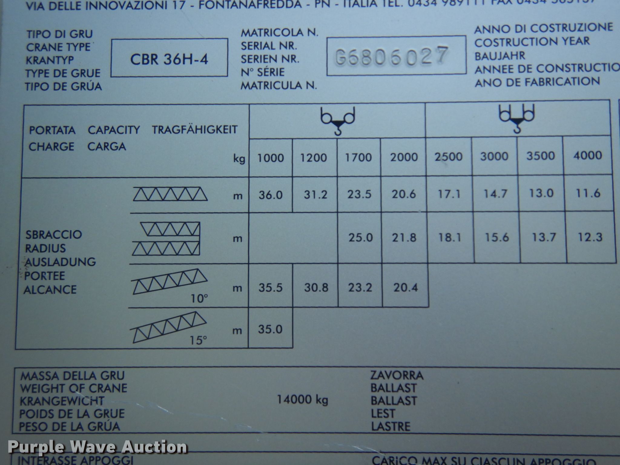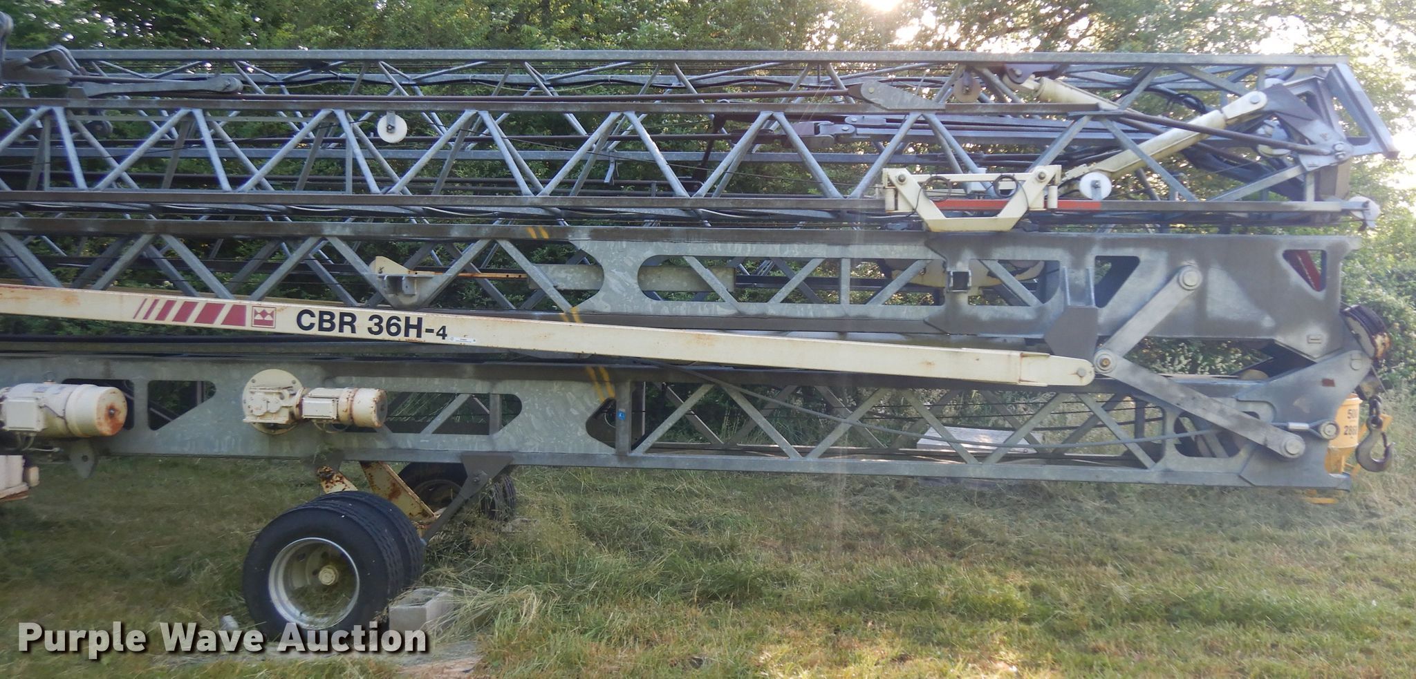 2006 Terex CBR36H-4 self-erecting tower crane. Serial: G6806027. Operational Boom length: 118', Maximum lift capacity: 2,000 lbs at tip, Jib: 43', Underhook: 75', Boom controls Remote control, Crane block Sheaves: 2, Manuals, Lift chart. Tires Size: 215/75-17.5. Notes (15) 2,712 lbs counterweights, (4) test weights 2,194 lbs, 4,404 lbs, 4,400 lbs, 790 lbs, 218 lbs transfer weight. 3313 Hwy 82-e. Bell Buckle, TN 37020