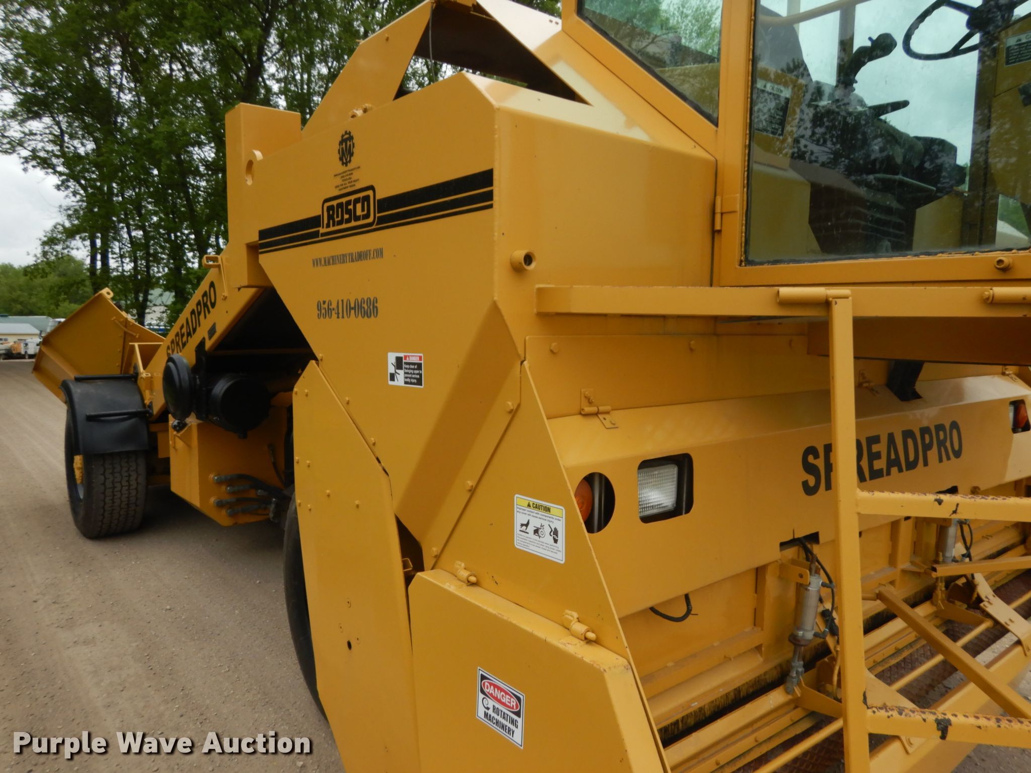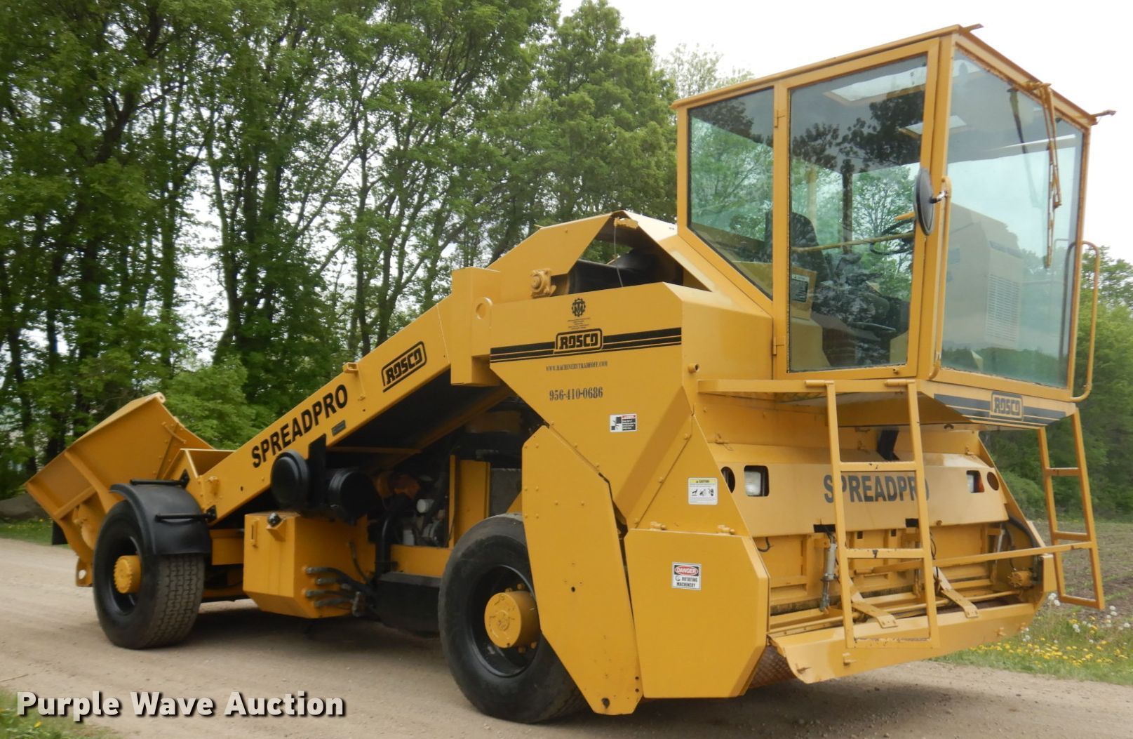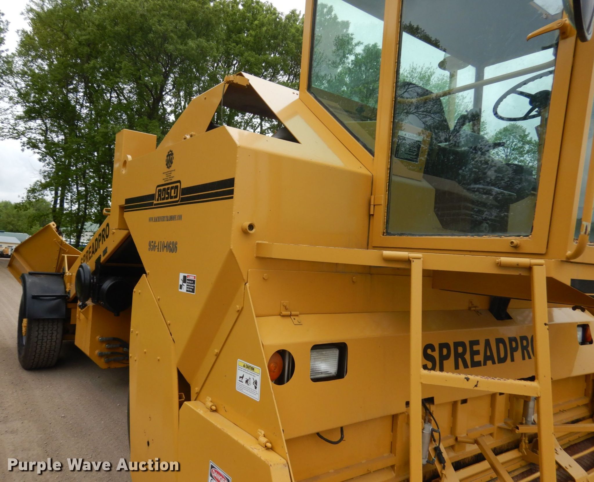 2000 Rosco Spread Pro chip spreader. 1,981 hours on meter, Serial: 36905. Engine Cummins, Cylinders: 6, Fuel type: Diesel. Transmission Hydrostatic, Four wheel drive. Interior Enclosed cab AC. Operational Screed, Paving width: 9' to 16', Extensions Quantity: 2, Screed heater: Electric , Front spread hopper width: 11', Material conveyor Width: 48". Tires Size: 425/65R22.5. Hutchinson, MN 55350