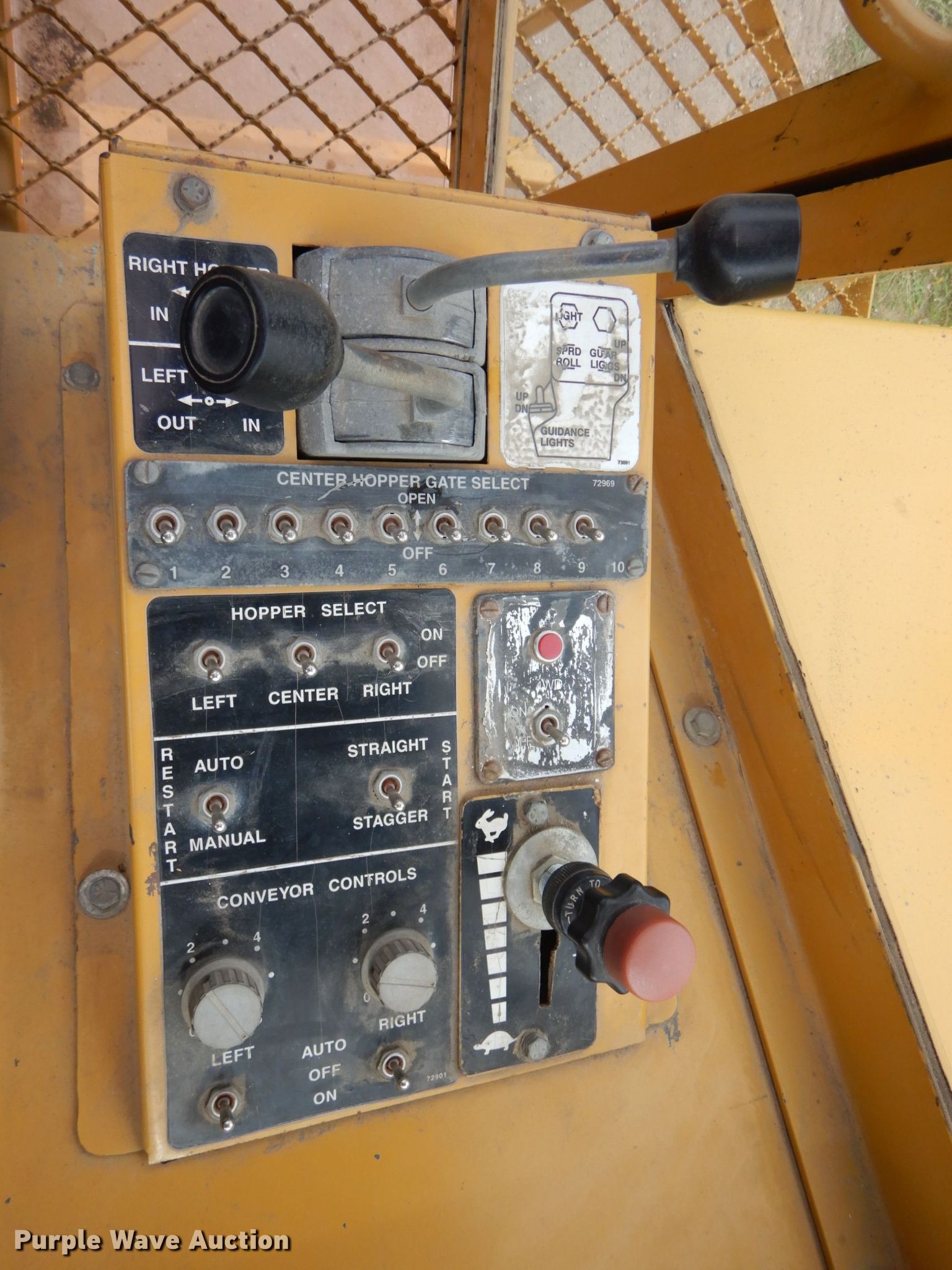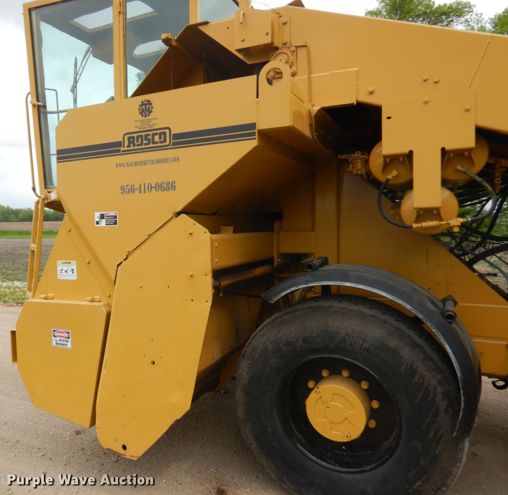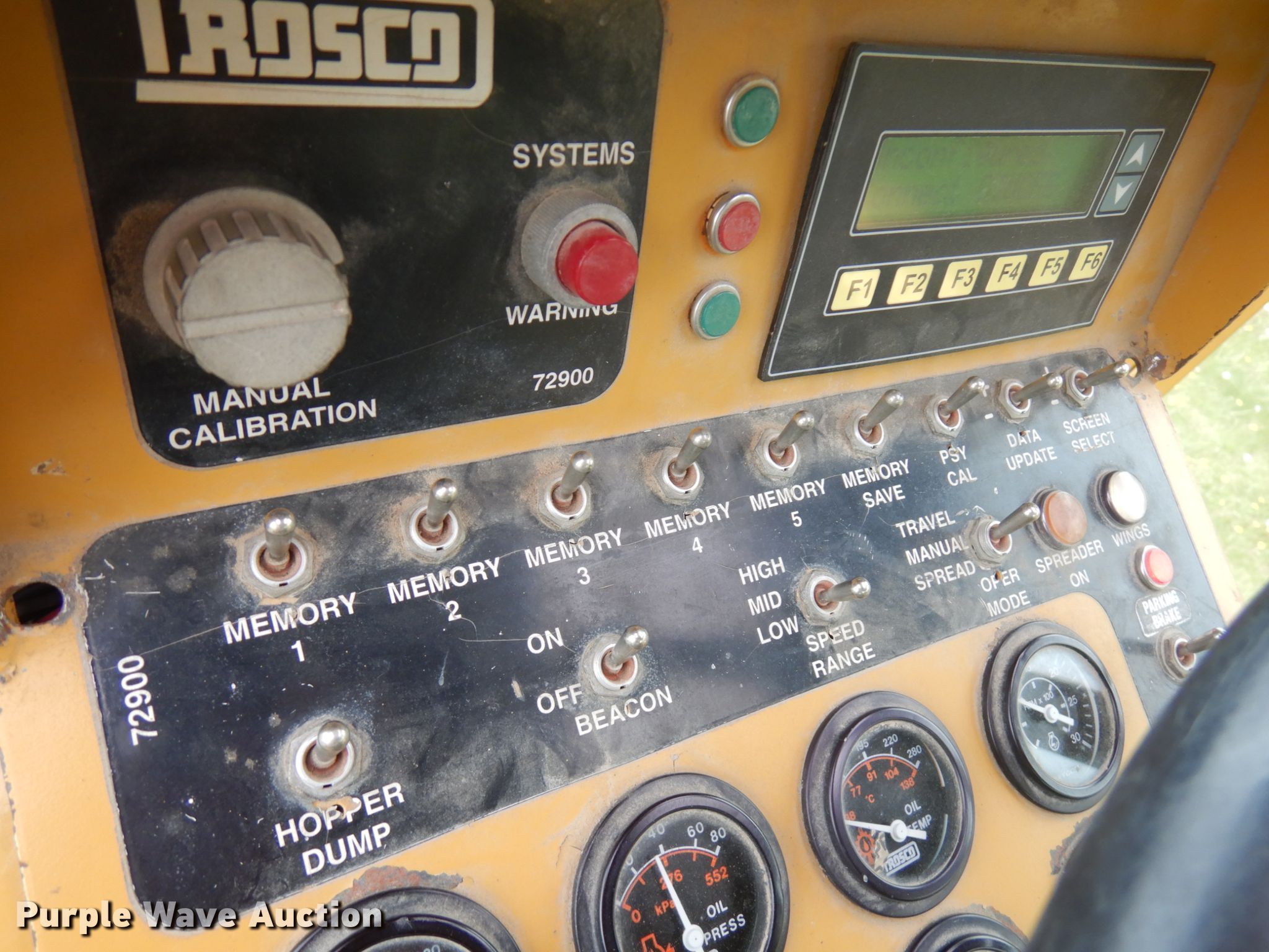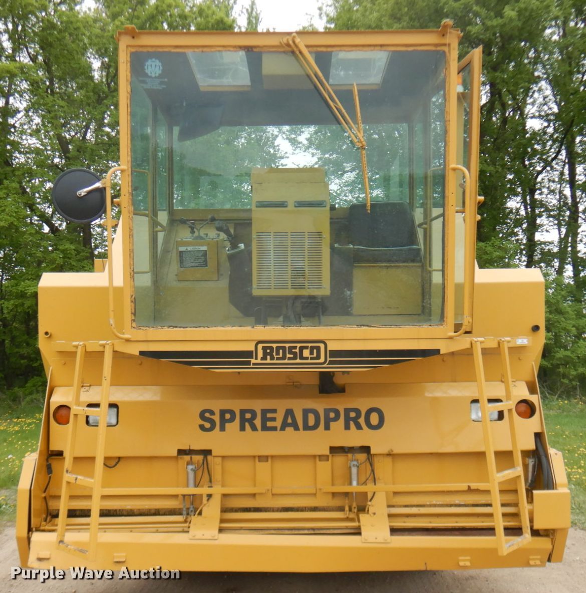2000 Rosco Spread Pro chip spreader. 1,981 hours on meter, Serial: 36905. Engine Cummins, Cylinders: 6, Fuel type: Diesel. Transmission Hydrostatic, Four wheel drive. Interior Enclosed cab AC. Operational Screed, Paving width: 9' to 16', Extensions Quantity: 2, Screed heater: Electric , Front spread hopper width: 11', Material conveyor Width: 48". Tires Size: 425/65R22.5. Hutchinson, MN 55350