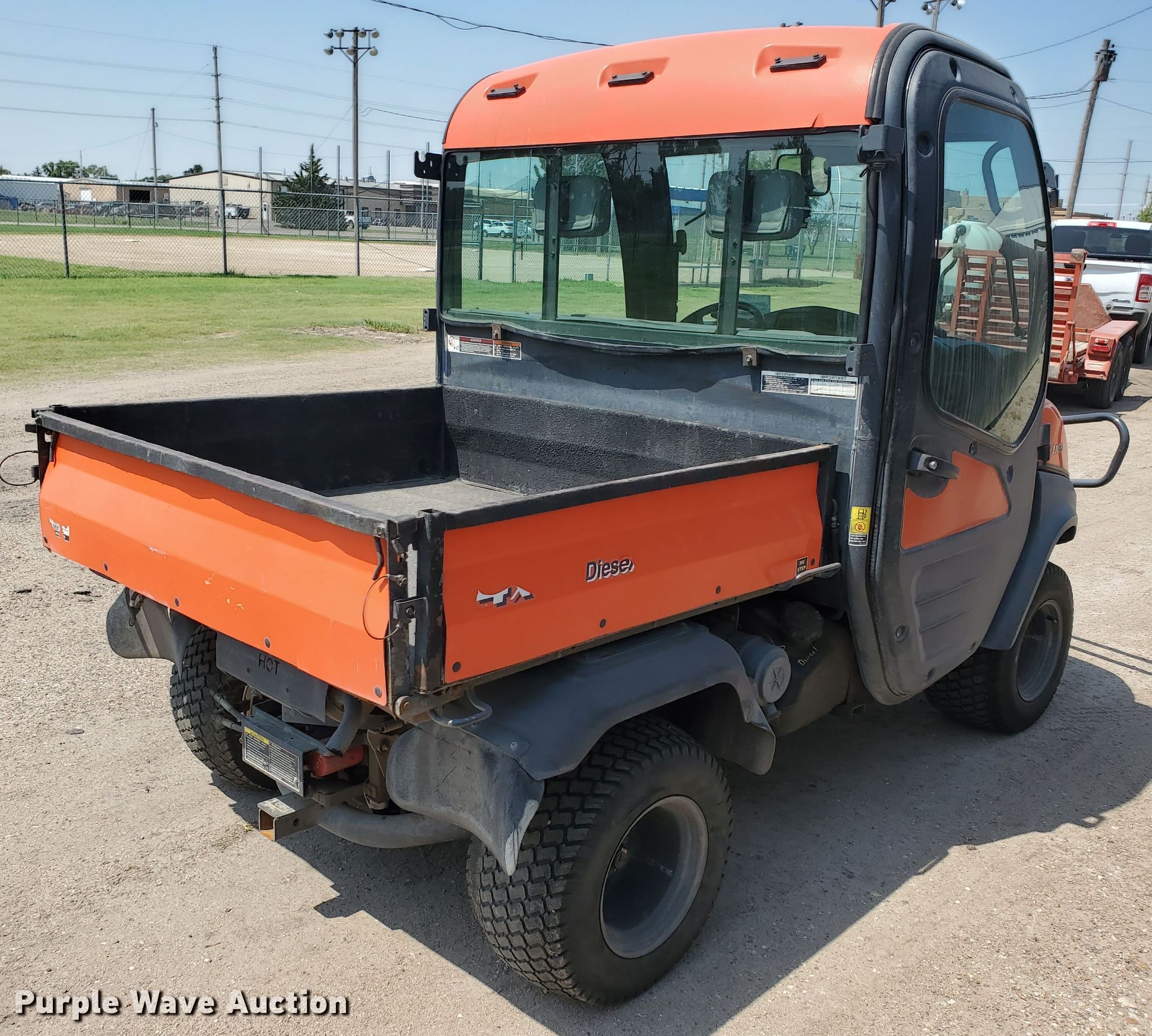 2009 Kubota RTV1100 utility vehicle. 3,527 hours on meter. Engine Kubota, Displacement: 1.1L, Cylinders: 3, Fuel type: Diesel, Electric start. Transmission Hydrostatic, Speed: 3. Chassis Four wheel drive. Operators station EROPS AC, Heat, Passengers: 2. Operational Receiver hitch, Dump bed 48" L x 54" W, Dump bed type: Electric/ Hydraulic. Tires Size: 24x12.00-12. Kansas title. Title distribution may be delayed up to 14 days from verification of funds. KRTV110091022600. 1546 US Highway 40 Byp. Hays, KS 67601