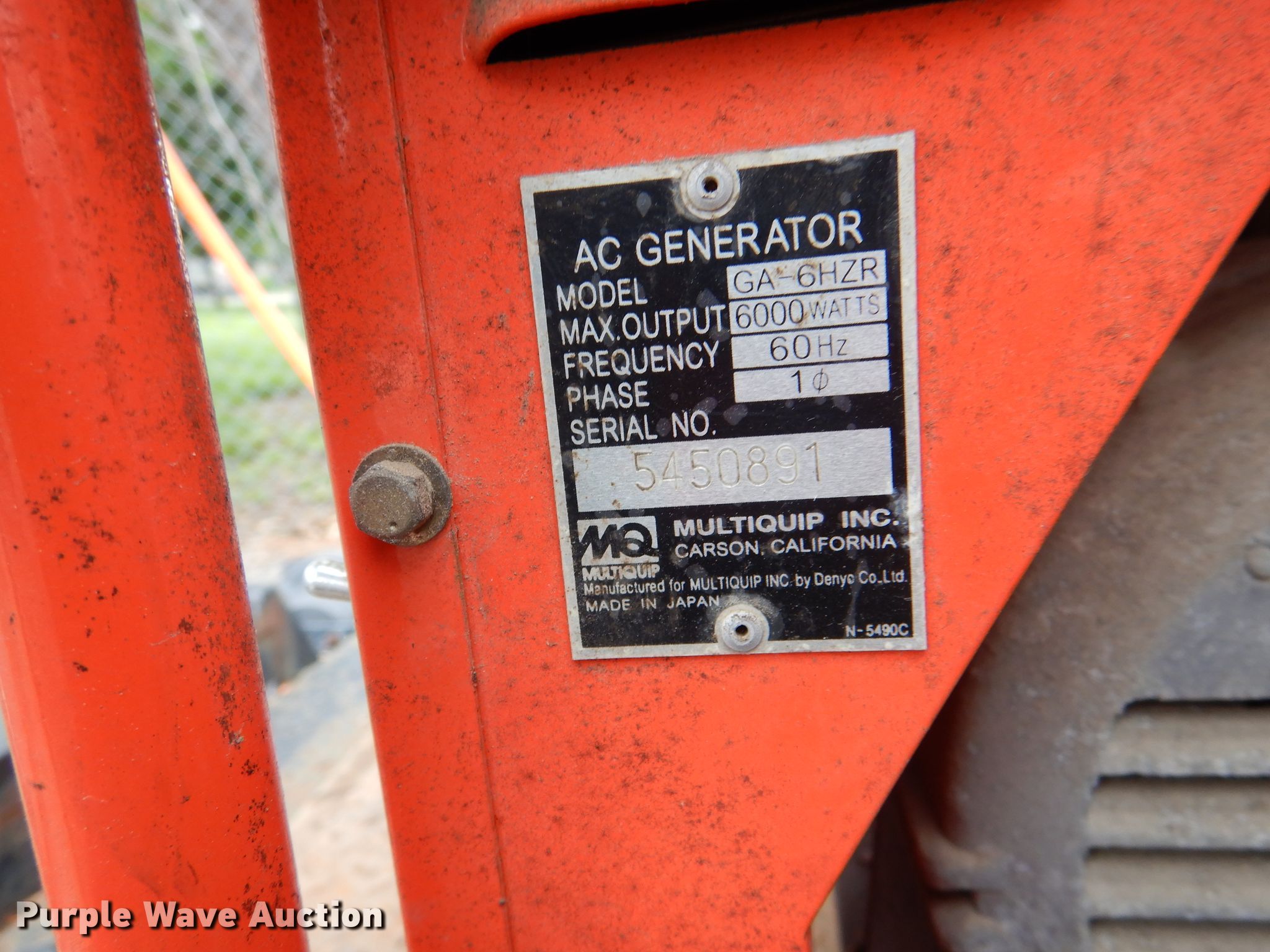 Purple Wave is selling a used Generator Set in Kansas. This item is a Multiquip 6000 generator with the following: Serial: 5450891