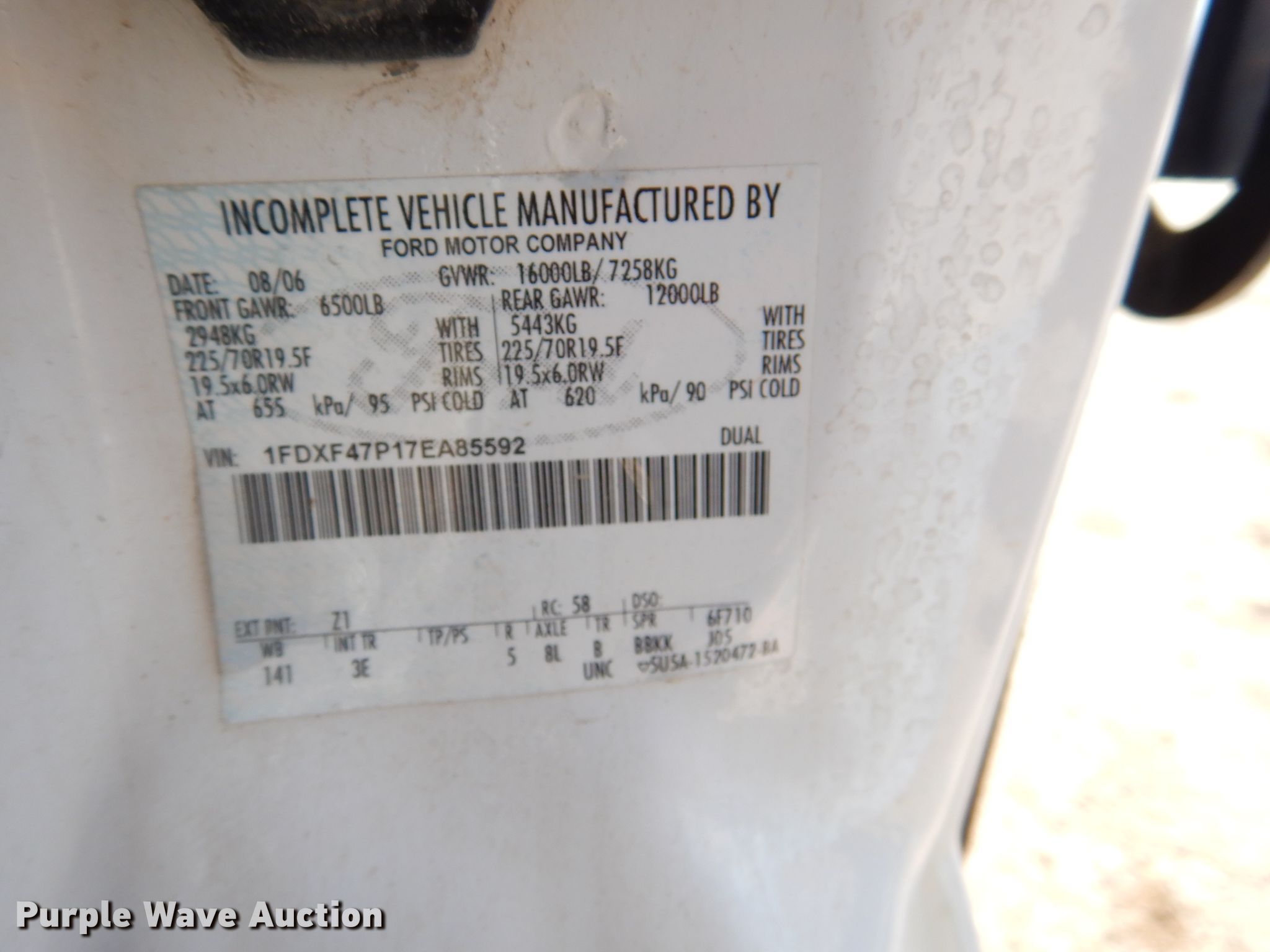 2007 Ford F450 dump truck. 93,076 miles on odometer. Engine Displacement: 6.0L V8 OHV 32V, Cylinders: 8, Fuel type: Diesel. Transmission Automatic. Chassis Axles: Single, Suspension: Spring, Brakes: Hydraulic, PTO, GVWR: 16,000 lbs, Wheelbase: 141". Interior AC, Heat, Power windows, Cruise control. Operational Dump bed 9' L x 96" W, Ram: Single , End gate: Manual, Plow Boss, Width: 92". Tires Size: 225/70R19.5. Notes Bad engine, Non-operational unit. Kansas title. 1FDXF47P17EA85592. Jackson County Noxious Weed. 24569 Us-75 Hwy. Holton, KS 66436