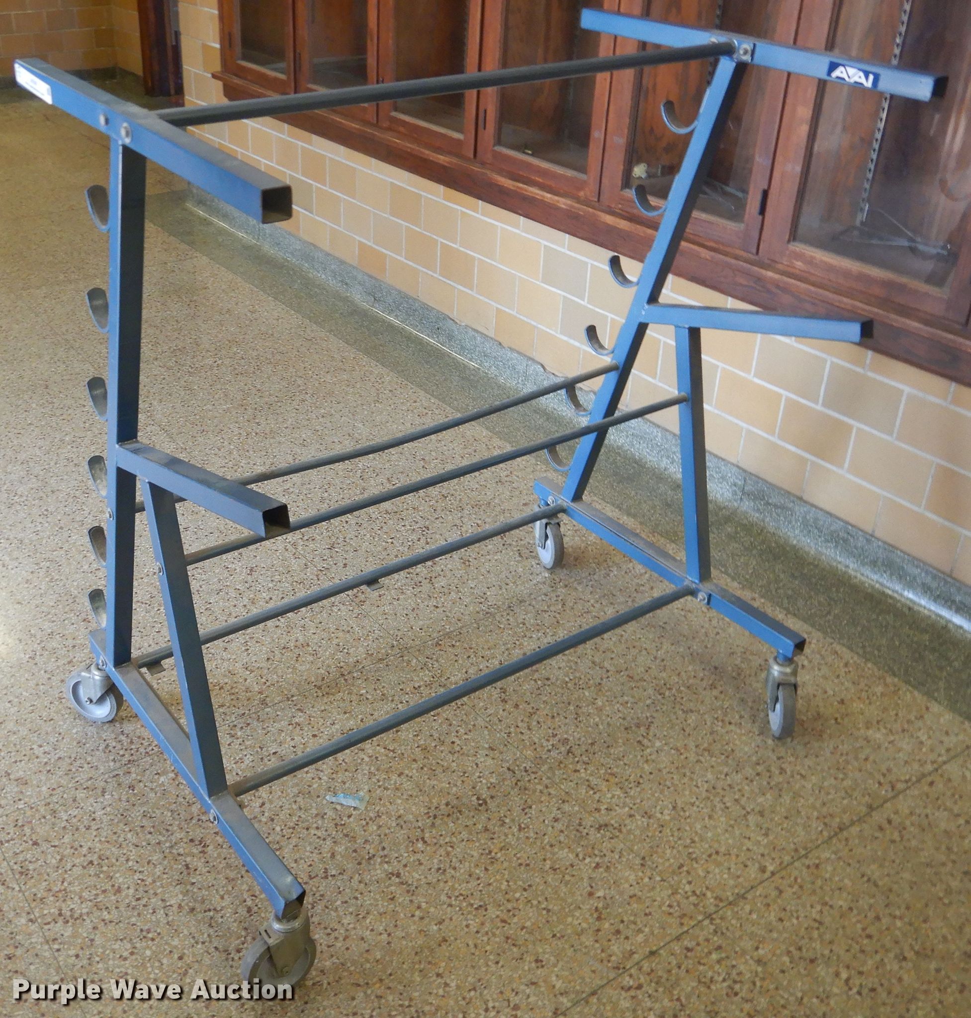 Sporting equipment. Volleyball pole rack 4'W, Holds 6 poles, Toss-back Varsity 100. USD 382 Pratt. 401 S Hamilton St. Pratt, KS 67124