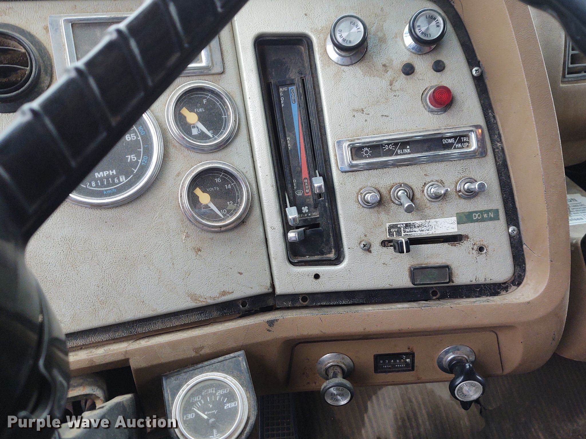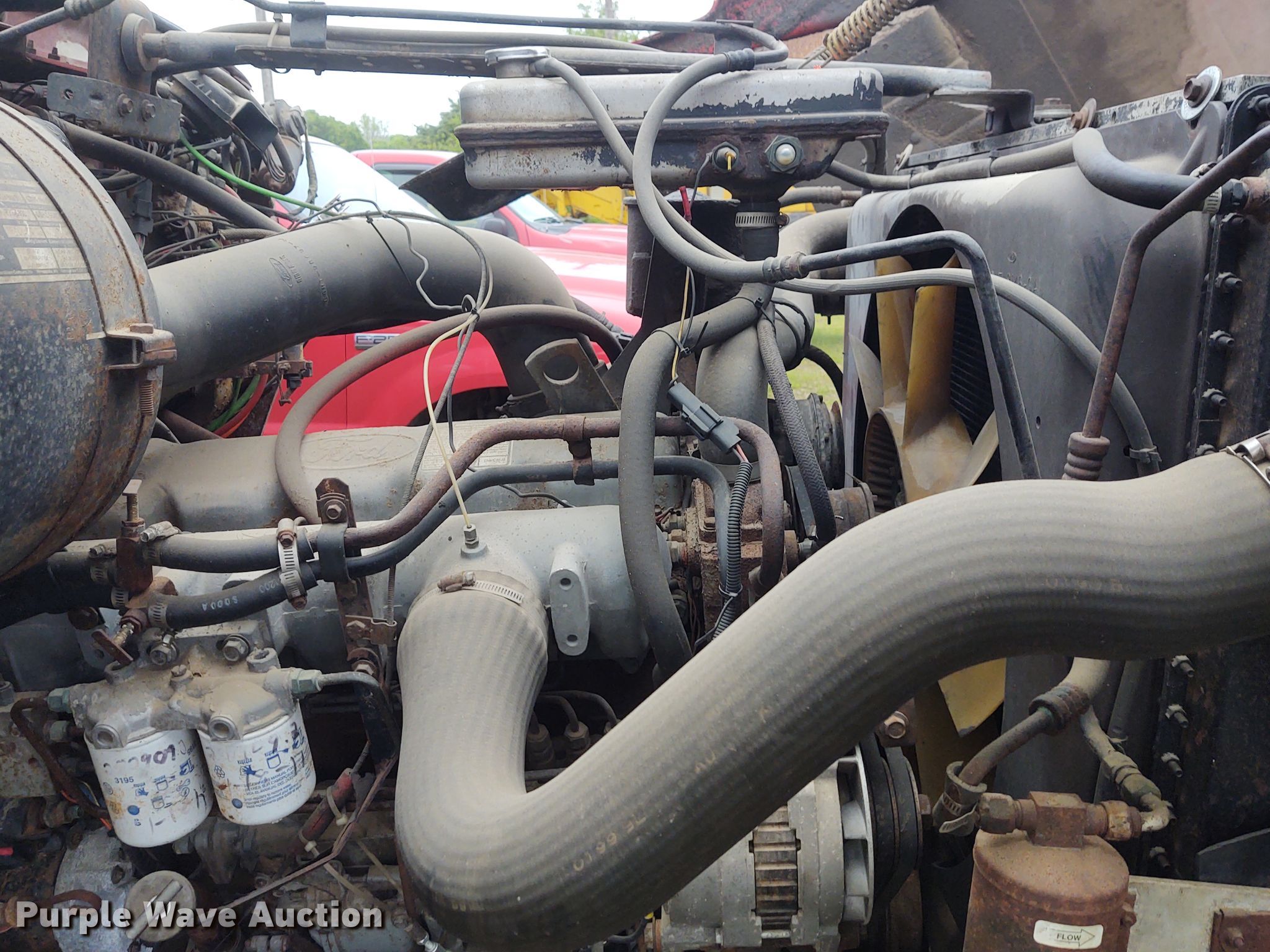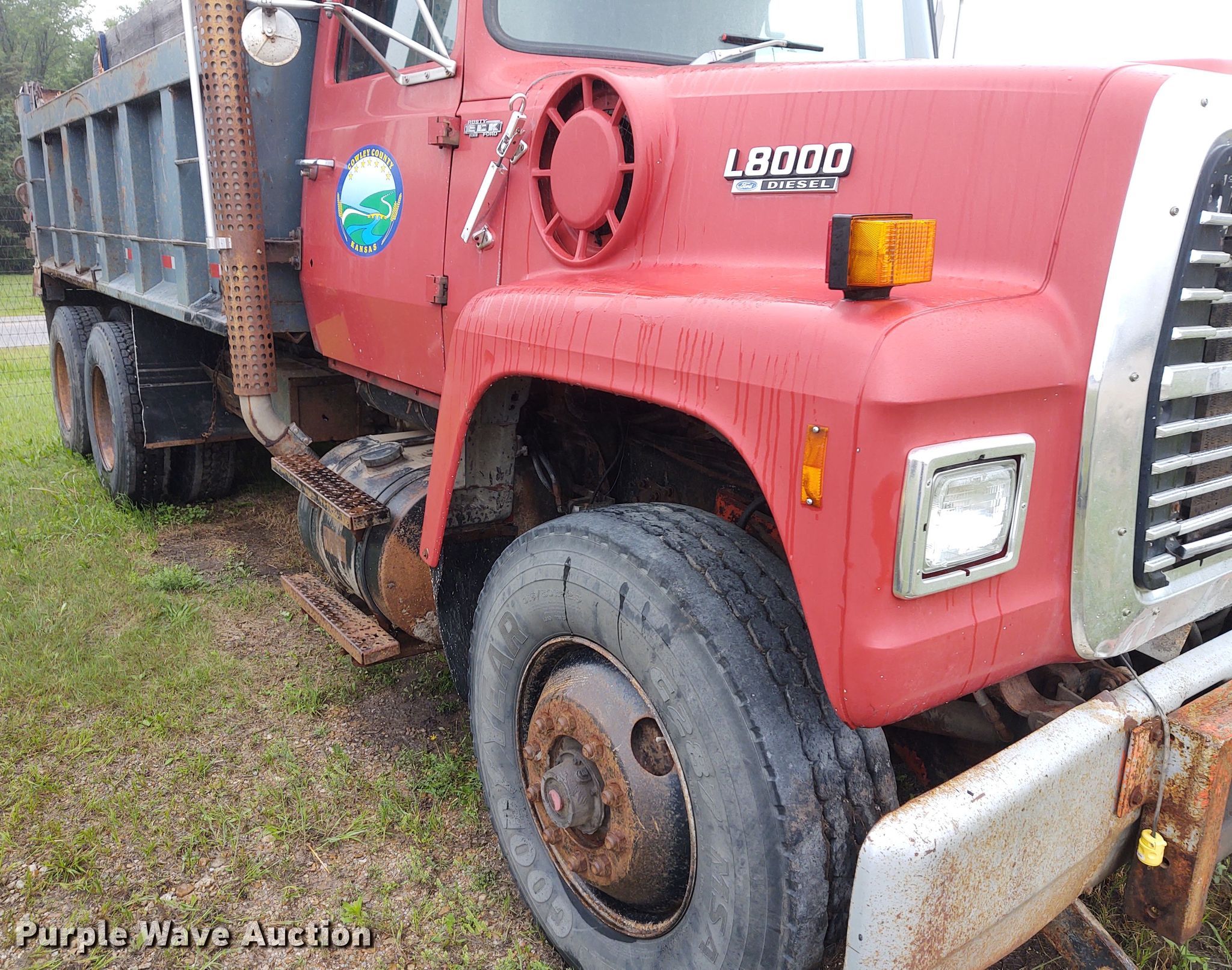 1990 Ford L8000 dump truck. 281,716 miles on odometer. Engine Displacement: 7.8L, Cylinders: 6, Fuel type: Diesel. Transmission Automatic. Chassis Axles: Tandem, Suspension: Spring, Brakes: Air, PTO. Interior Heat. Operational Dump bed Henderson HD15, Width: 96", Side height: 44", Bed type: Steel, Ram: Single , End gate: Air operated. Tires Front: 215/90R22.5, Rear: 11R22.5. Notes Dead batteries, PTO weak. Kansas title. 1FDZU82A4LVA24014. Colwey County Public Works. Winfield, KS 67156
