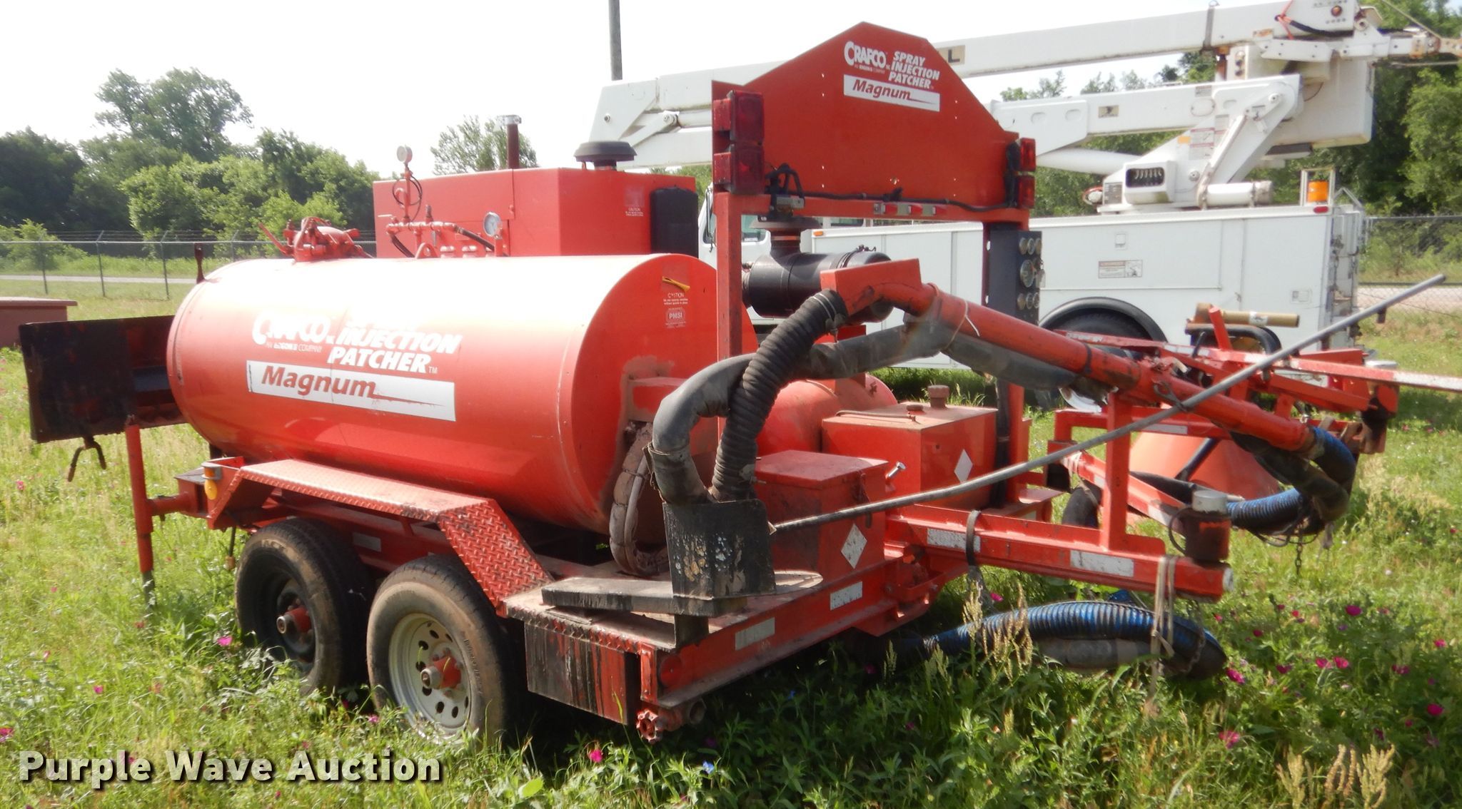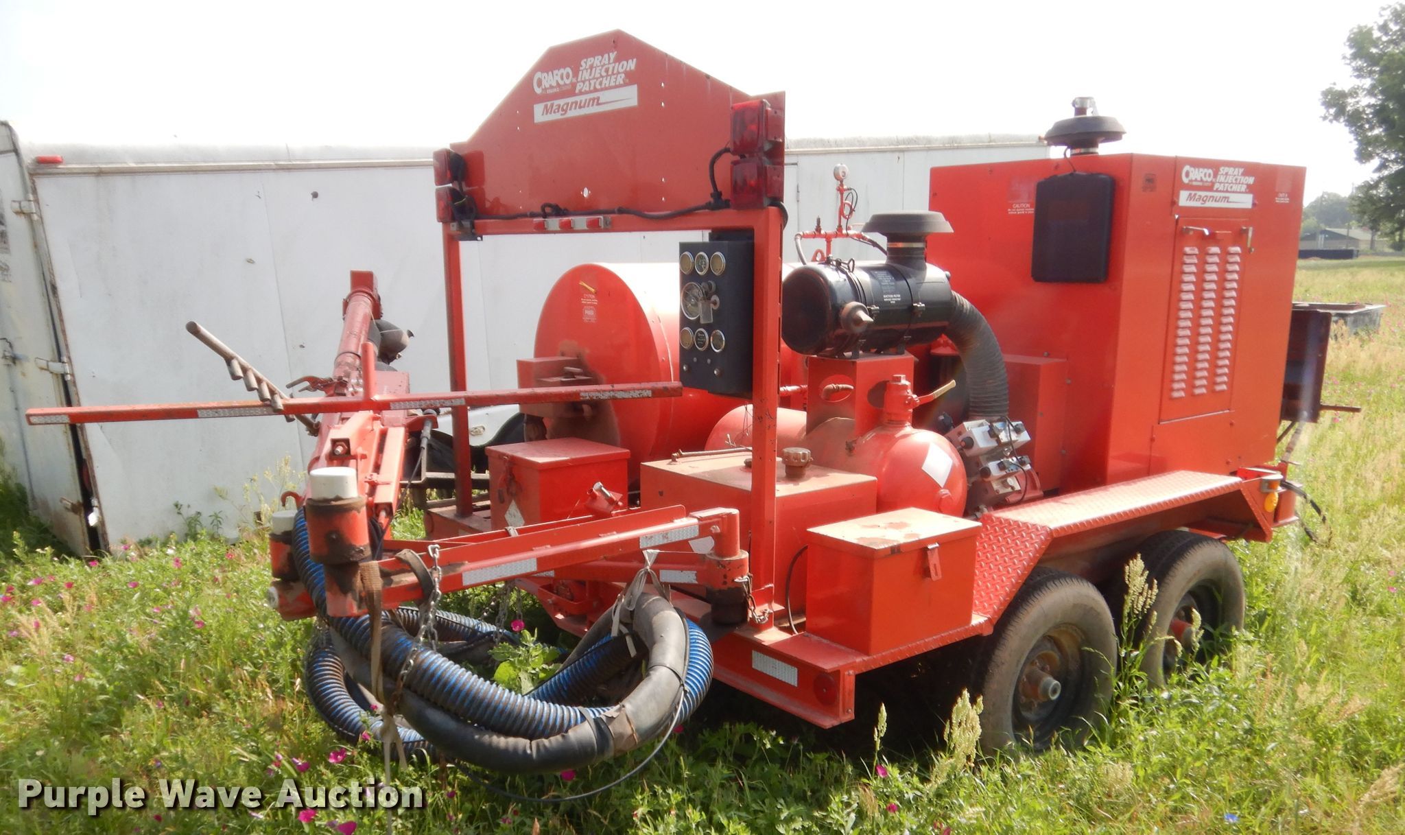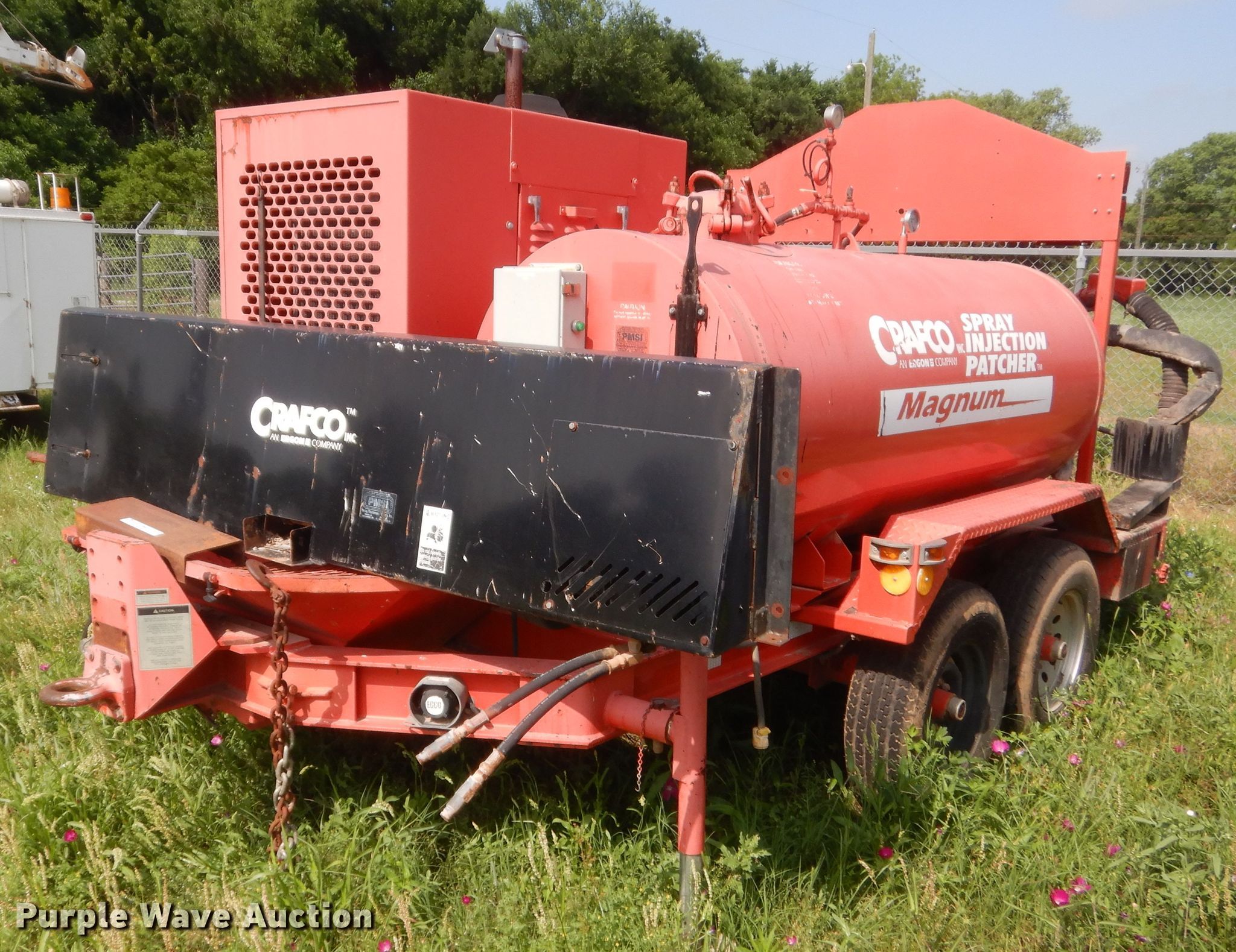 Purple Wave is selling a used Pot Hole Patcher in Oklahoma. This item is a 2003 Crafco Magnum spray injection patcher with the following: 157 hours on meter, 17'L x 102"W, John Deere four cylinder diesel engine, 3" outlet, 9,900 lbs GVWR, Tandem axle, Hitch: Pintle, ST225/75R15