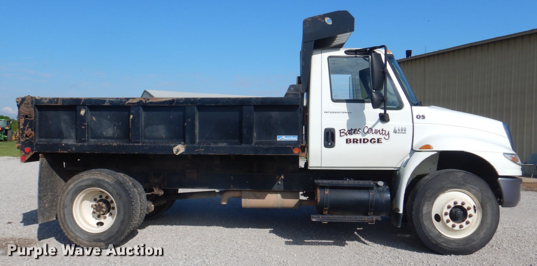 2005 International 4400 dump truck. 109,031 miles on odometer, Engine hours: 4,158. Engine International, Displacement: 7.6L, Cylinders: 6, Fuel type: Diesel. Transmission Automatic. Chassis Axles: Single, Suspension: Spring, Brakes: Air, PTO, GVWR: 13,608 lbs. Interior AC, Heat, Cruise control, Brake controller. Operational Dump bed Warren 0450-12, Capacity: 6 cu.yd., 12' L x 96" W, Side height: 28", Bed type: Steel, Liner, Ram: Single , End gate: Manual. Tires Size: 11R22.5. Notes Windshield chipped or cracked. Missouri title. 1HTMKAAN05H125121. Bates County, MO. 602 NW County Rd 101. Butler, MO 64730