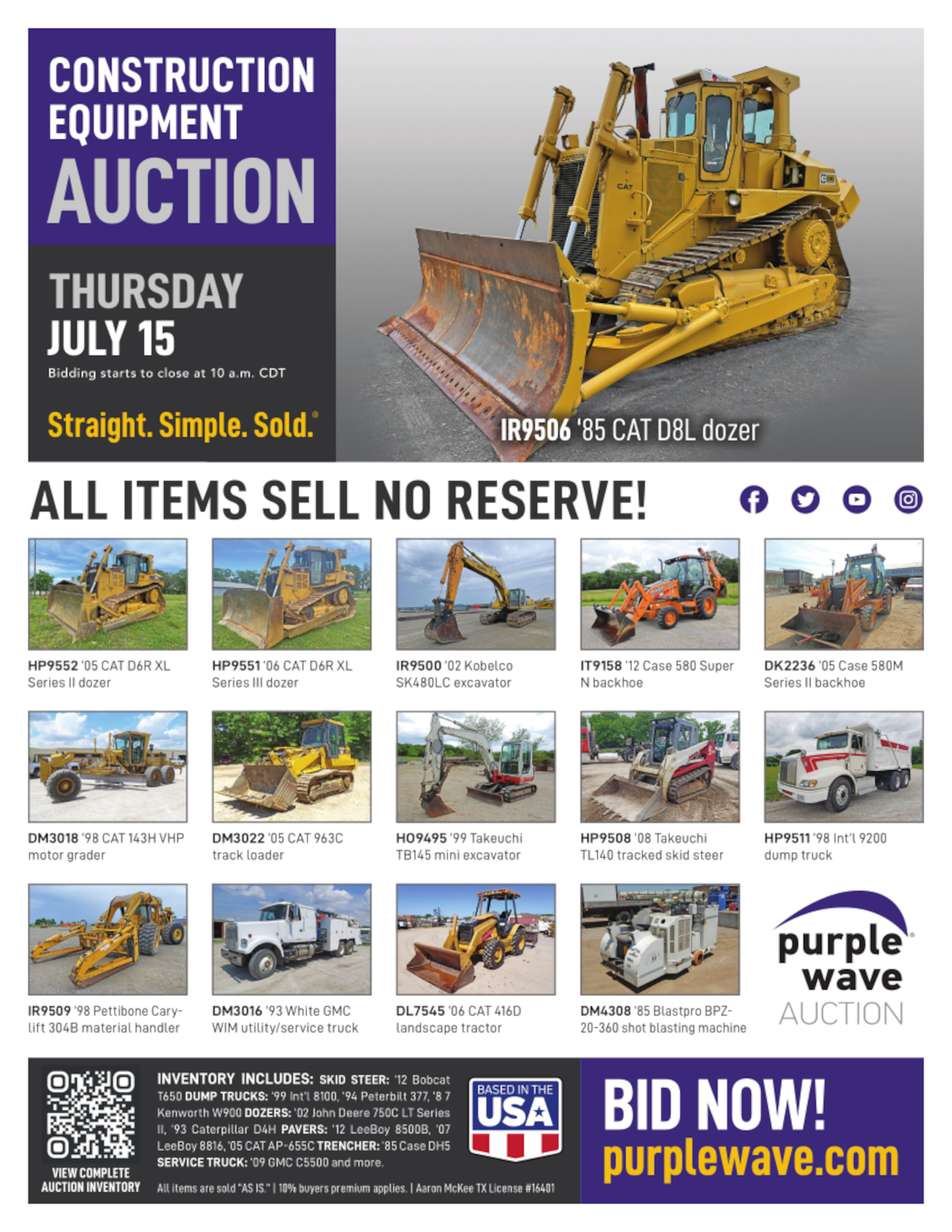 This auction is conducted by Purple Wave, Inc., whose home office is 825 Levee Drive, Manhattan, Kansas. Aaron McKee, Texas auctioneer license # 16401, operates Purple Wave, Inc. Complaints against us may be directed to the Texas Department of Licensing and Regulation, P.O. Box 12157, Austin, Texas 78711, (512) 463-6599. For additional required information, see the attached document.