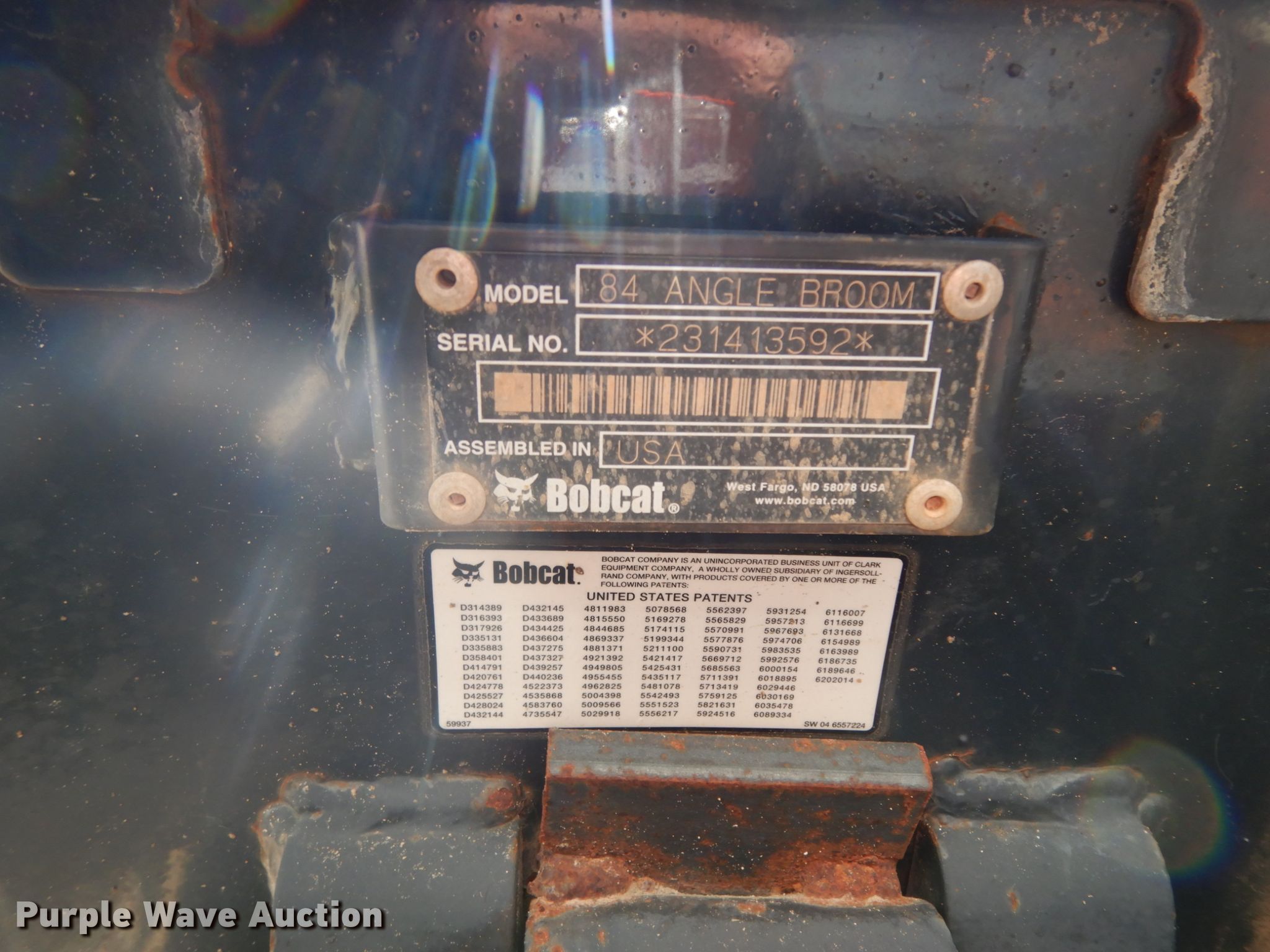 Bobcat 84 broom. 84"W, Poly/wire bristles, Quick connect, Hydraulic angle adjustment, Serial 231413592. Earth Builders, L.P.. 134 Farm To Market Rd 2264. Decatur, TX 76234