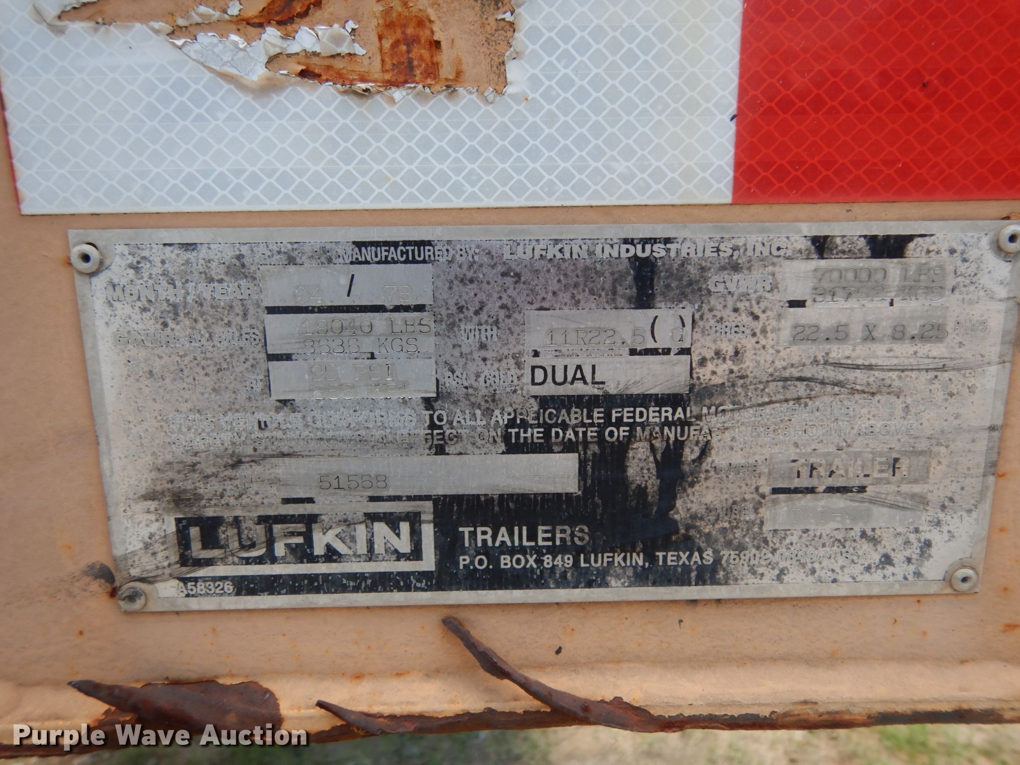 1978 Lufkin flatbed trailer. Dimensions. Overall: 45' 3" L x 8'1" W. Operational Deck type: Wood. Chassis Landing gear: Dual, Suspension: Spring, Brakes: Air, Axles: Tandem, GVWR: 70,000 lbs, GAWR: 19,040 lbs. Tires Steel wheels. Notes Size: 10R/20, 11R22.5. Minnesota title. 51568. Earth Builders, L.P.. 134 Farm To Market Rd 2264. Decatur, TX 76234