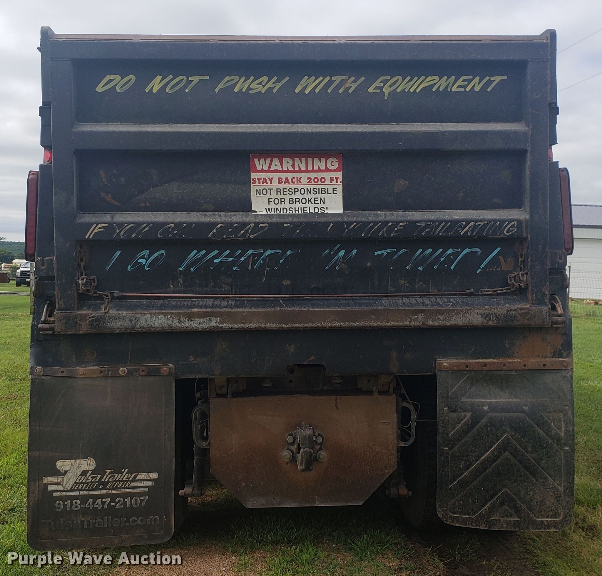 1999 International 8100 dump truck. 129,476 miles on odometer, Unit #: 129. Engine International, Cylinders: 6, Fuel type: Diesel. Transmission Eaton Fuller, Manual, Speed: 10. Chassis Axles: Tandem, Differential lock: Inter-axle, Suspension: Air, Brakes: Air, PTO, GVWR: 52,000 lbs FAWR: 12,000 lbs, IAWR: 20,000 lbs, RAWR: 20,000 lbs, Wheelbase: 166". Interior AC, Heat, Power windows, Cruise control. Operational Dump bed Shop built, 13' L x 96" W, Side height: 36", Side board height: 6", Bed type: Steel, Roll tarp, Ram: Single , End gate: Air operated. Tires Front: 285/75R24.5, Rear: 11R22.5. Oklahoma rebuilt salvage title. 1HSHCAHR0XH213486. Quality Hauling. 6672 Grey Fox Rd. Sperry, OK 74073