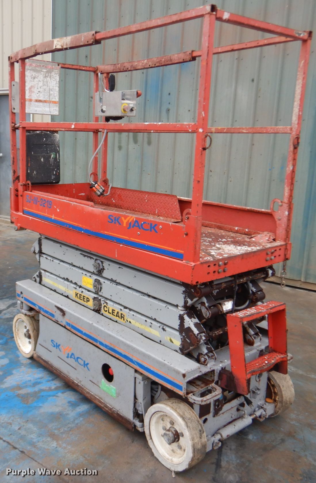 Skyjack SJIII 3219 scissor lift. 240 hours on meter. Electric Motor Volts: 24. Operational Maximum lift capacity: 550 lbs, Maximum lift height: 25', Platform: 60" L x 30" W, Controls: Platform, Platform extensions: Manual. Tires Tire size: 200x8, Solid. Crawford Equipment, Inc... 232 Carter Rd. Mayfield, KY 42066
