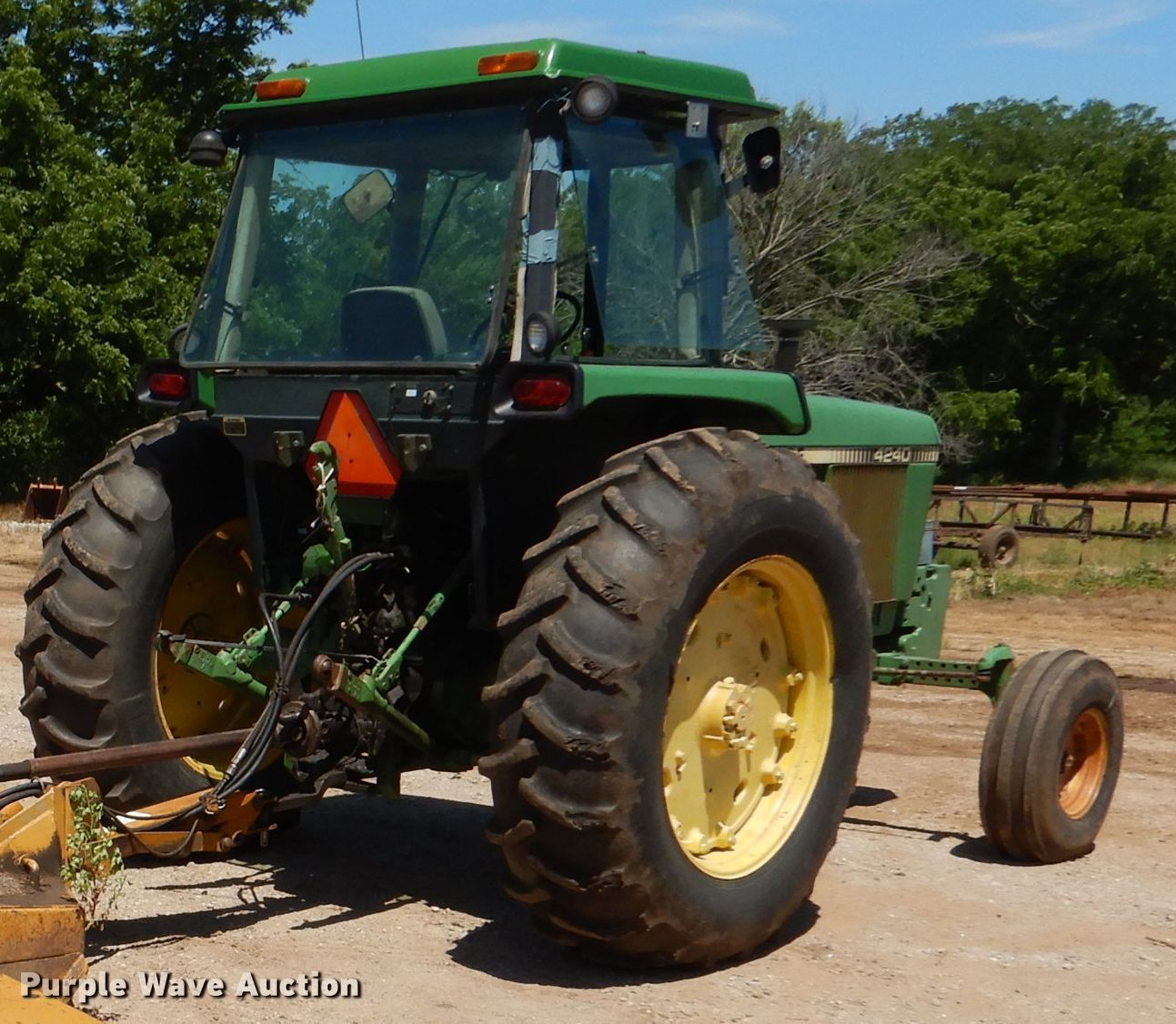 1982 John Deere 4240 tractor. 9,789 hours on meter, Serial: 026487RW. Engine John Deere, Cylinders: 6, Fuel type: Diesel. Transmission Powershift, 8F - 4R, Differential lock. Operators station AC, Heat. Operational PTO: 540, 1000, Three point Top link, Hydraulic remote sets Rear: 3, Suitcase weights: 10. Tires Front: 10.00-16, Rear: 18.4-38. Notes Mower not included. Bobcat Oilfield Service Inc.. Wellsville, KS 66092