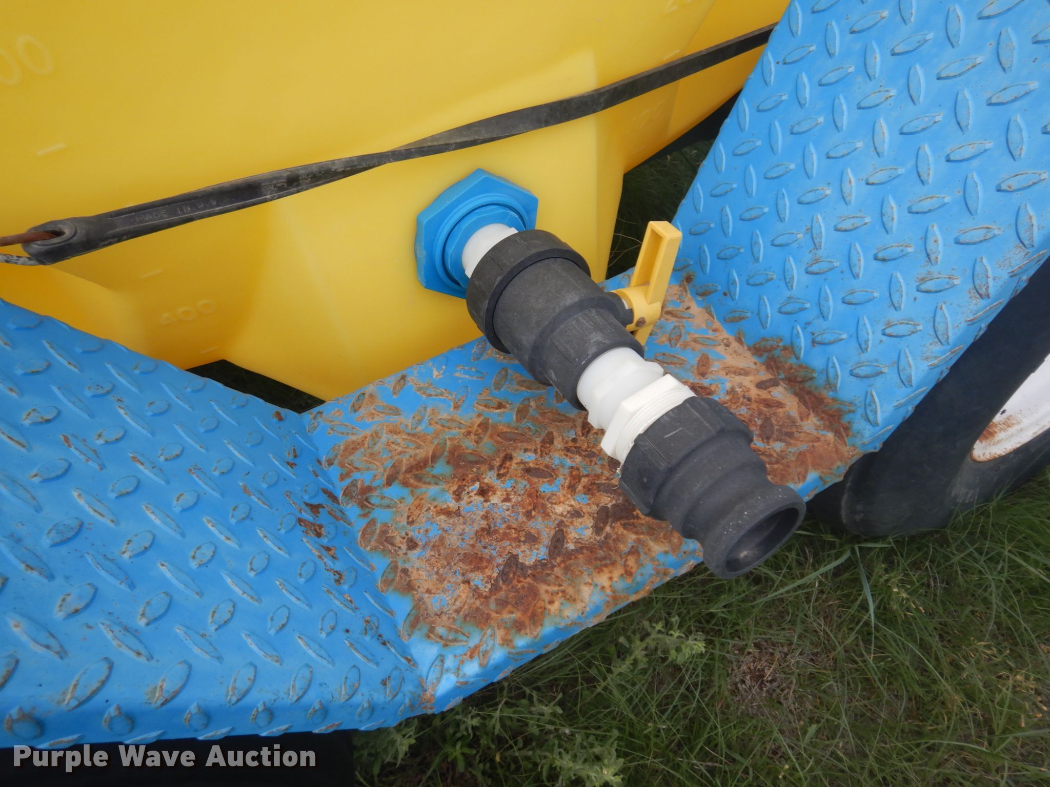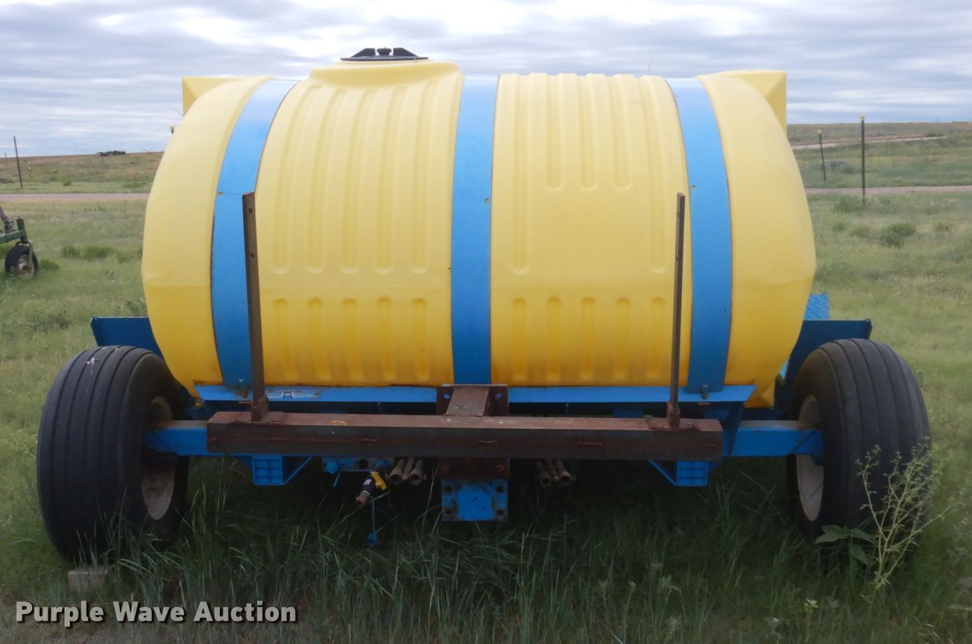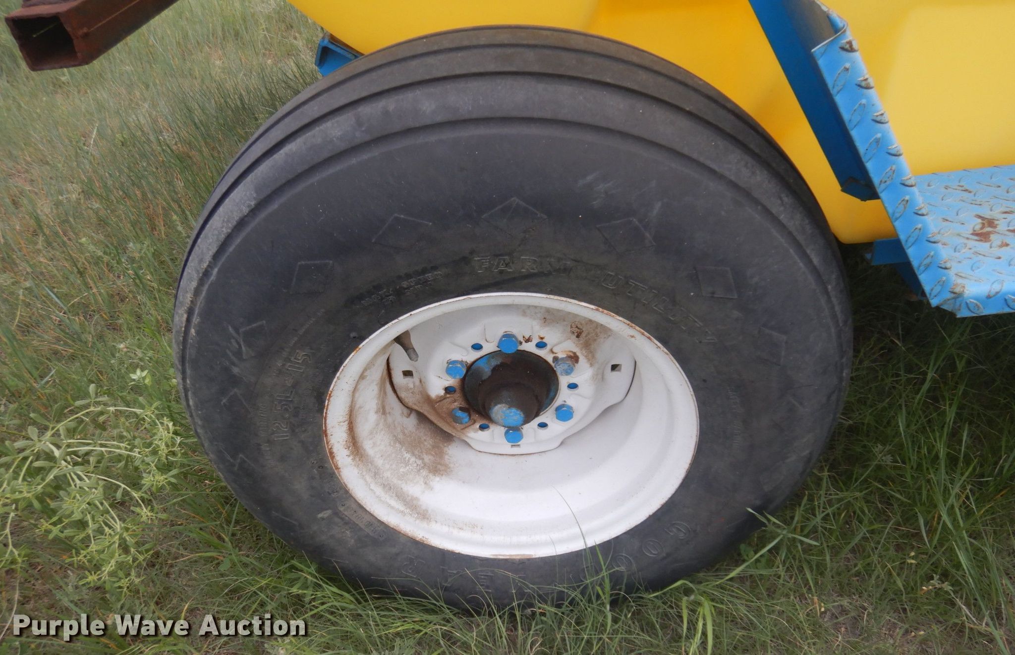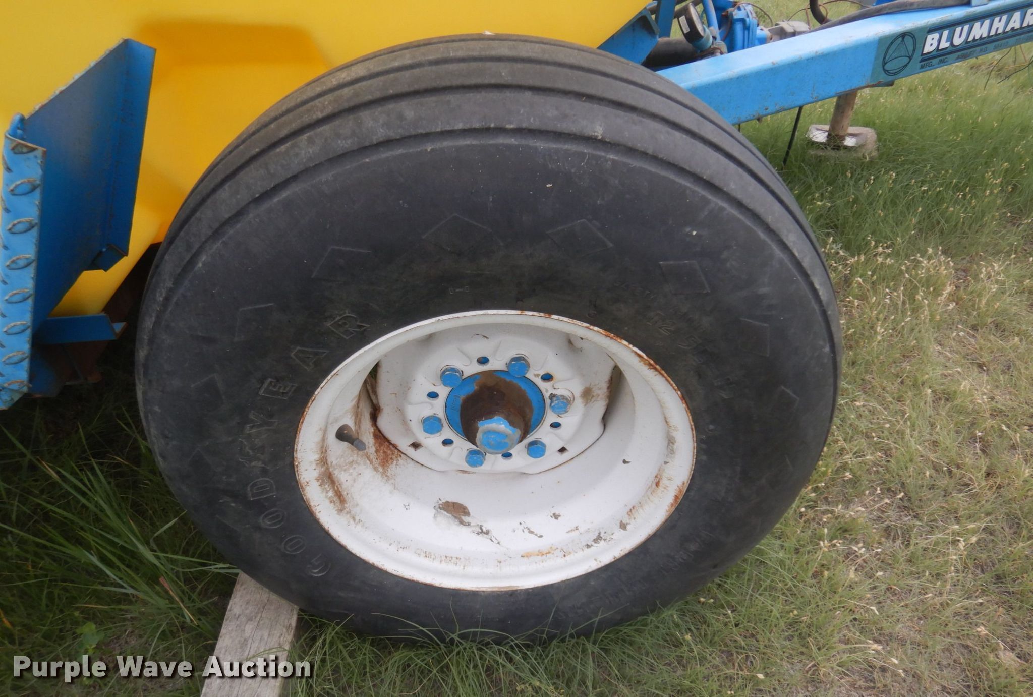 Blumhardt 43584 nurse tank trailer. Serial: 0691001405. Dimensions Overall: 14' x 108" W. Operational Gallon capacity: 1,000. Chassis Landing gear: Single, Axles: Tandem. Tires Steel wheels, Size: 12.5L-15. Notes Unknown operating condition. Hansen Farms. 55137 Co Rd 33. Genoa, CO 80818