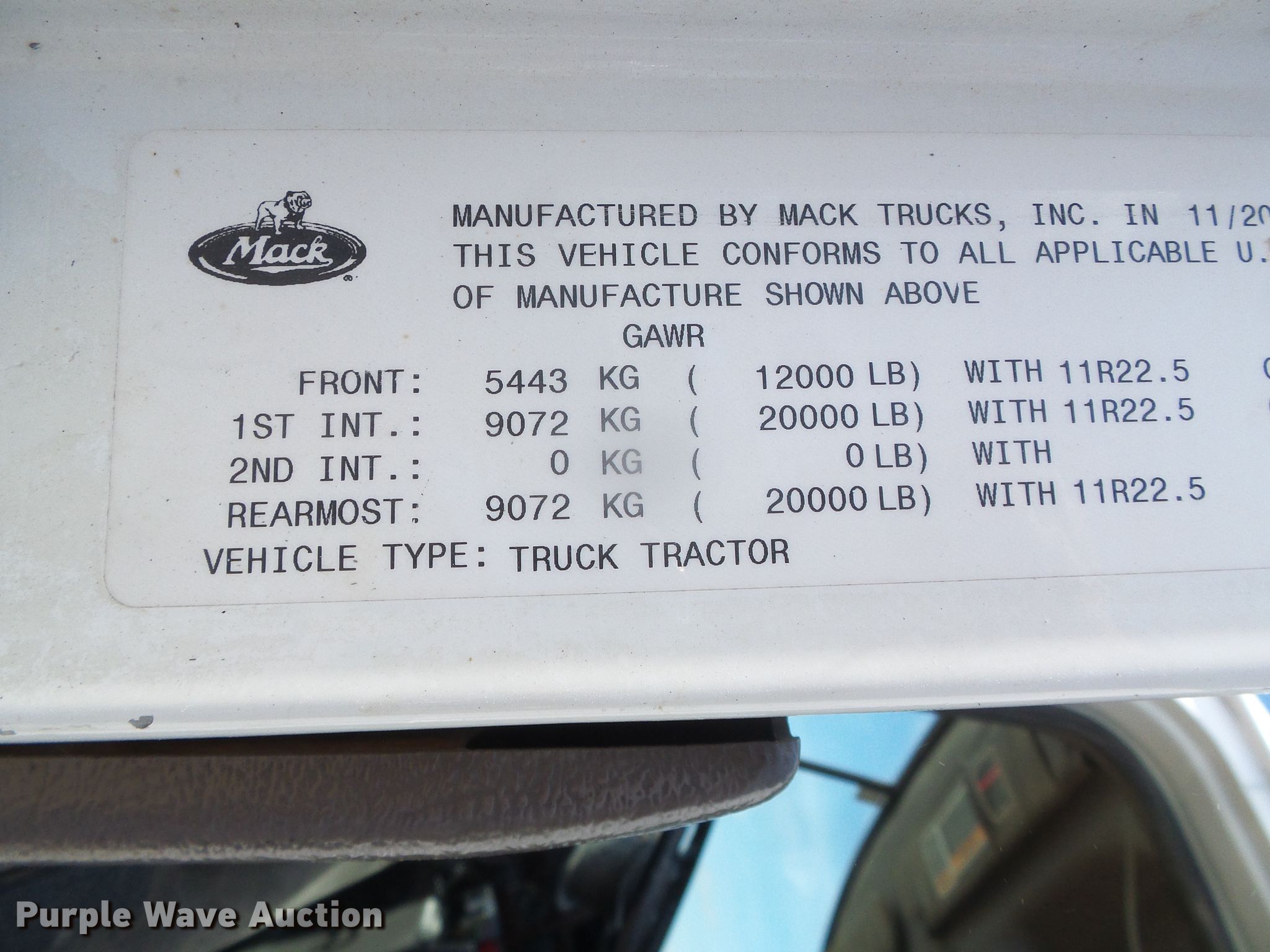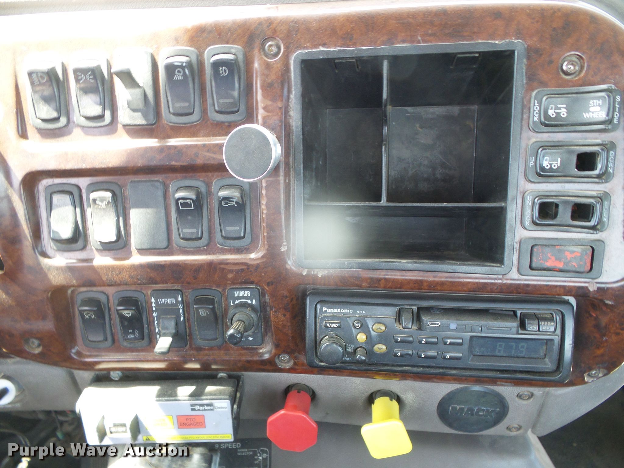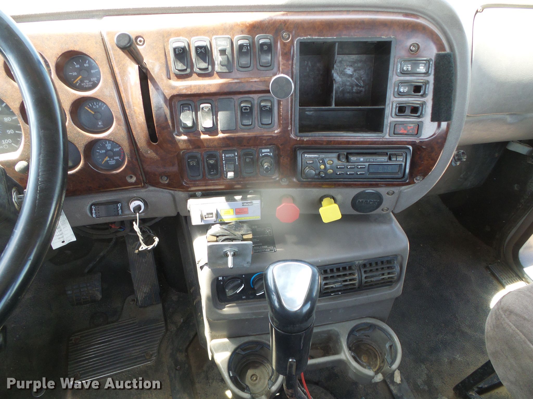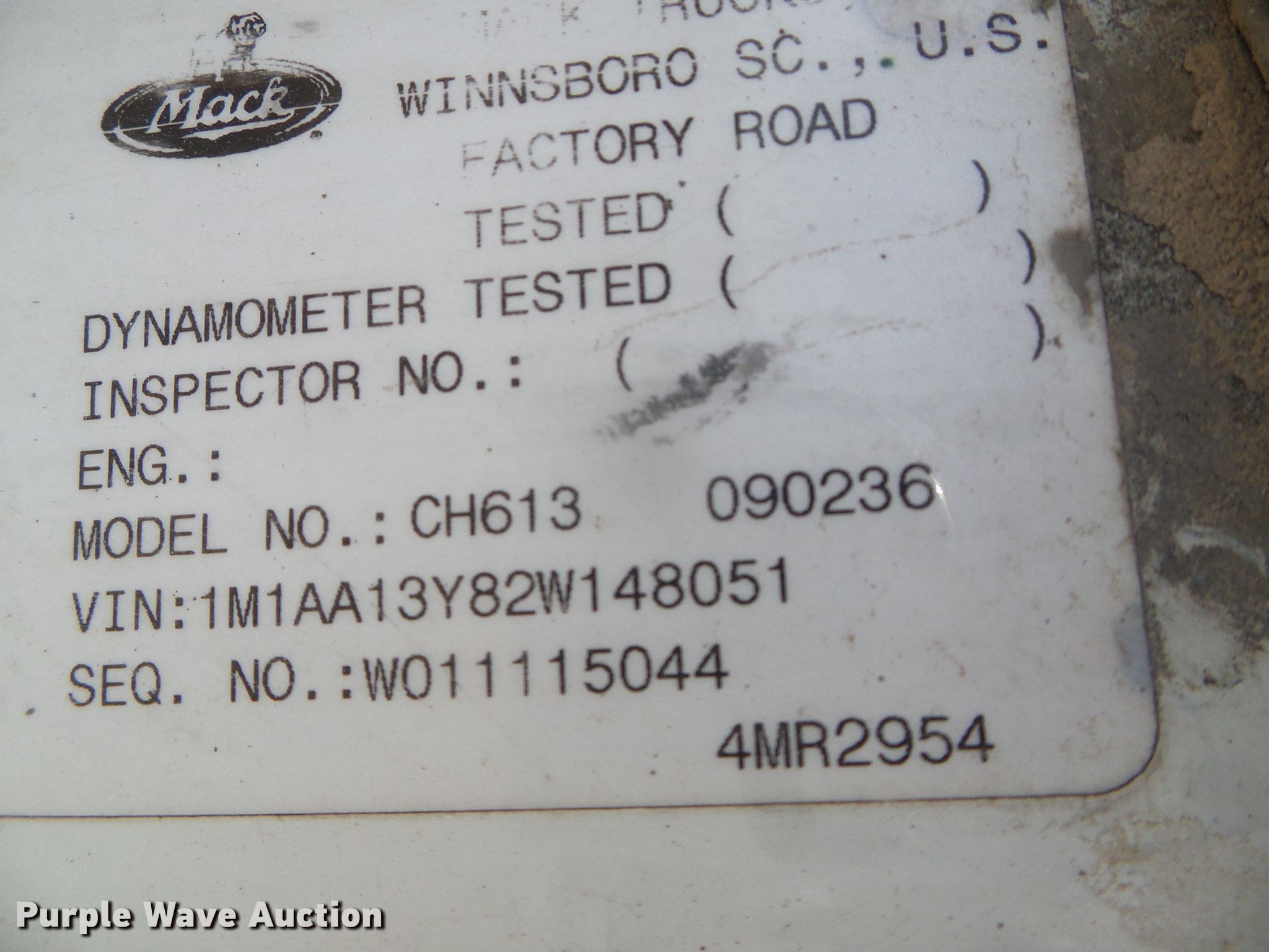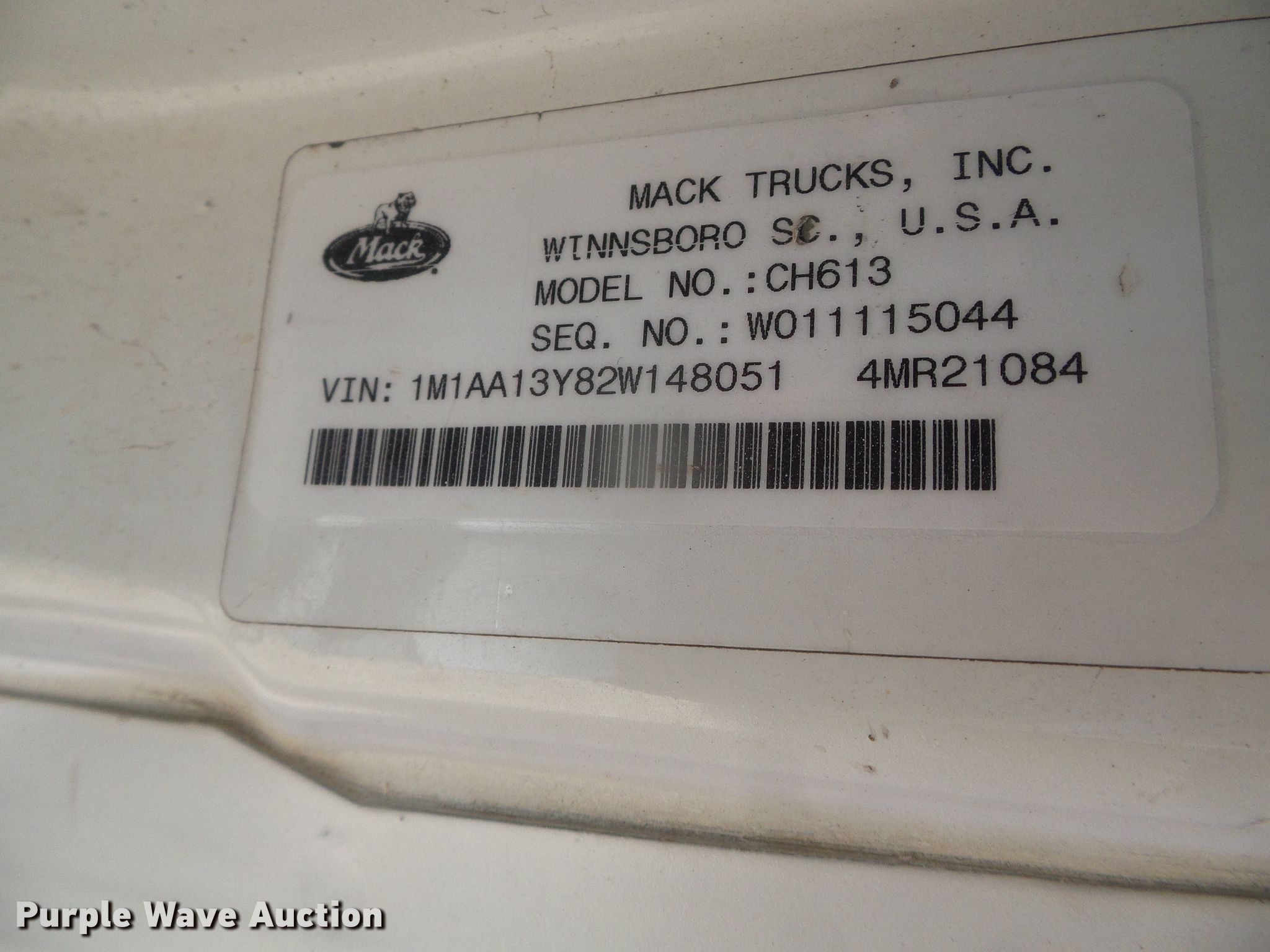 2002 Mack CH600 semi truck. 790,055 miles on odometer, Engine hours: 26,913. Engine Mack E7-355/380, Serial: YMKXH11.9H56, Displacement: 12.0L, Cylinders: 6, Fuel type: Diesel. Transmission Manual, Speed: 9. Chassis Axles: Tandem, Suspension: Air, Brakes: Air, Wet kit, GVWR: 52,000 lbs FAWR: 12,000 lbs, IAWR: 20,000 lbs, RAWR: 20,000 lbs. Interior AC, Heat, Power windows, Power locks, Cruise control, Air ride cab. Operational Fifth wheel type: Air operated, Sliding, Fuel tank: Dual. Tires Size: 11R22.5. Oklahoma title. 1M1AA13Y82W148051. Envirotec Excavating. 11770 S Pierceville Rd. Pierceville, KS 67868