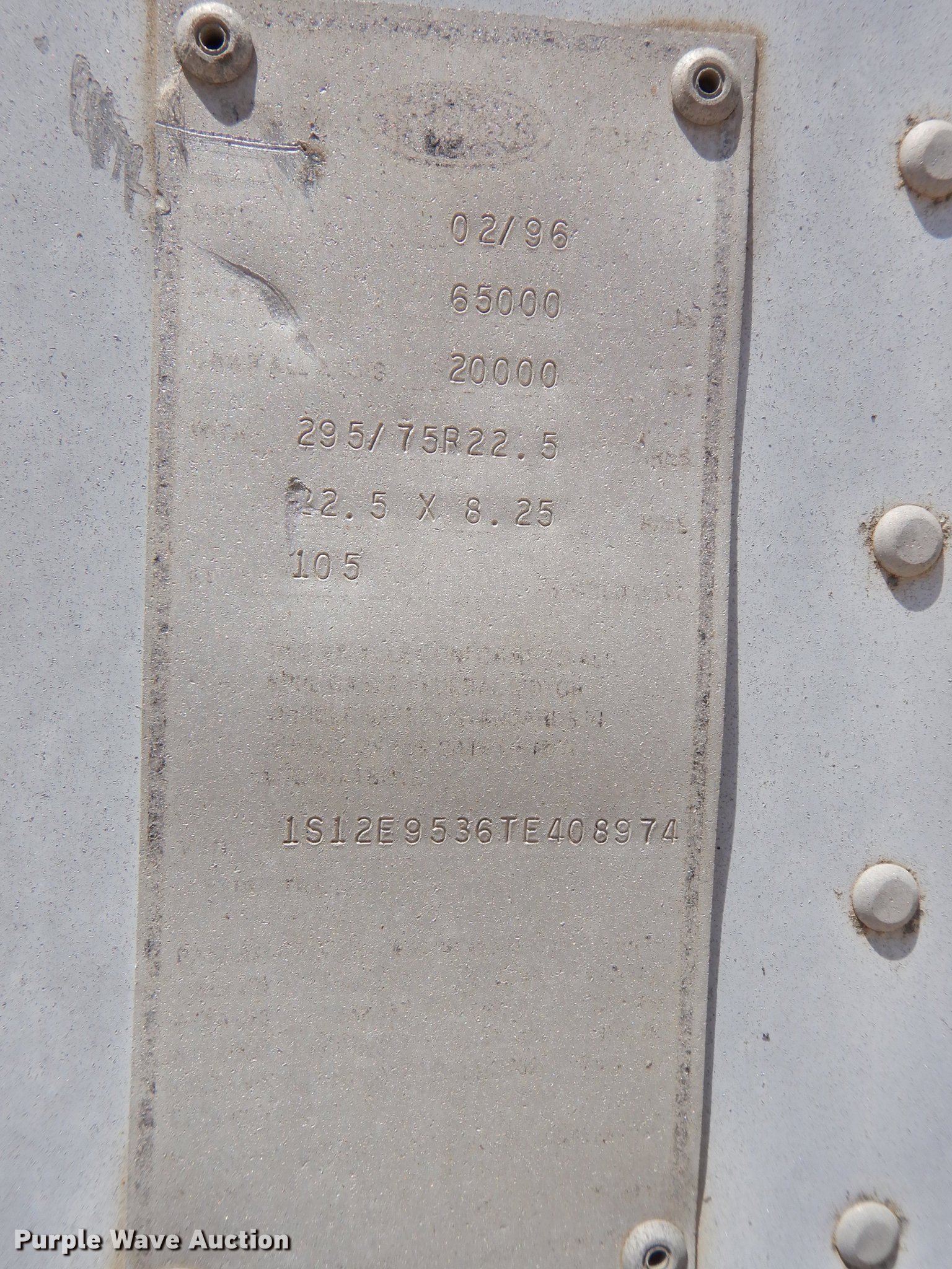 1996 Strick dry van trailer. Unit #: 1208. Dimensions Overall: 53' L x 102" W. Operational Deck type: Wood. Chassis Landing gear: Dual, Manual, Suspension: Air, Brakes: Air, Axles: Tandem, GVWR: 65,000 lbs. Tires Size: 275/80R22.5. Kansas title. 1S12E9536TE408974. 825 Levee Dr. Manhattan, KS 66502