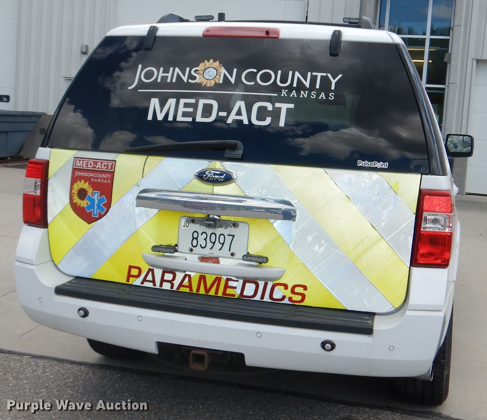 2013 Ford Expedition SUV. 88,846 miles on odometer, Unit #: EMS1191. Engine Displacement: 5.4L V8 SOHC 16V FFV, Cylinders: 8, Fuel type: Gas. Transmission Automatic, Four wheel drive. Interior AC, Heat, Heated mirrors, Power windows, Power locks, Cruise control, Backup camera. Tires Size: 275/65R18. Notes Emergency lights, decals, and equipment not included, will be removed prior to auction. Kansas title. 1FMJU1J56DEF40093. Johnson County. Olathe, KS 66061