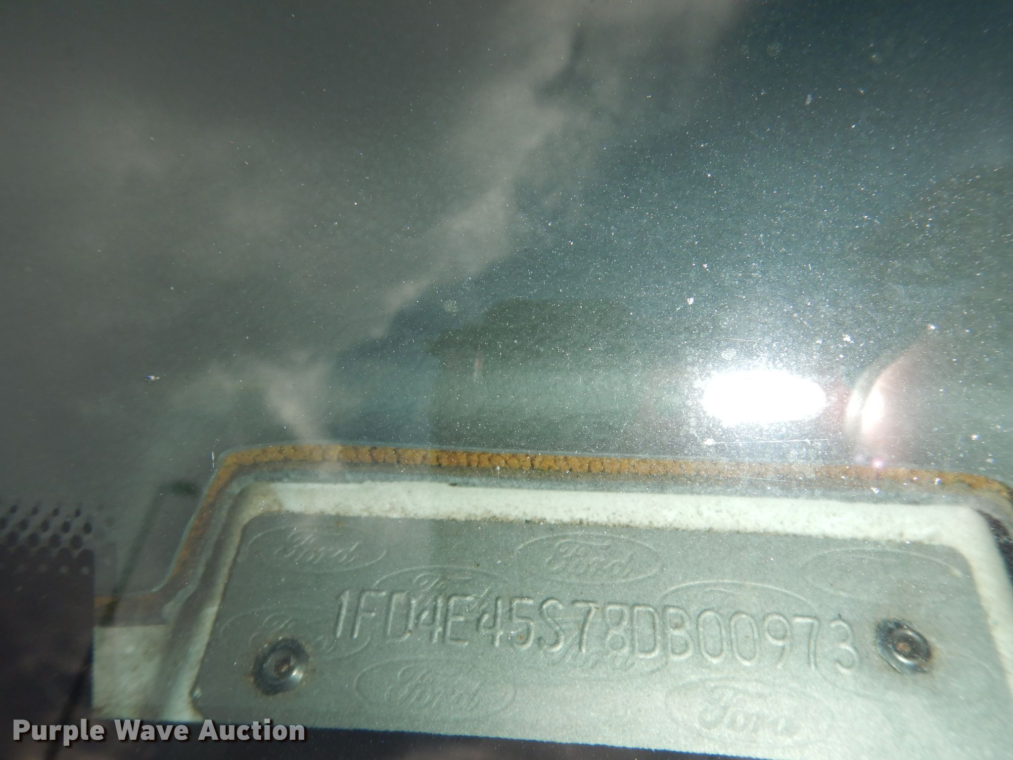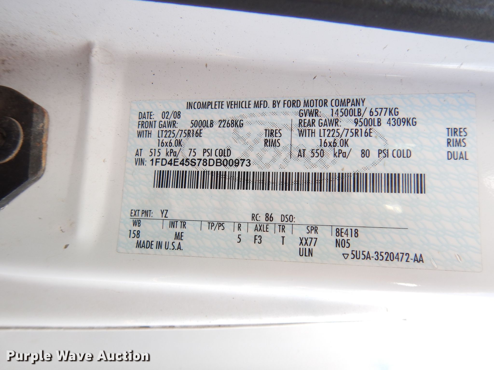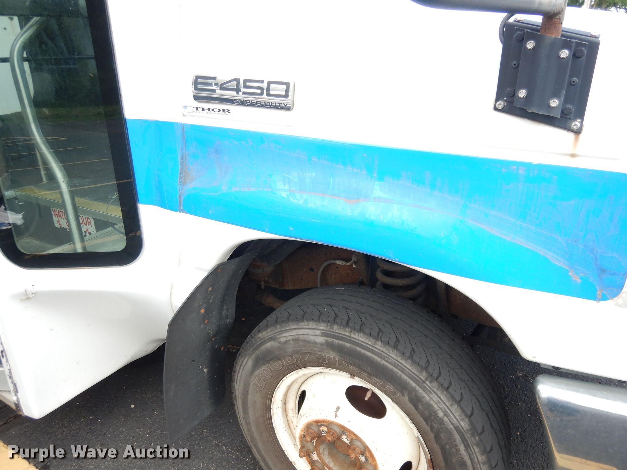 2008 Ford E450 Super Duty shuttle bus. 267,676 miles on odometer. Engine Displacement: 6.8L V10 SOHC 20V, Cylinders: 10, Fuel type: Gas. Transmission Automatic. Chassis Axles: Single, Suspension: Spring, Brakes: Hydraulic, GVWR: 14,500 lbs, Wheelbase: 159". Interior AC, Heat, Passengers: 14, Seats, Wheelchair lift. Tires Size: 225/75R16, Brand: Goodyear. Notes Battery dead, Non-operational hood latch, Unknown operating condition. Kansas title. Mileage has not been verified. Odometer discrepancy will be marked on the title. 1FD4E45S78DB00973. 825 Levee Dr. Manhattan, KS 66502