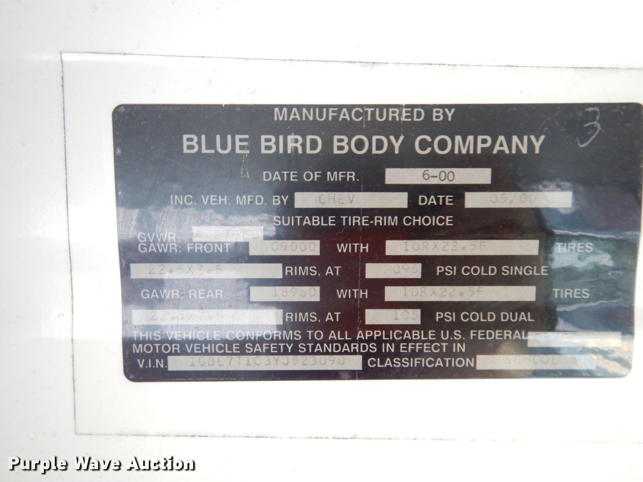 2001 Chevrolet C7H064 school bus. 153,217 miles on odometer, Unit #: 3. Engine Displacement: 7.2L, Cylinders: 6, Fuel type: Diesel. Transmission Automatic. Chassis Axles: Single, Suspension: Spring, Brakes: Hydraulic, GVWR: 27,950 lbs, Wheelbase: 258". Interior Heat, Passengers: 65. Tires Size: 11R22.5, Brand: Michelin. Kansas title. 1GBL7T1C3YJ523090. Winchester, KS 66097