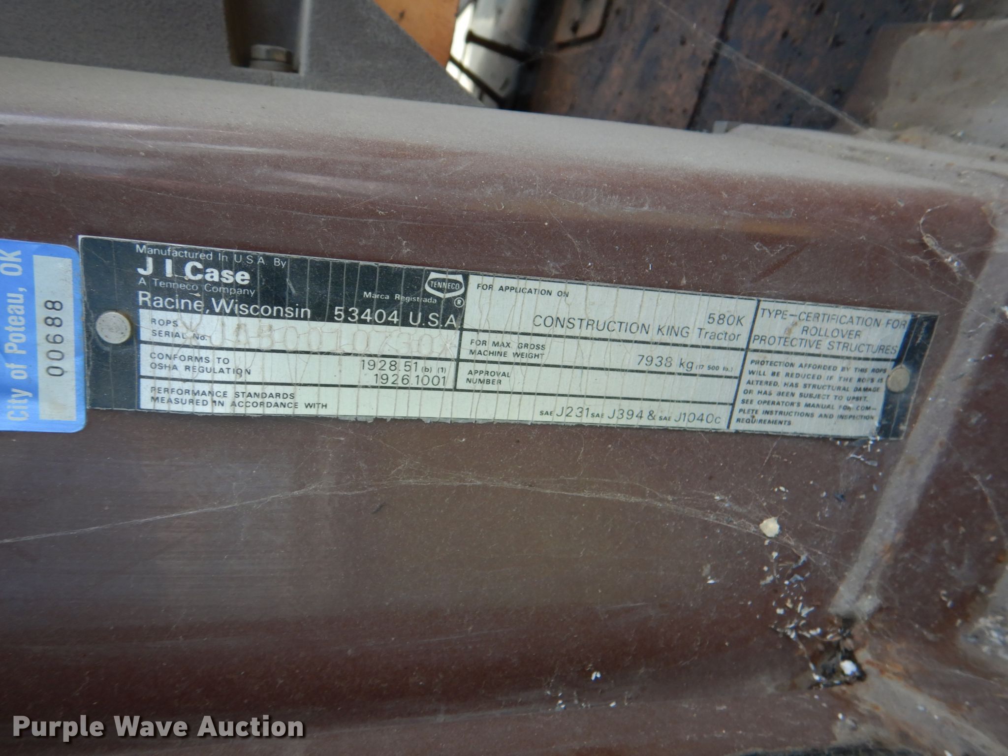 Case 580K backhoe. 7,275 hours on meter. Engine Model: 4-390, Serial: 44416937, Cylinders: 4, Fuel type: Diesel. Transmission Shuttle shift, 4F - 4R. Operators station EROPS AC, Heat, Backhoe controls: Wobble stick / two stick. Operational Loader Bucket Four-in-one, Width: 80", Backhoe Bucket Width: 23", Cutting edge: Bolt-on, Teeth: 5.. Tires Front: 11L-16, Rear: 19.5L-24. Notes Missing rear corner window, Needs battery, No key, Hydraulic hose broken. City of Poteau. 3001 Scholars Rd. Poteau, OK 74953