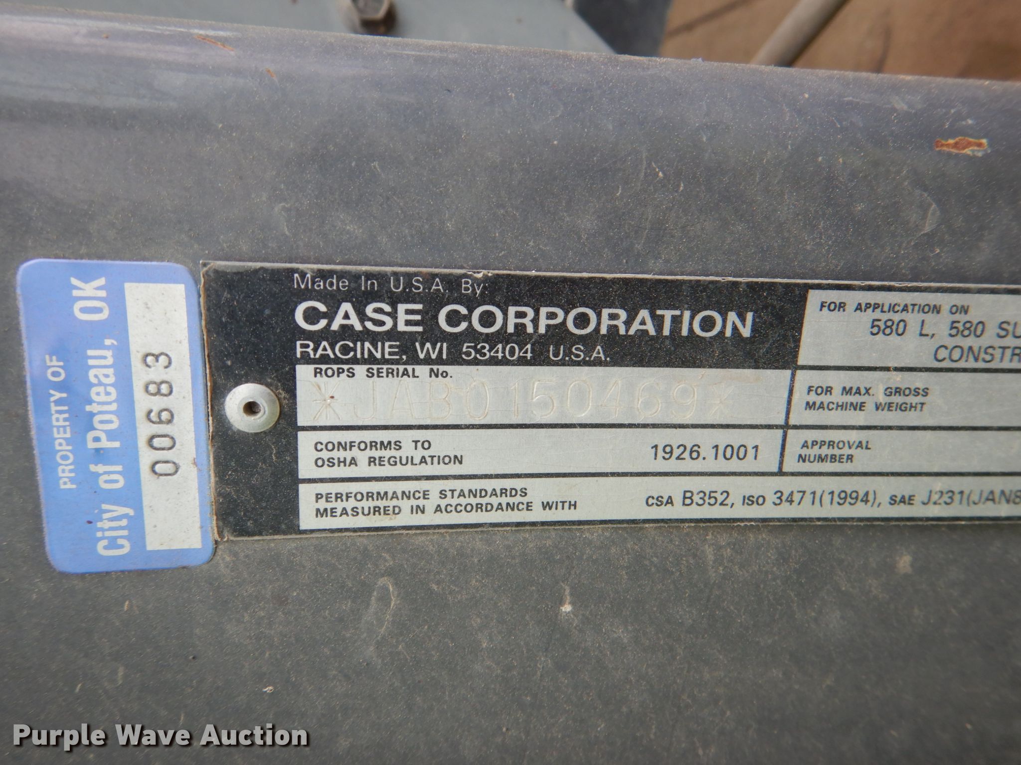 1997 Case 580L backhoe. 8,012 hours on meter, Serial: JJG0234361. Engine Cylinders: 4, Fuel type: Diesel. Transmission Shuttle shift, 4F - 4R. Operators station EROPS AC, Heat, Backhoe controls: Wobble stick / two stick. Operational Loader Four-in-one, Width: 81", Cutting edge: Weld-on, Backhoe Extendable stick, Bucket Width: 23", Cutting edge: Bolt-on, Teeth: 5.. Tires Front: 11L-16, Rear: 19.5L-24. Notes Needs battery, Needs key, Back window missing. City of Poteau. 3001 Scholars Rd. Poteau, OK 74953