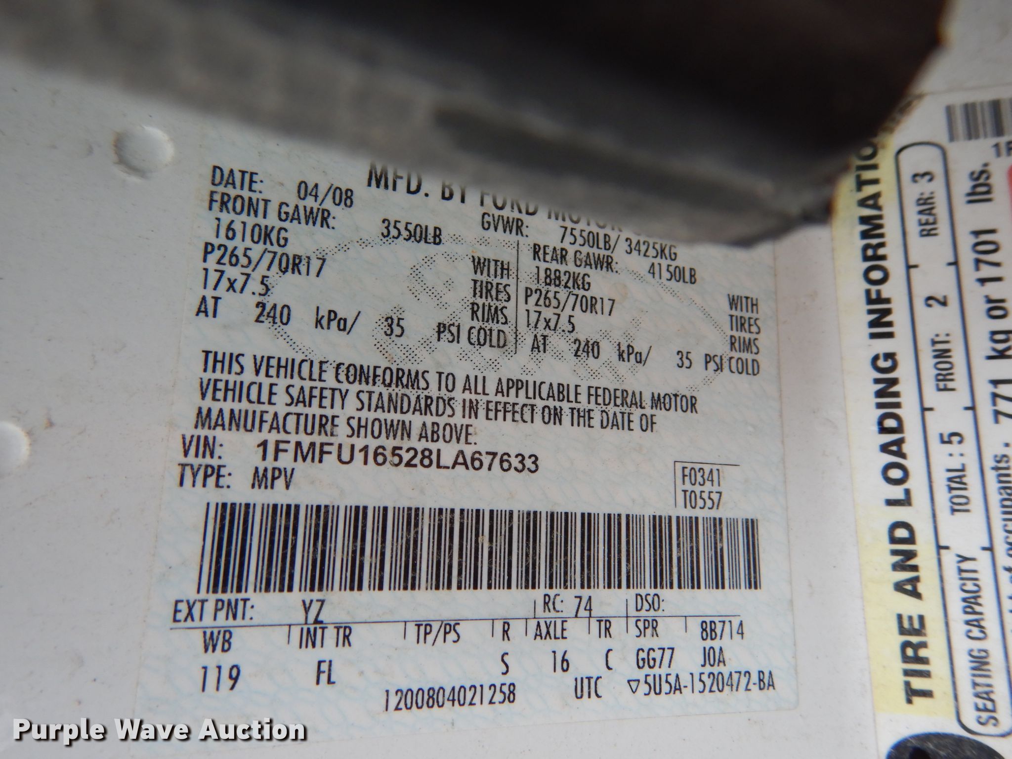 2008 Ford Expedition SUV. 200,433 miles on odometer. Engine Displacement: 5.4L V8 SOHC 16V, Cylinders: 8, Fuel type: Gas. Transmission Automatic, Four wheel drive. Interior AC, Heat, Seat: Power driver, Power windows, Power locks, Cruise control. Tires Size: LT265/70R17. Notes Dash warning indicator: TPMS, Battery not included. Missouri title. Seller is a government entity who will be assigning and distributing the title. Please contact the seller for distribution questions. 1FMFU16528LA67633. Cooper County, MO - Sheriff's Office. 16041 Hwy 5. Boonville, MO 65233