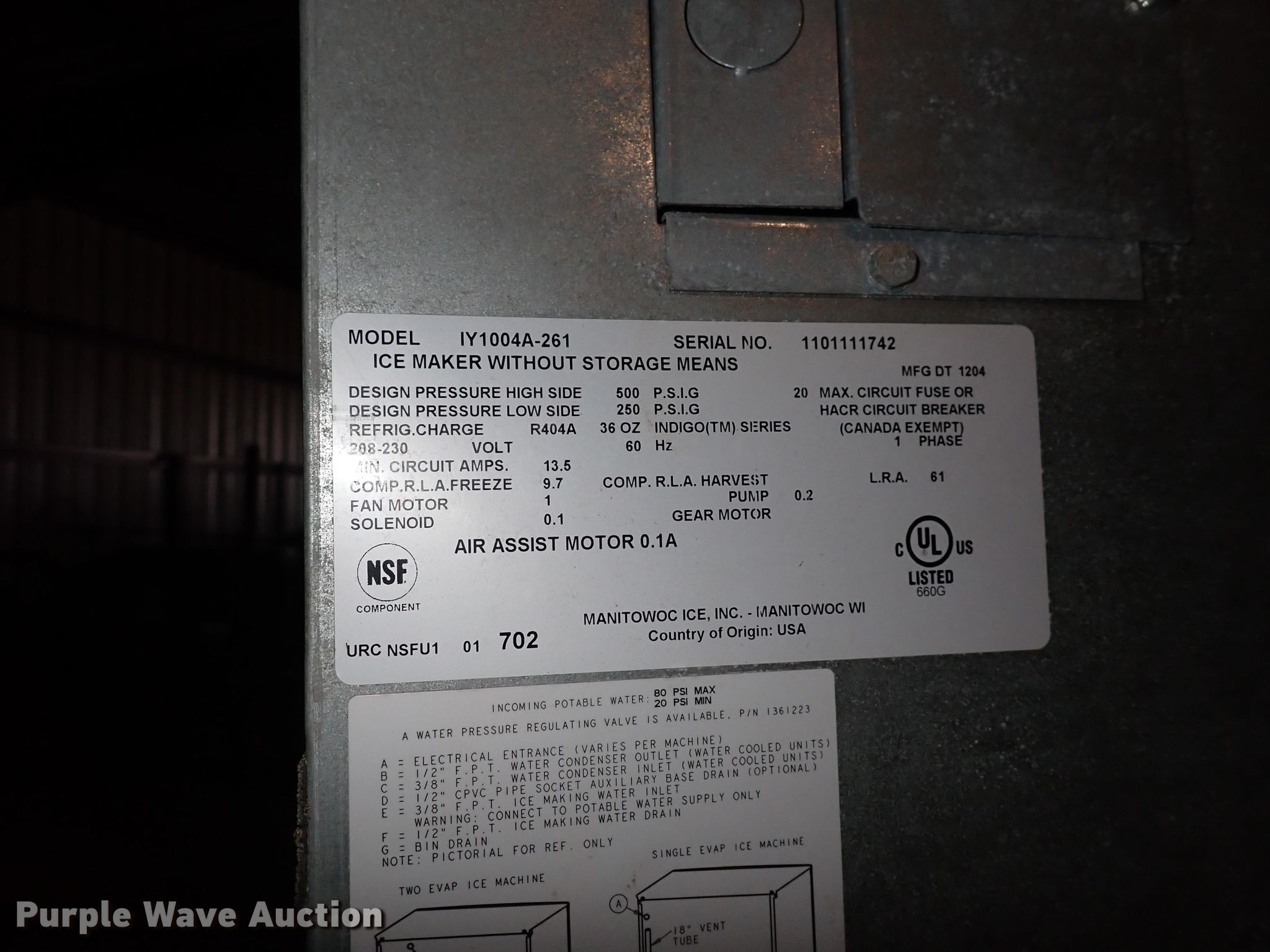 Purple Wave is selling a used Appliances in Kansas. This item is a Manitowoc ice machine with the following: 30" x 35" x 76", 208/230V