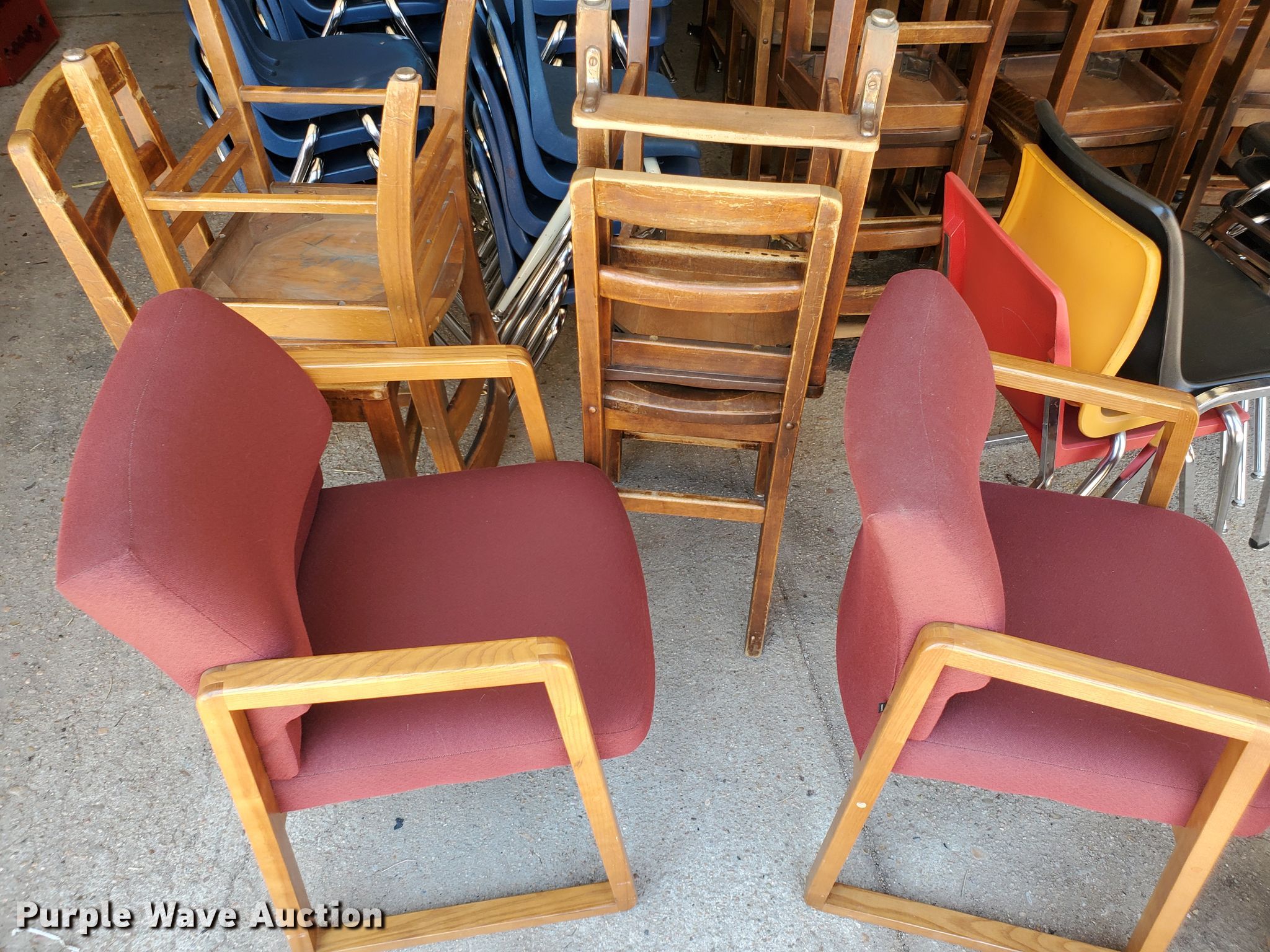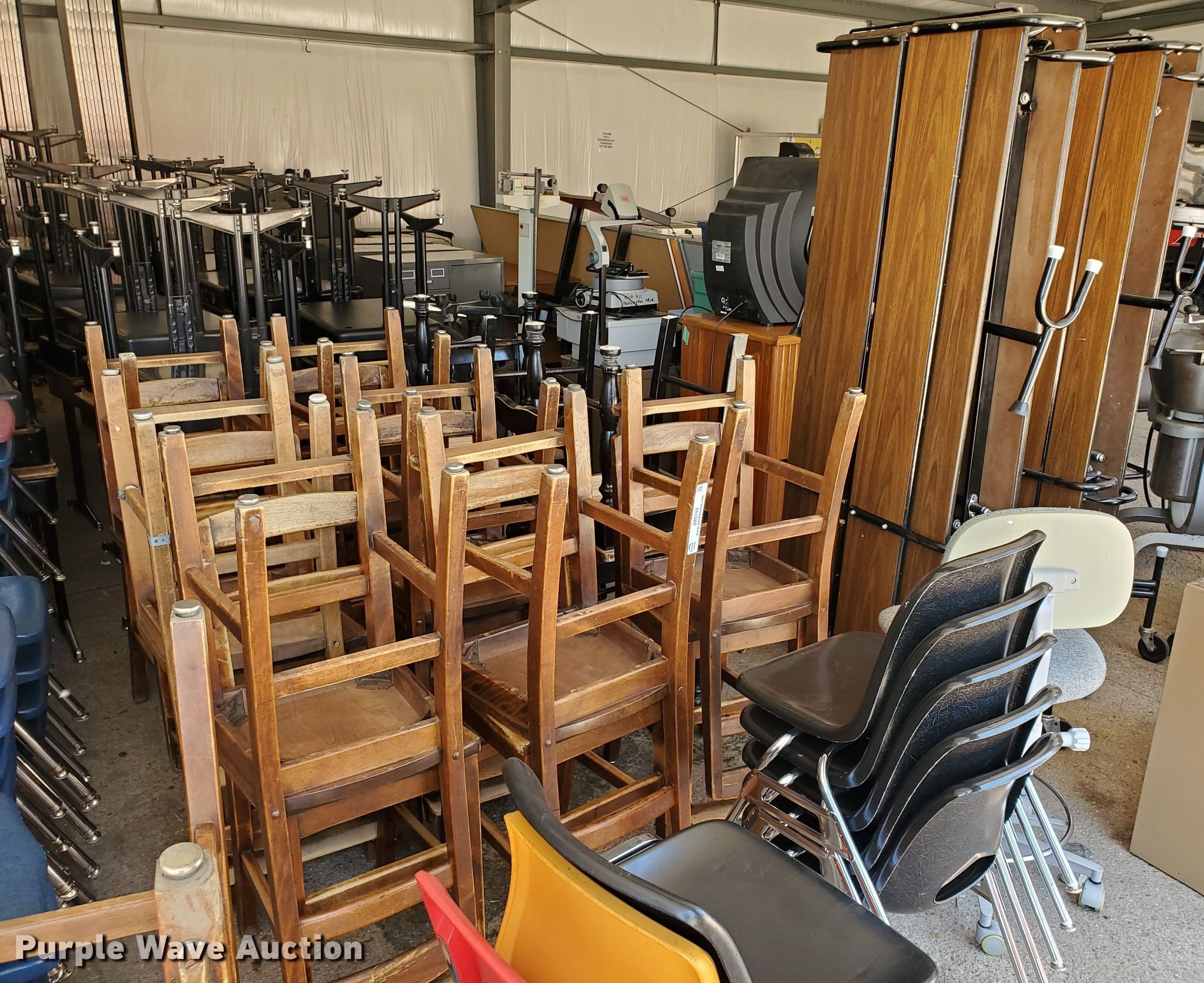 Purple Wave is selling a used Furniture in Kansas. This item is a Furniture with the following: (2) cafeteria tables, Approximately 35 chairs