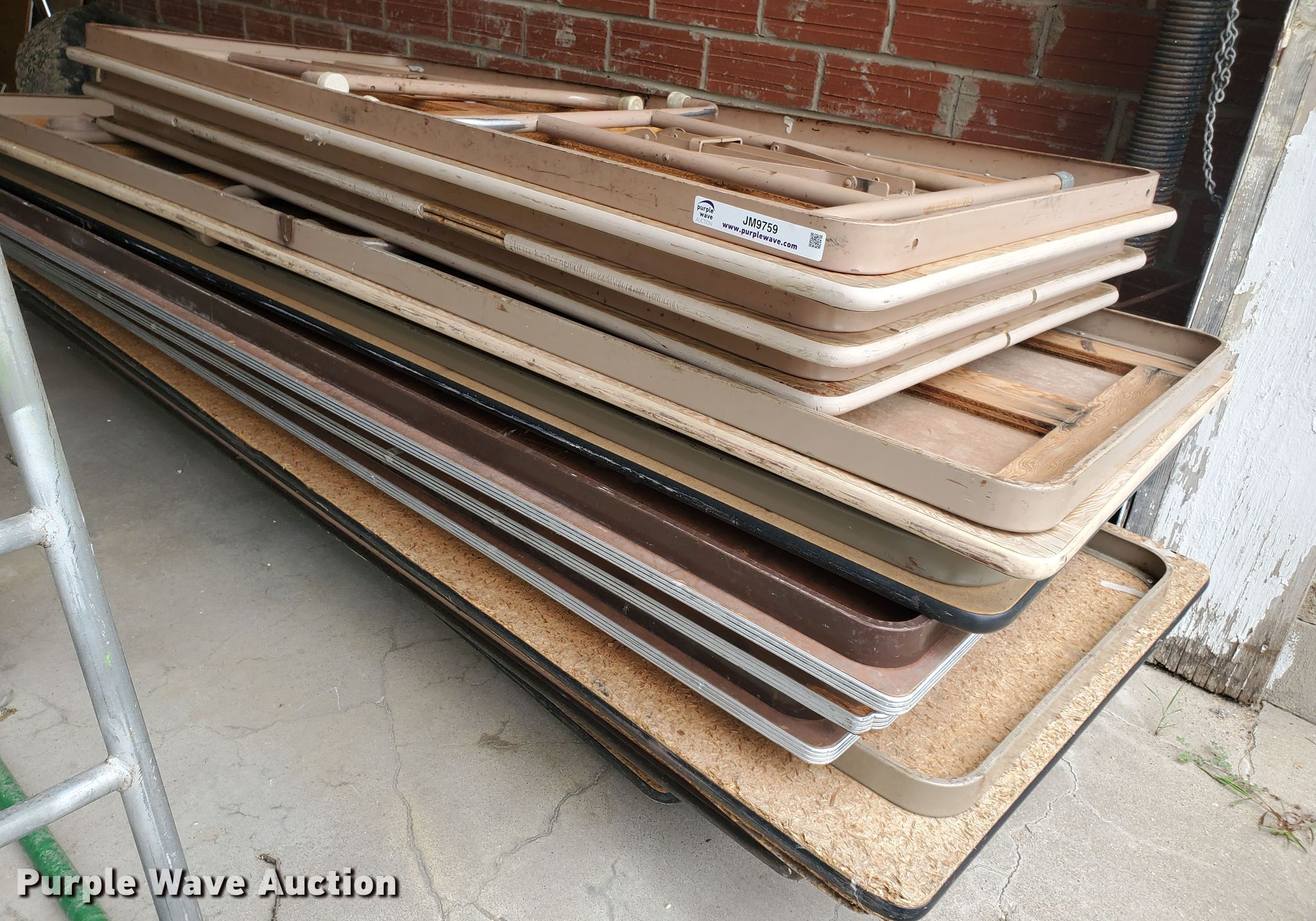 Purple Wave is selling a used Furniture in Kansas. This item is a (13) folding tables with the following: (10) 8'L, (3) 6'L