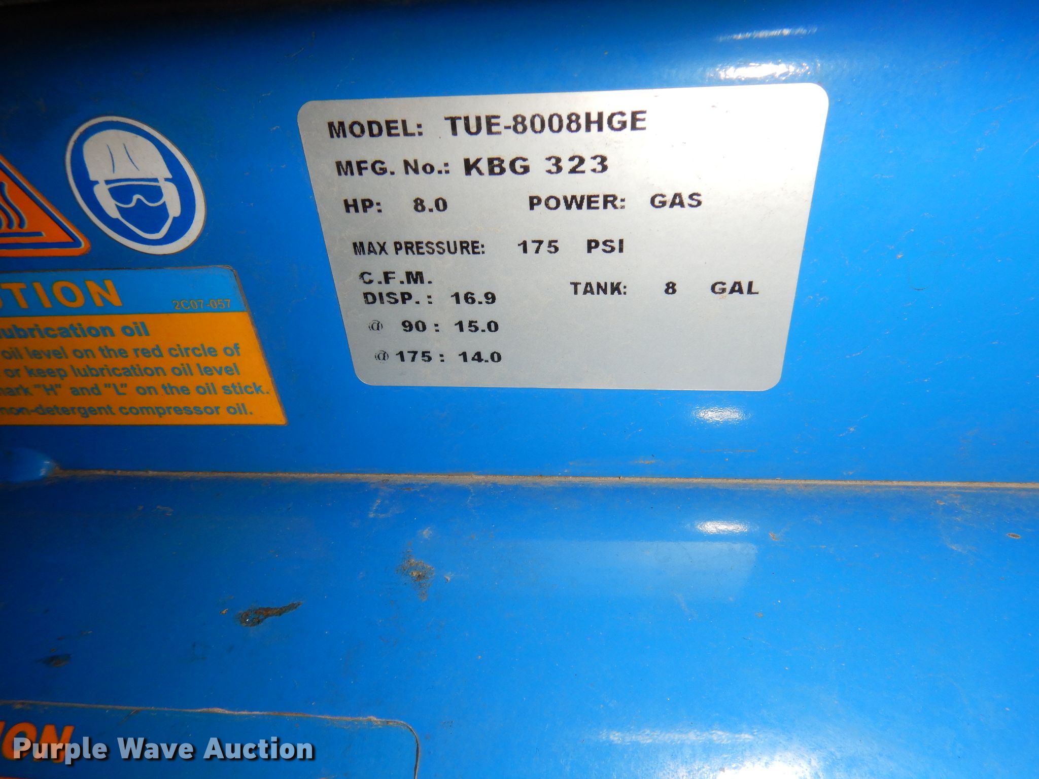 Purple Wave is selling a used Air Compressor in Kansas. This item is a Puma air compressor with the following: Serial: KGB323