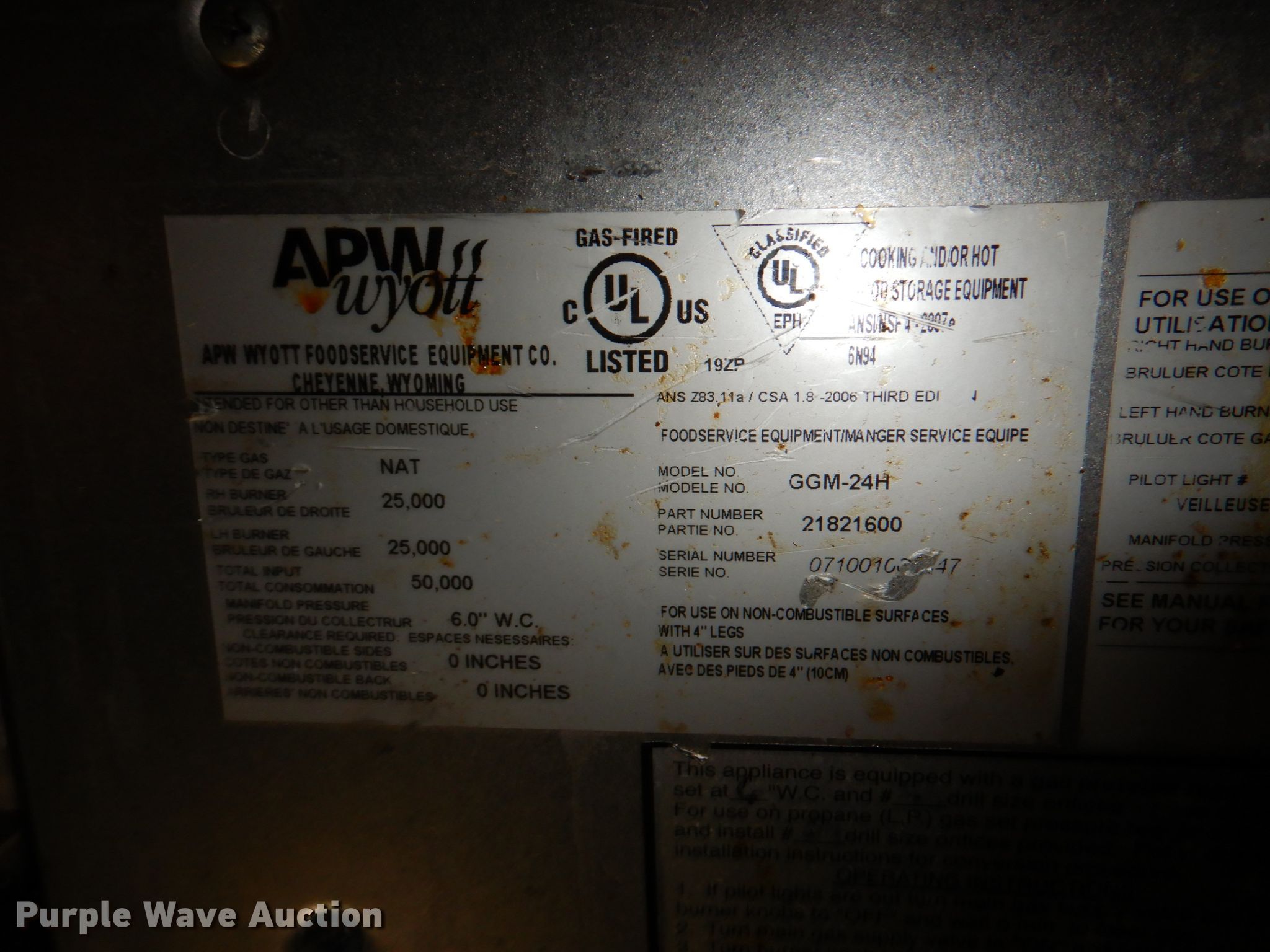 Purple Wave is selling a used Appliances in Oklahoma. This item is a Restaurant equipment with the following: APW Wyott GGM-24H griddle, Natural gas fired, Frymaster fryer, Unknown operating condition