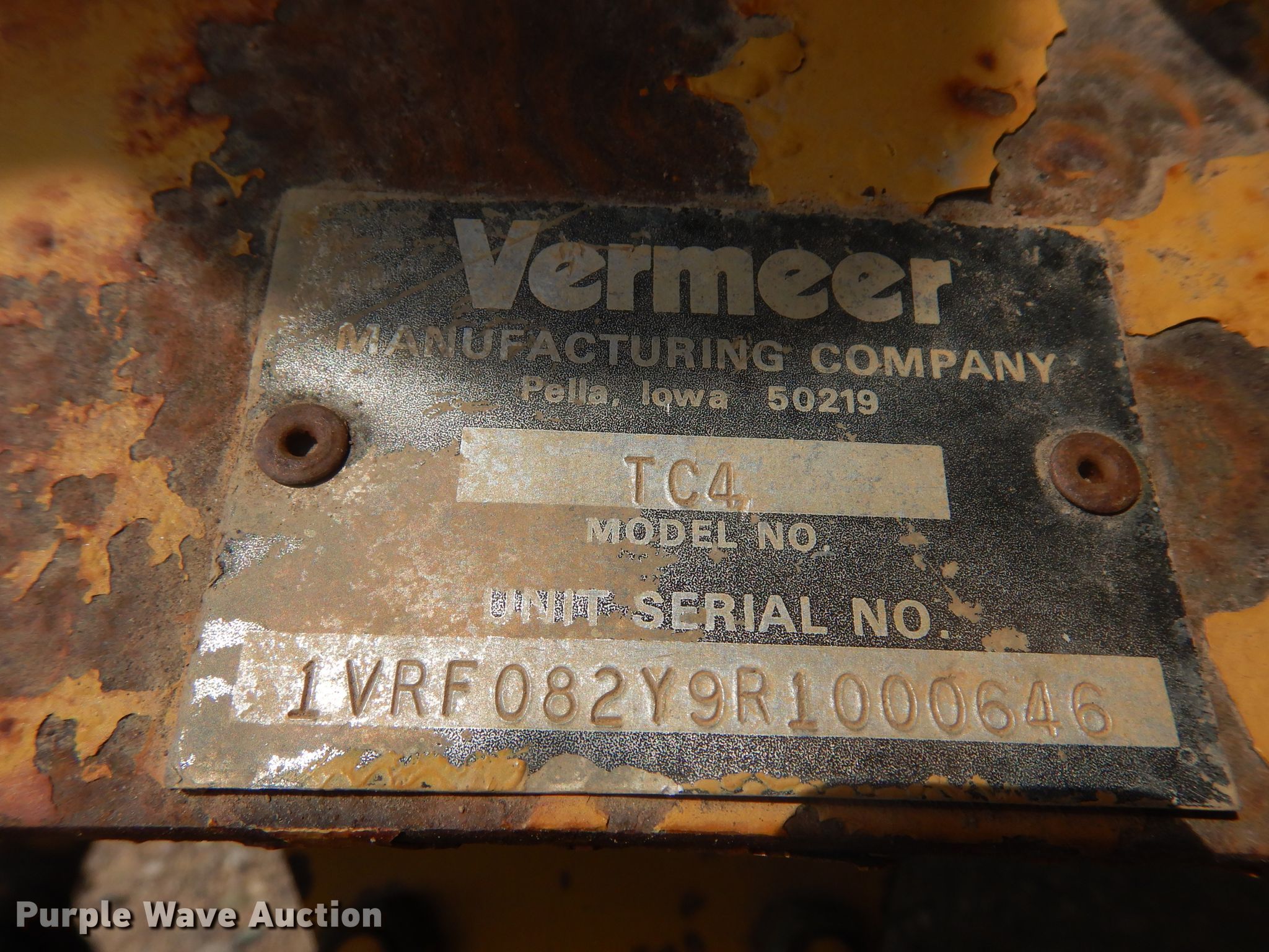 1994 Vermeer TC4 trench compactor. 712 hours on meter, Serial: 1VRF082Y9R1000646. Engine Deutz, Cylinders: 2, Fuel type: Diesel. Transmission Hydrostatic. Operational Vibratory system, Drum: Padfoot Width: 4", Diameter: 40". Gustafson Builders. Rapid City, SD 57703