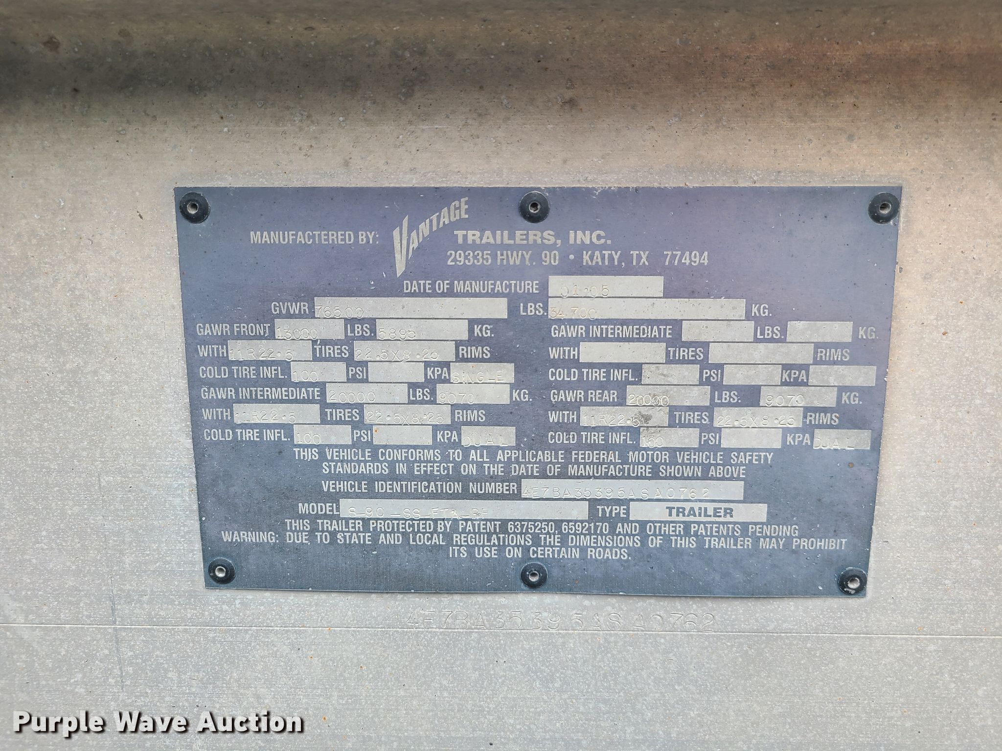 2005 Vantage end dump trailer chasis. Dimensions. Overall: 34' L x 8' W, Chassis width: 42". Chassis Landing gear: Dual, Suspension: Air, Brakes: Air, Axles: Triple, GVWR: 76,500 lbs. Tires Size: 11R24.5. Missouri title. Title distribution may be delayed up to 14 days from verification of funds. 4E7BA35395ASA0762. Scot Heller Trucking. 2845 Southwest Blvd. Kansas City, MO 64108