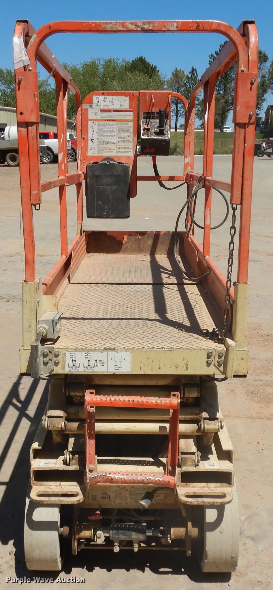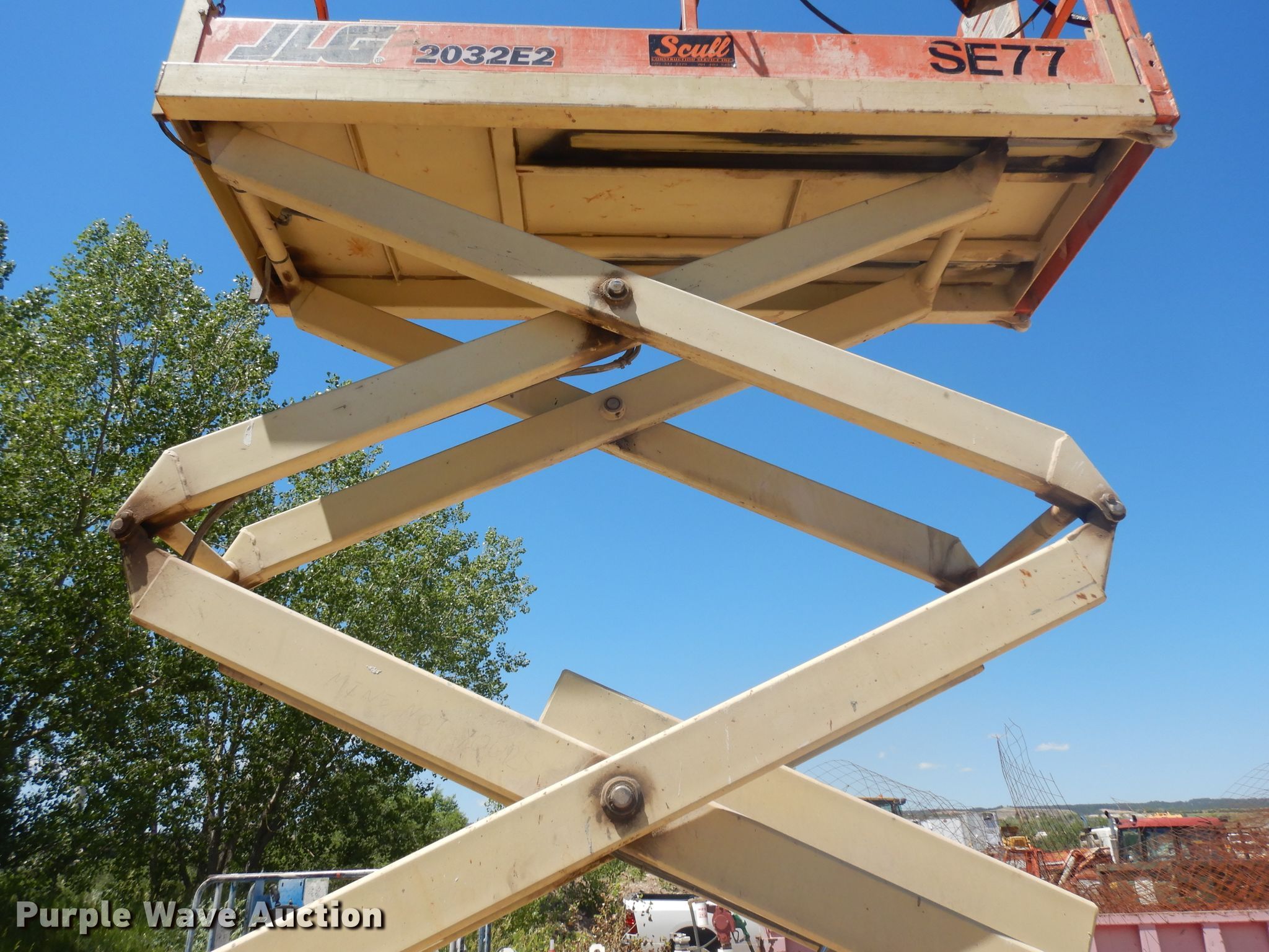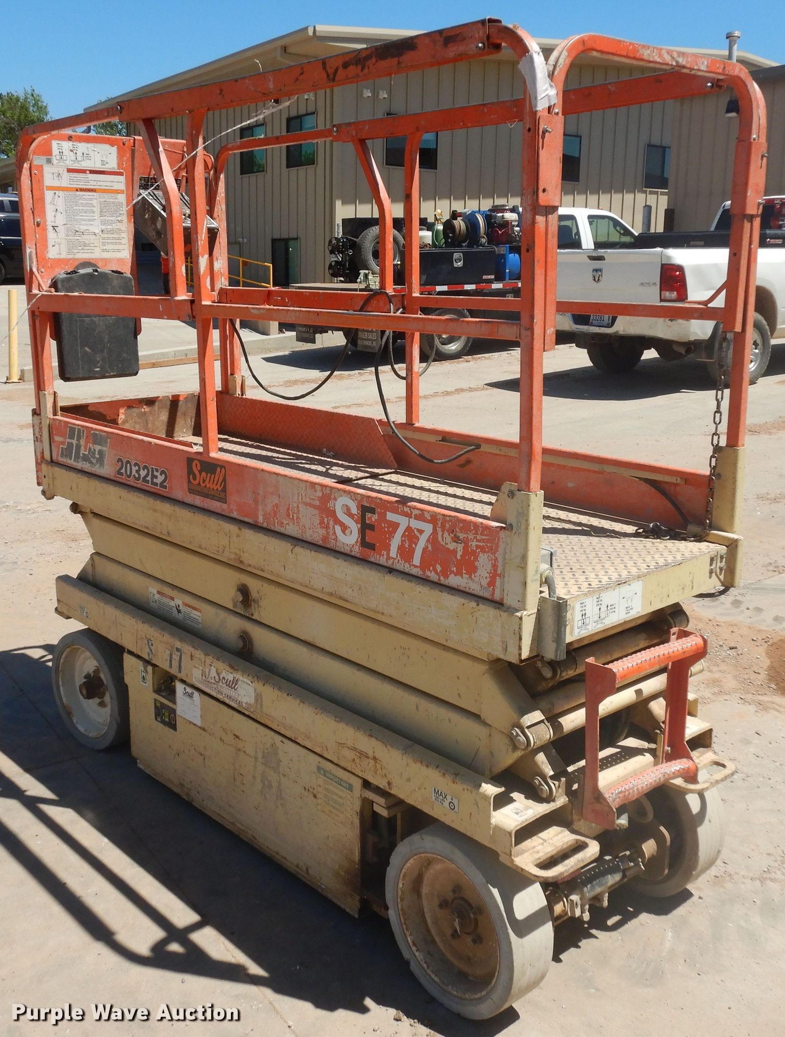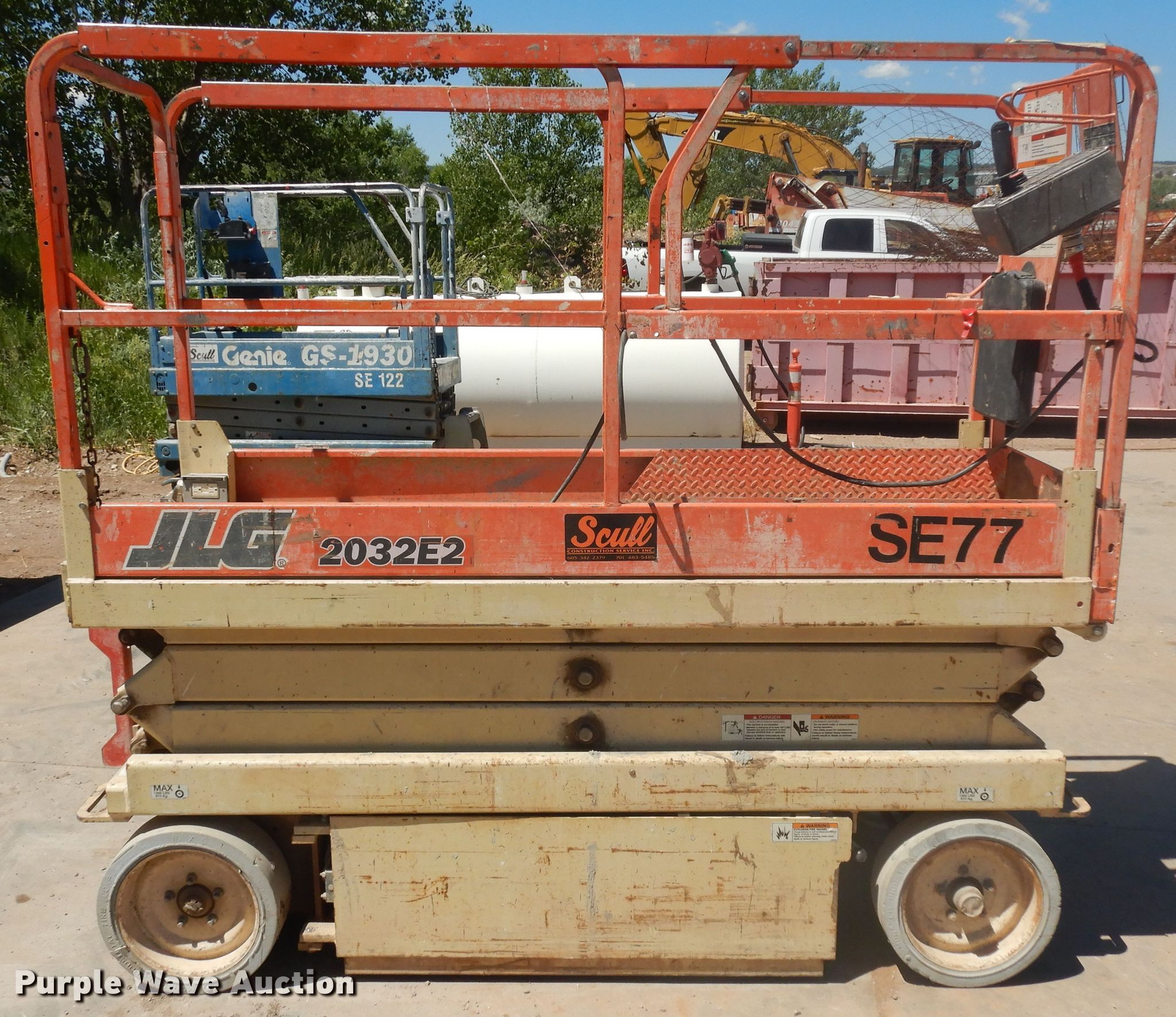1998 JLG 2032E2 scissor lift. 1,036 hours on meter, Serial: 0200045056. Electric Motor Volts: 24. Operational Maximum lift capacity: 750 lbs, Maximum lift height: 20', Platform: 84" L x 30" W, AC power outlet, Controls: Platform, Ground, Platform extensions: Manual. Tires Tire size: 16x5, Solid. Scull Construction Service Inc.. Rapid City, SD 57703