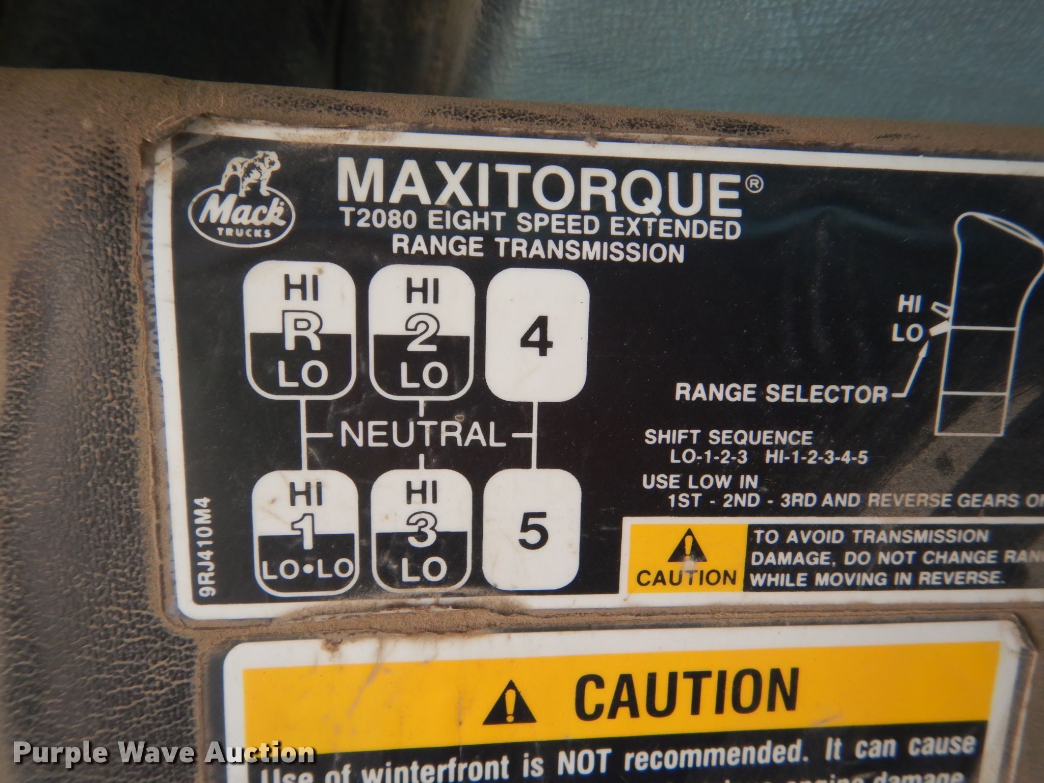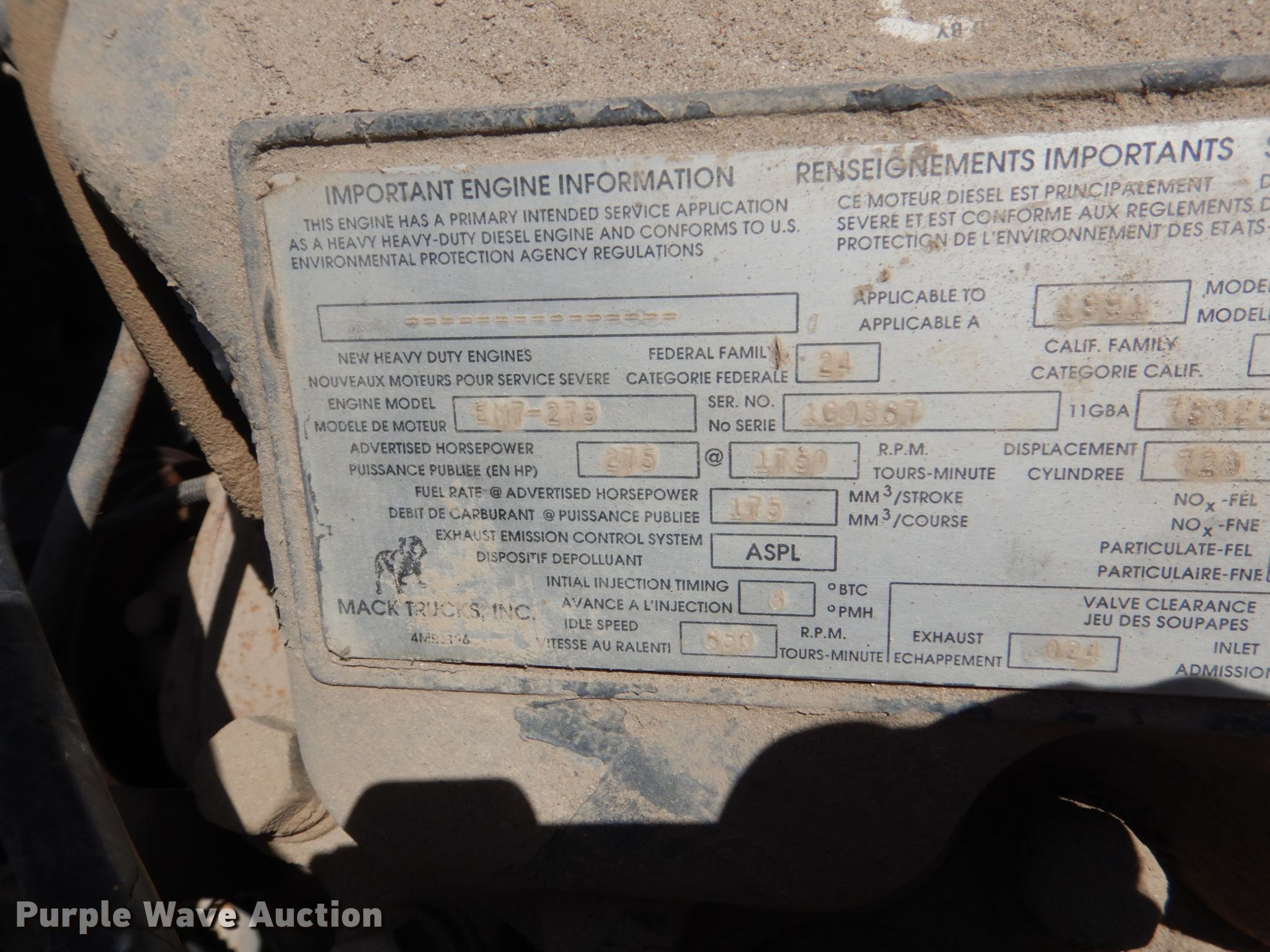 1991 Mack RD690S water truck. 265,733 miles on odometer, Engine hours: 5,789, Unit #: 380002. Engine Mack EM7-275, Displacement: 12.0L, Cylinders: 6, Fuel type: Diesel. Transmission Mack Maxitorque, Manual, Speed: 8. Chassis Axles: Tandem, Suspension: Walking beam, Brakes: Air, PTO. Interior Heat. Operational Bed / tank Capacity: 3,100 gallons, 17' 5" L x 92" W, Water tank Spray bar: Rear, Side discharge, Top fill, Rear outlet: 4 1/2". Tires Front: 425/65R22.5, Rear: 11R24.5. Iowa title. 2M2P289C6MC009607. Knife River Midwest LLC. 2220 Hawkeye Dr. Sioux City, IA 51105