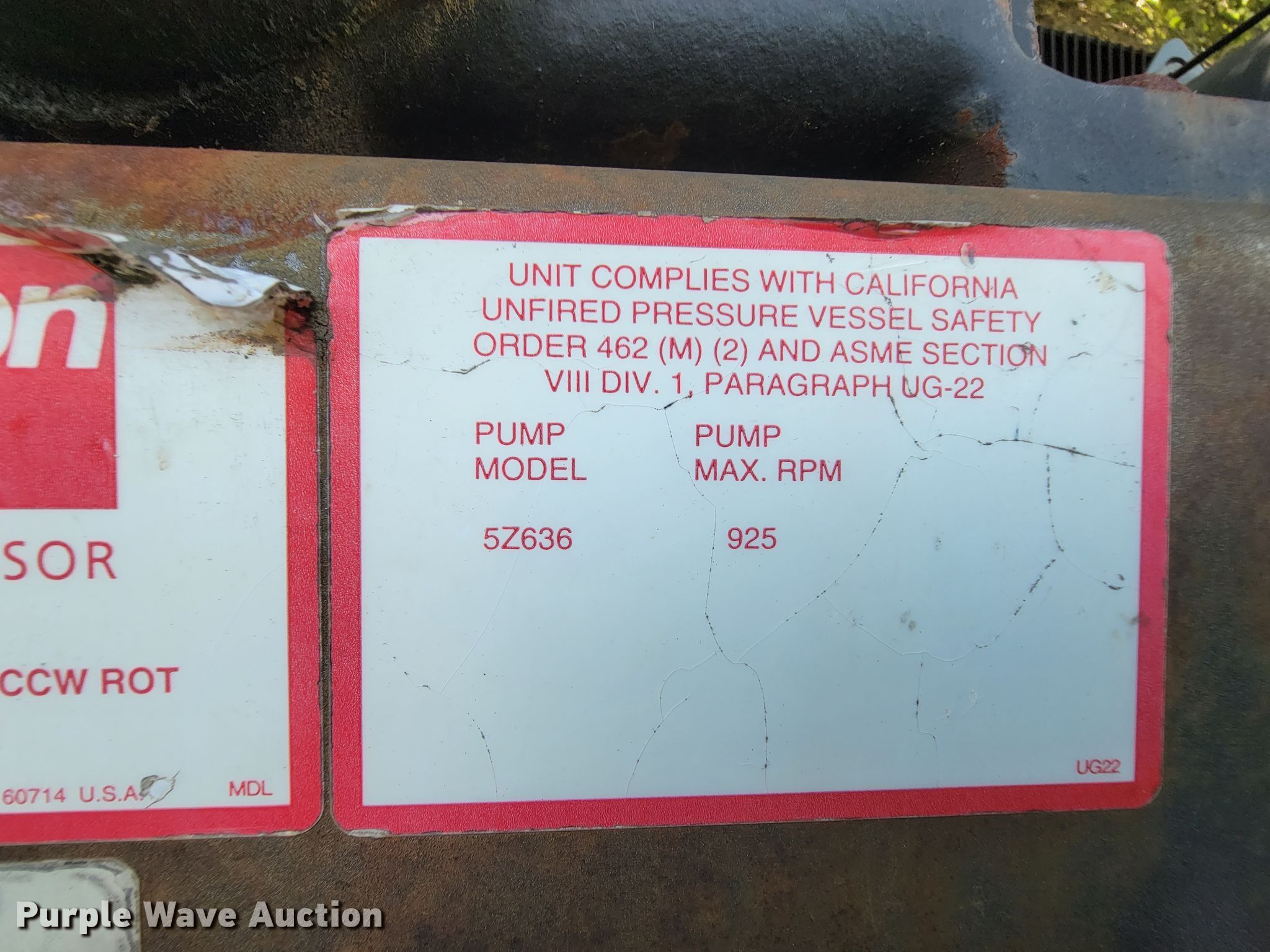 Purple Wave is selling a used Air Compressor in Missouri. This item is a Dayton 5Z634 air compressor with the following: Serial: 4036802